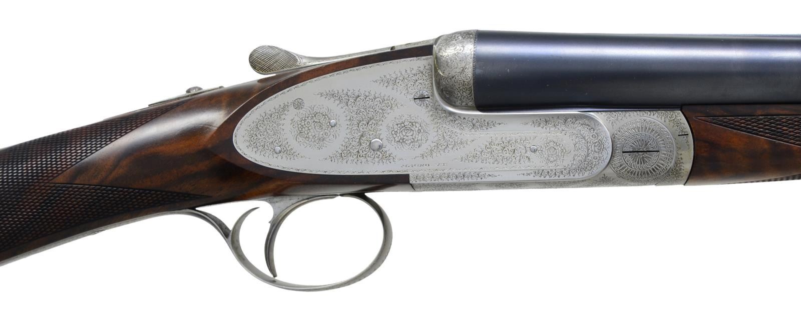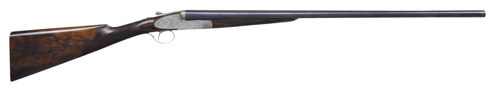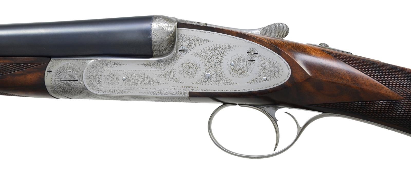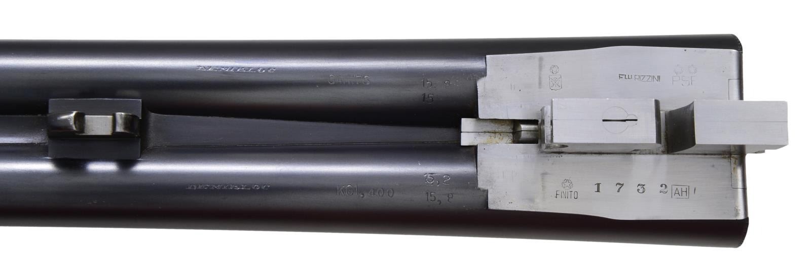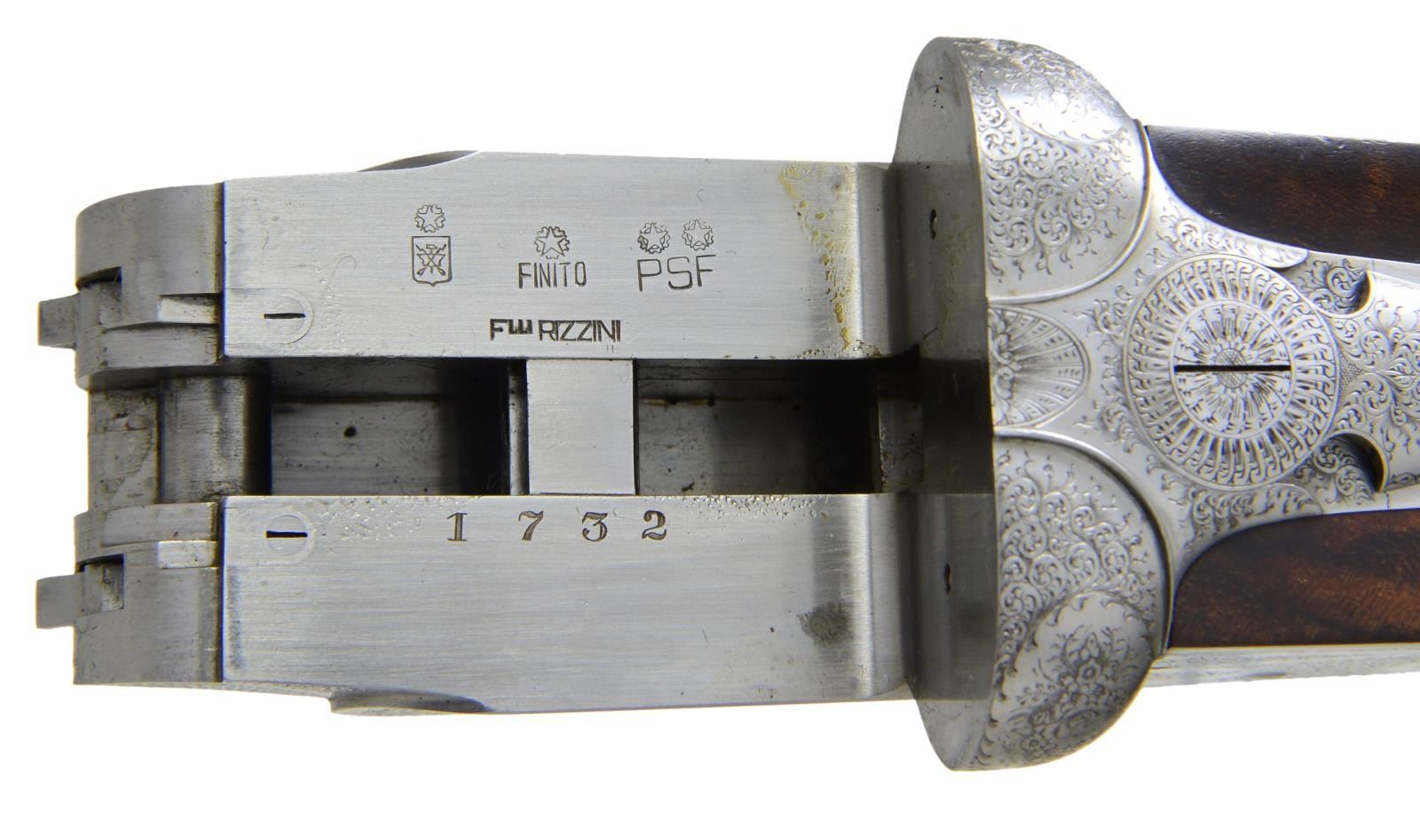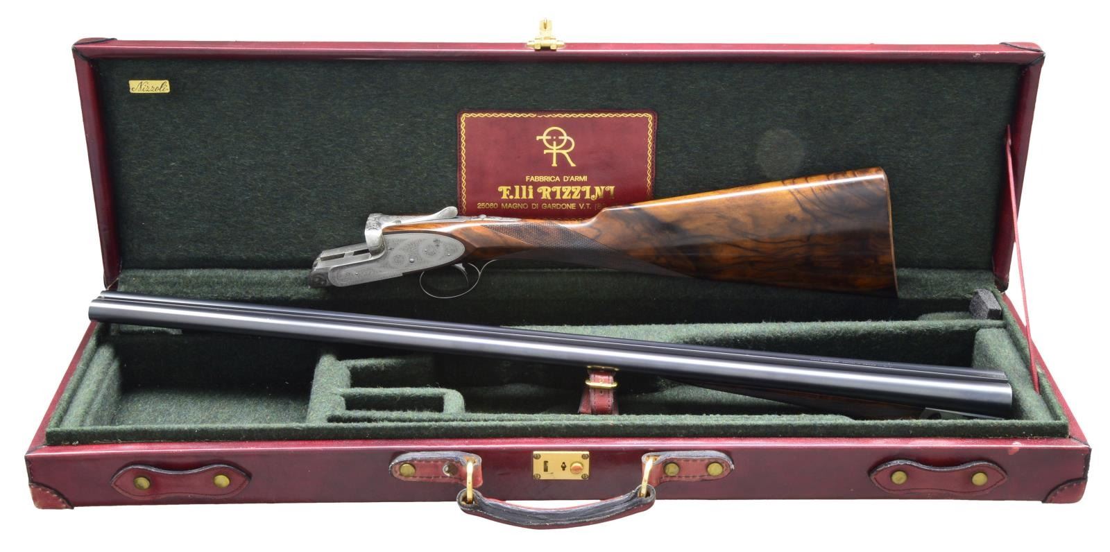 SINGLE TRIGGER HEAVY GAME GUN WITH CASE. Cal. 20 Ga. 3". S# 1732. Filli Rizzini is one of the few remaining "Best" Italian makers. If made today, this gun would cost in excess of $70,000. It was made in 1981, the beginning of the "Golden Age" of Italian gun making and has 29 1/8" very well struck chopper lump barrels engraved "Filli RIZZINI MADE IN ITALY 20 GA 3"" on narrow game rib. Barrel flats are stamped with 1981 Italian nitro proofs for 3" chambers. Coin finished sidelock action features non automatic safety ("SICURA" engraved) and single non selective trigger. Action and lockplates are engraved with very well cut classic English style rose and scroll. Maker's name is at the bottom on each lockplate as well as on bottom of action over "MAGNO-V.T.". Engraver's signature "Walter Patelli" is on trigger plate. Small bow trigger guard is engraved to match, S# is on tang. Very finely marbled and lightly stumped figured European walnut straight grip buttstock measures 14 1/2" over checkered wood butt. Very well cut flat top point pattern checkering is on semi diamond grip. Matching splinter Rizzini patent ejector forend has Anson release. MEASUREMENTS: BBLS: Bore Diameter: L .623". R .623". Restriction: L .034" (full). R .020" (mod). Wall thickness: L .038". R .039". STOCK: DAH: 2 1/16". DAC: 1 3/8". CAST: very slightly cast on. LOP: 14 1/2". WEIGHT: 6 lb. 9 oz. UNATTACHED ACCESSORIES: gun is housed in a brown leather case with stitched leather corners by Nizzoli. Case is lined in dark green felt and has brown leather Rizzini label in lid, and contains a key. CONDITION: very fine with evidence of minimal field use. Appears to have been shot very little, however there are a fair amount of light marks on buttstock as would be found on a gun hunted for a season or so. Checkering also shows light wear. Barrels retain nearly all what appears to be their original blue with some minor rubs. Coin finish remains bright overall. Bores are bright and shiny. Action is tight, barrels on face, ejectors are in time, mechanical trigger works well. Case exterior is fine with some minor marks and rubs, straps and handle are good, interior is also fine. (22-5657/MGM). MODERN. $30,000-40,000.