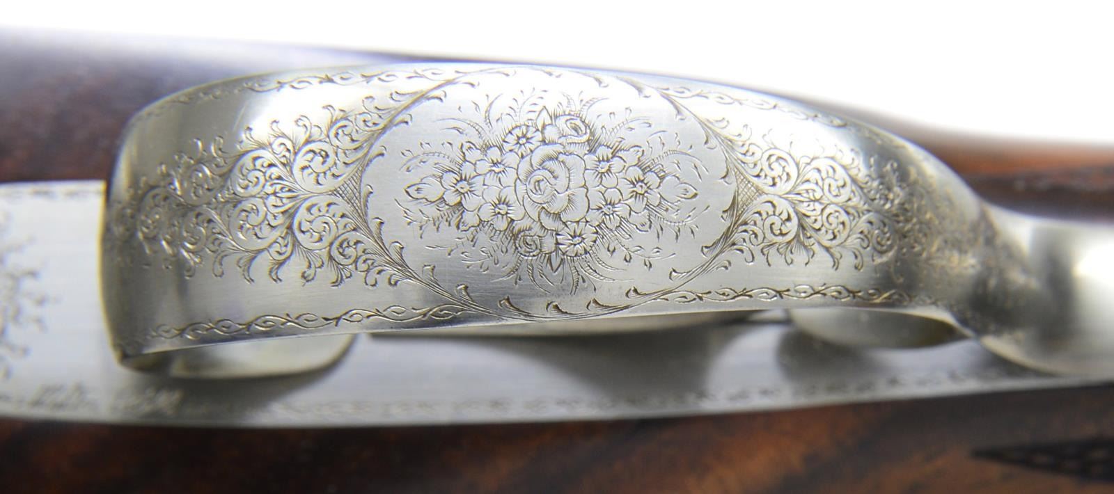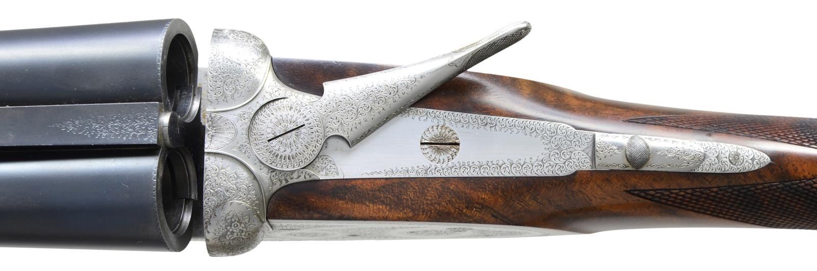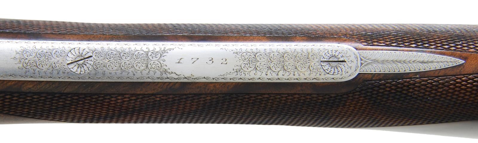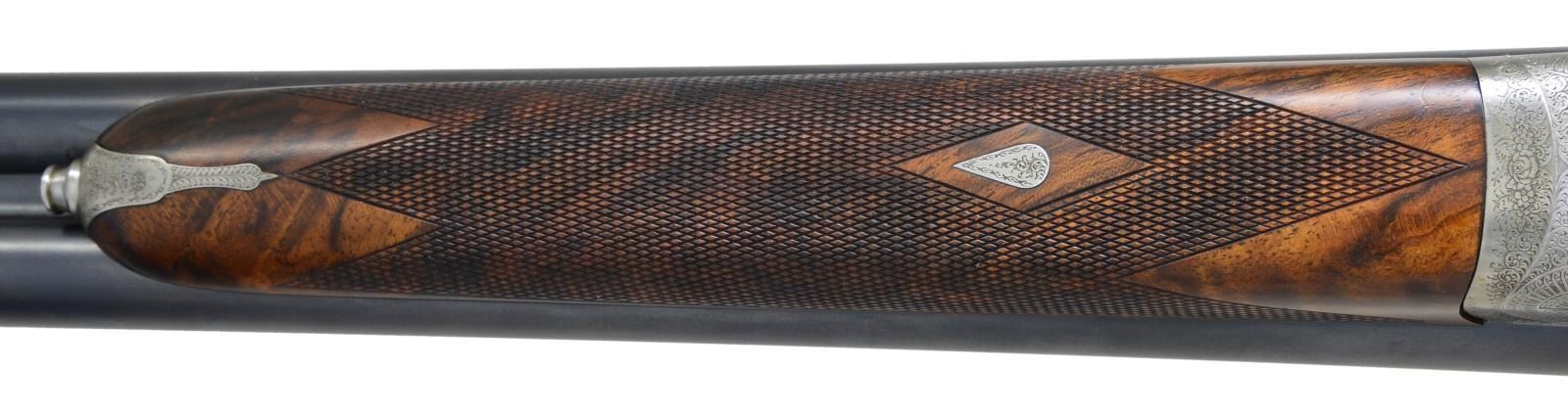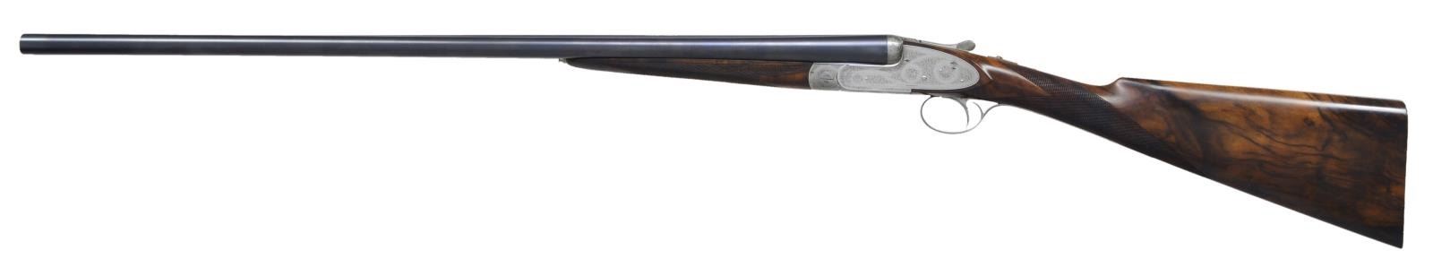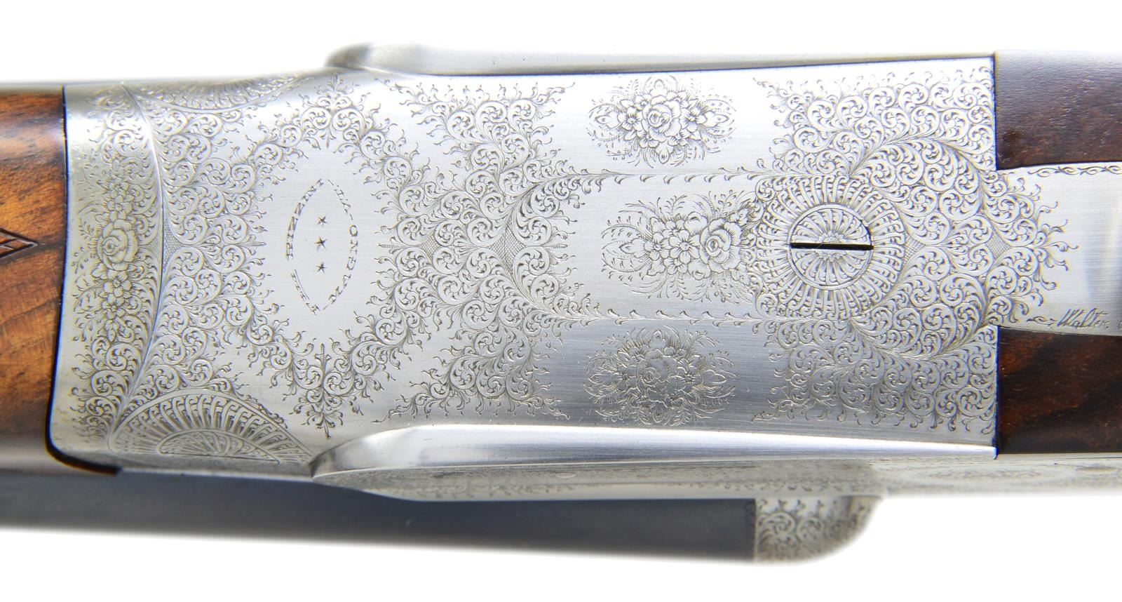 SINGLE TRIGGER HEAVY GAME GUN WITH CASE. Cal. 20 Ga. 3". S# 1732. Filli Rizzini is one of the few remaining "Best" Italian makers. If made today, this gun would cost in excess of $70,000. It was made in 1981, the beginning of the "Golden Age" of Italian gun making and has 29 1/8" very well struck chopper lump barrels engraved "Filli RIZZINI MADE IN ITALY 20 GA 3"" on narrow game rib. Barrel flats are stamped with 1981 Italian nitro proofs for 3" chambers. Coin finished sidelock action features non automatic safety ("SICURA" engraved) and single non selective trigger. Action and lockplates are engraved with very well cut classic English style rose and scroll. Maker's name is at the bottom on each lockplate as well as on bottom of action over "MAGNO-V.T.". Engraver's signature "Walter Patelli" is on trigger plate. Small bow trigger guard is engraved to match, S# is on tang. Very finely marbled and lightly stumped figured European walnut straight grip buttstock measures 14 1/2" over checkered wood butt. Very well cut flat top point pattern checkering is on semi diamond grip. Matching splinter Rizzini patent ejector forend has Anson release. MEASUREMENTS: BBLS: Bore Diameter: L .623". R .623". Restriction: L .034" (full). R .020" (mod). Wall thickness: L .038". R .039". STOCK: DAH: 2 1/16". DAC: 1 3/8". CAST: very slightly cast on. LOP: 14 1/2". WEIGHT: 6 lb. 9 oz. UNATTACHED ACCESSORIES: gun is housed in a brown leather case with stitched leather corners by Nizzoli. Case is lined in dark green felt and has brown leather Rizzini label in lid, and contains a key. CONDITION: very fine with evidence of minimal field use. Appears to have been shot very little, however there are a fair amount of light marks on buttstock as would be found on a gun hunted for a season or so. Checkering also shows light wear. Barrels retain nearly all what appears to be their original blue with some minor rubs. Coin finish remains bright overall. Bores are bright and shiny. Action is tight, barrels on face, ejectors are in time, mechanical trigger works well. Case exterior is fine with some minor marks and rubs, straps and handle are good, interior is also fine. (22-5657/MGM). MODERN. $30,000-40,000.