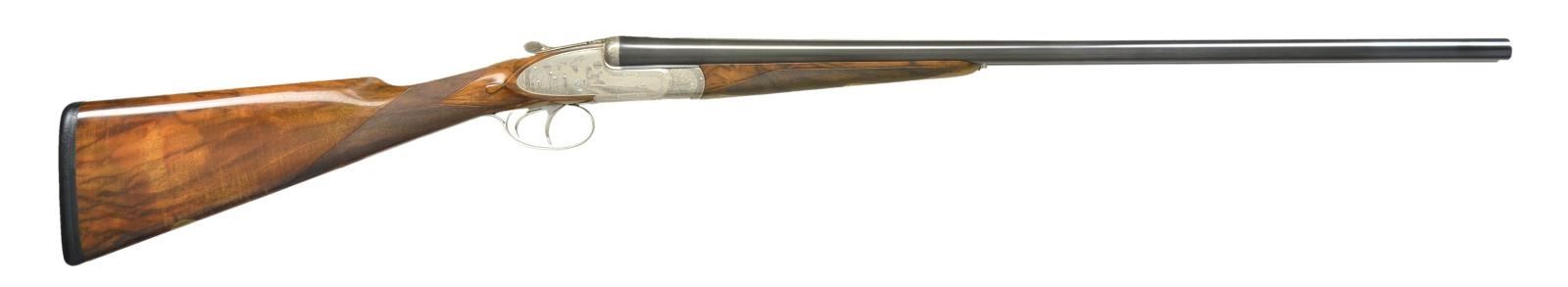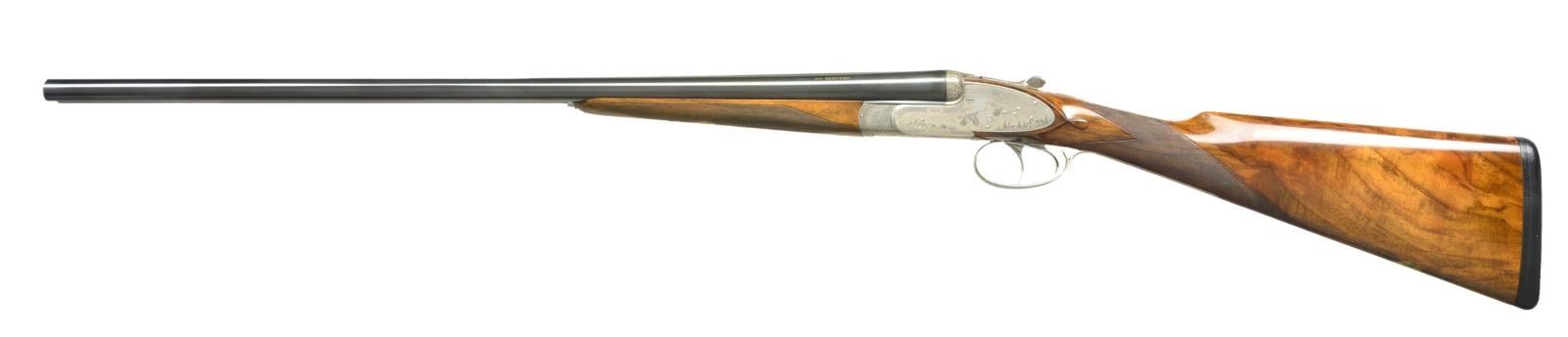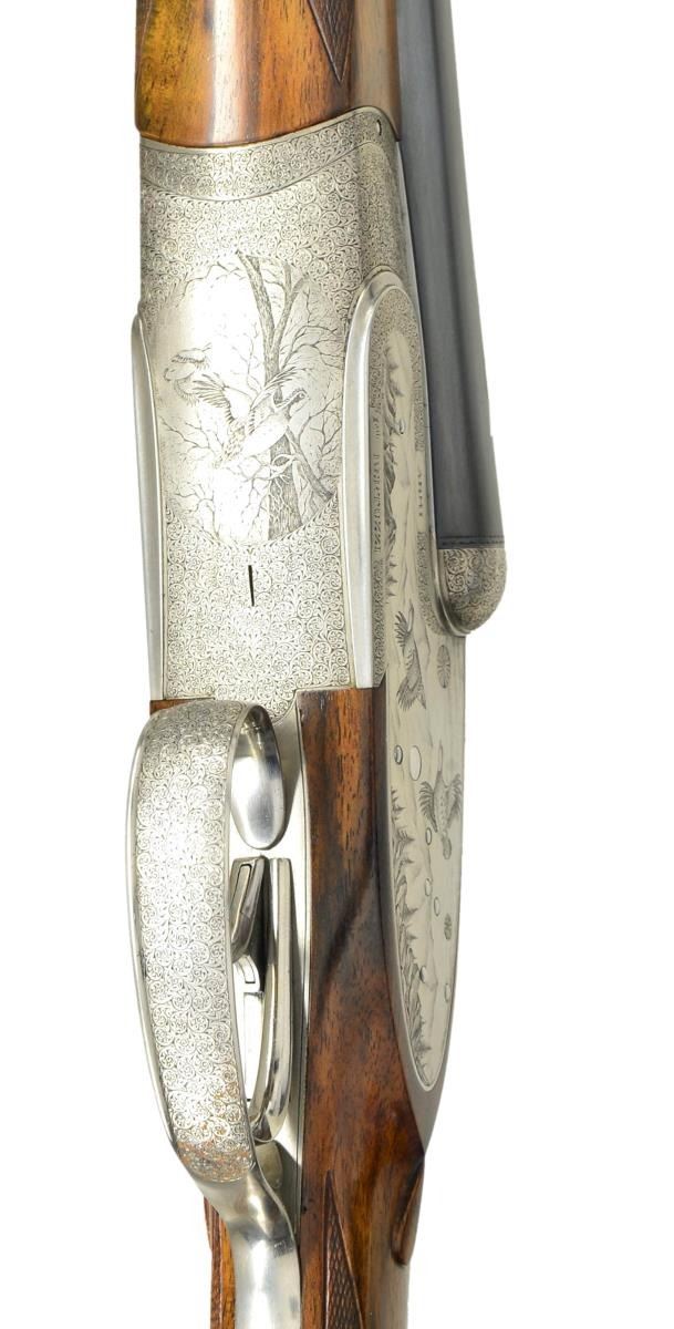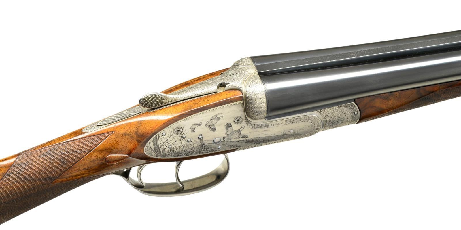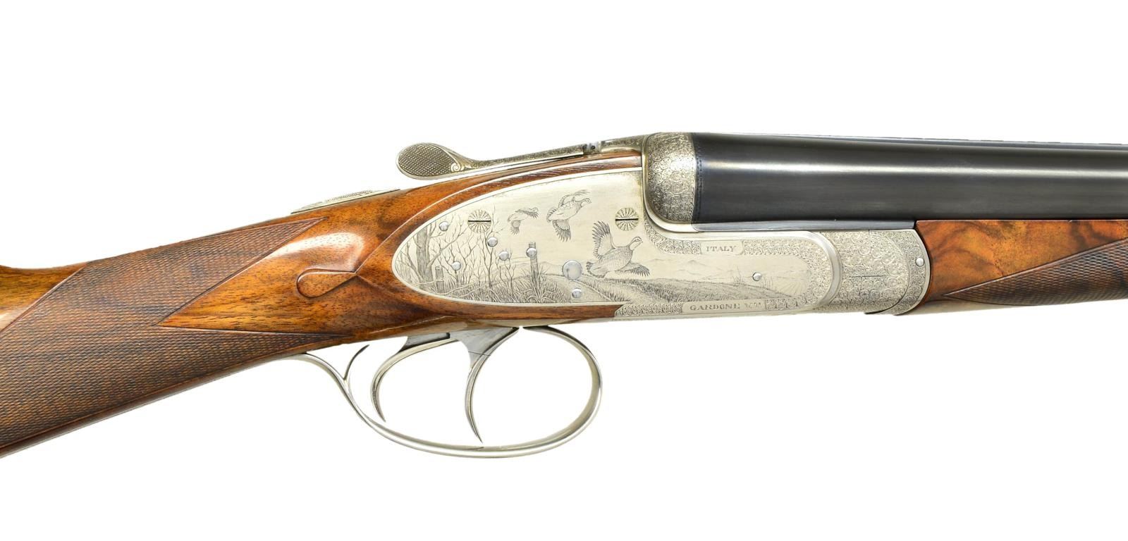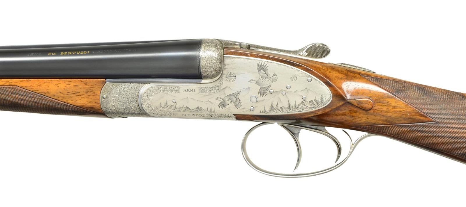 GUN WITH EXCEPTIONALLY FINE GAME SCENE ENGRAVINGS BY DASSA. Cal. 20 Ga., 3" Chambers. S# 5906. Finely struck 26 1/2" chopper lump bbls with flat, narrow, matted rib, are engraved "ARMI Flli BERTUZZI GARDONE V.T. ITALY" on left side of left bbl. Makers name is inlaid in gold. Bbl. flats stamped with 1991 Italian nitro proofs, and with makers name. Bottoms of bbls. with chamber and choke information, are engraved with importers name and address (William Larkin Moore). Coin finished, full sidelock action features non automatic safety, bushed strikers, and double triggers (front articulated). Action is filed with well done beads and fillets and rounded lockplates. Action engraved with near full coverage combination of very well cut miniscule scroll with unengraved areas on beads as counterpoint to truly exceptional Bulino renditions of small game birds in realistic backgrounds with dramatic skies. A pair of chukar partridge fly out of mountainous terrain on left lock, a trio of quail erupt from hedgerow into open cropland on right. Another pair of quail flush through trees on bottom of action. "ARMI Flli BERTUZZI" is on left side of action and "ITALY GARDONE VT" is on right. This exceptional engraving is signed by the well known Dassa brothers on trigger plate with a date of "'91". Top lever and single beaded trigger guard are also engraved with miniscule scroll. S# is on banner at grip. Lightly marbled and nicely figured European walnut straight grip buttstock measures 14 3/4" over black leather covered pad, and features drop points, standard point pattern checkering, and a gold oval on toeline engraved "GWH". Matching splinter ejector forend has Anson release. Central diamond is inlet with gold Bertuzzi crest. MEASUREMENTS: BBLS: Bore diameter: L .622. R .621. Bore restrictions: L .011 (lt mod) R .006 (IC). Wall thickness: L .033. R .037. STOCK: DAH: 2 1/4". DAC: 1 5/16". Weight: 6 lbs. 0 oz. LOP: 14 3/4". CONDITION: excellent, showing evidence of light field use, with a few scattered marks on wood and metal, most noticeably a light scratch under one partridge on left lockplate and some other light marks on butt and forend. Forend finish shows light wear, and some smoothing of checkering from hand wear. Bores are excellent. Action is tight. Bbls. are on face. Ejectors are strong and in time. These beautiful guns will never be made again as the Bertuzzi brothers retired many years ago. (22-5630/MGM). MODERN. $12,000-18,000.