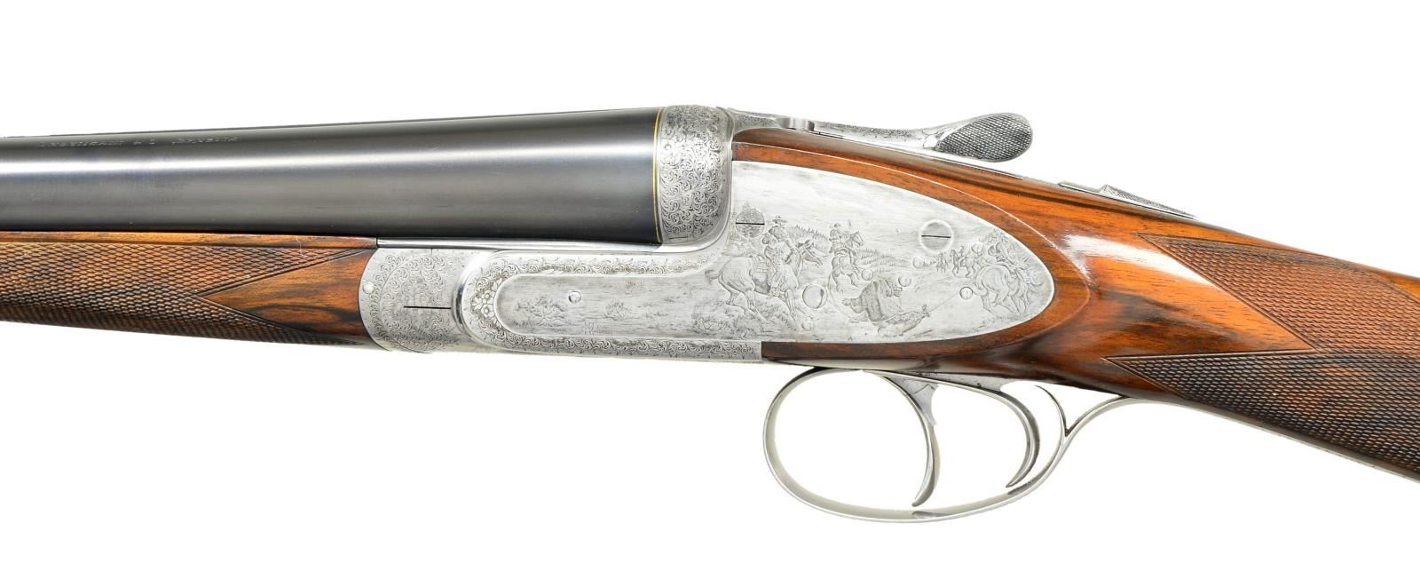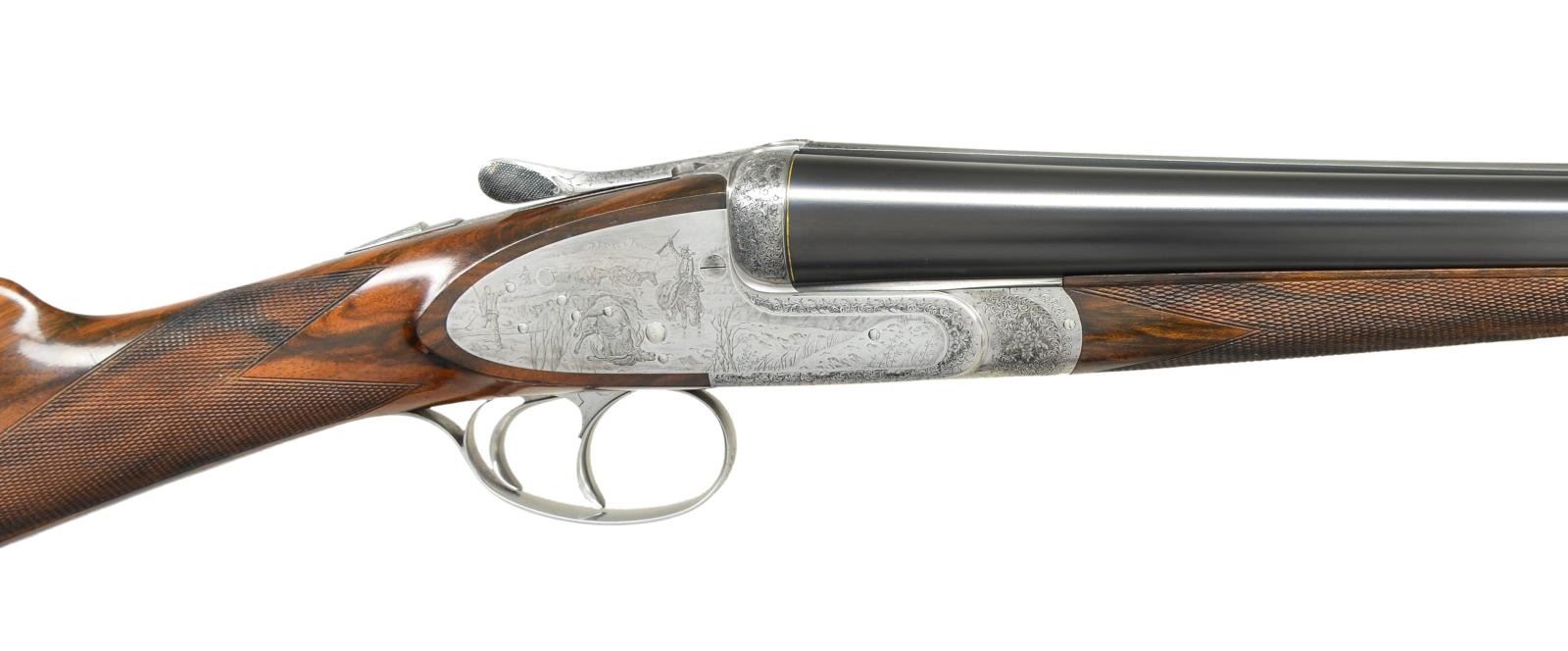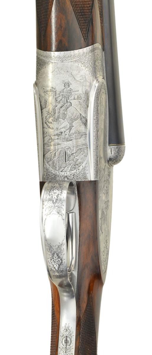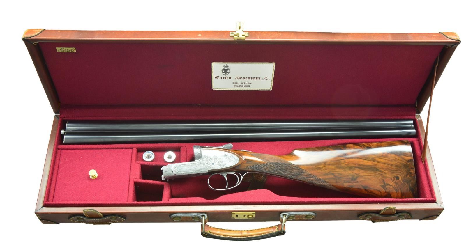 Cal. 12 Ga. 2 3/4". S# 0082. People "in the know" sit up and take notice when a gun by Enrico Desenzani is mentioned. He made approximately ten bespoke guns per year, all of the highest quality. Like Ivo Fabbri, a good portion of his production was for O/U pigeon and other target guns. His game guns are truly sublime. This wonderful light 12 bore game gun has 26 3/4" chopper lump barrels fitted with slightly swamped game rib. "Desenzani & C. Brescia" is engraved on top of left barrel. There are very fine gold lines at breech ends of barrels. Barrel flats are stamped with 1984 Italian nitro proofs for 2 3/4" chambers, along with serial number, "DE" logos, and importers name and address (BSA NY Millbrook). Coin finished round bodied sidelock action features non-automatic safety (SIGURA engraved), bushed strikers, and double triggers (front articulated). Action is engraved with 70% coverage exceptionally well cut small scroll with floral highlights. Rounded lockplates are not engraved with scroll and scenes extend to the edges. Lockplates and bottom of action portray intricately detailed and wonderfully shaded Bulino 19th century western hunting scenes, after Frederic Remington. Left lock has a famous action packed scene of three mounted hunters lassoing and subduing a grizzly bear. One has roped the bear by the back leg, another has charged in and is about to encircle the bear with his lasso. Another rider in distance, hat blowing off in the wind, is turning his mount in preparation to further ensnare the beast. Two other riders, in the distance, are watching the proceedings. This action takes place in an open meadow with dramatic clouded sky in background. Right lockplate portrays triumphant mounted hunter, rifle being held high, approaching another hunter on foot, doffing his hat, with fallen elk in foreground. A string of pack horses is in the background. This scene takes place in open western highlands with mountain peaks in background. Bottom of action is engraved with scene of mountain man on horse riding along stream bed with mesa in background. Both lockplate scenes are signed "Galeazzi" (the very highly regarded late Angelo, who specialized in fine Bulino scenes). This particular work could be considered a masterpiece. Scroll continues onto single beaded trigger guard bow and tang, which has serial number in gold. Buttstock of wonderfully marbled, somewhat burl figured flesh toned European walnut measures 14 1/8" over fully skip line checkered wood butt. Well cut point pattern checkering is on semi-diamond hand. Matching splinter ejector forend with Anson release has gold Desenzani crest inlet on central uncheckered diamond. MEASUREMENTS: BBLS: Bore Diameter: L .727. R .726. Restriction: L .038 (extra full). R .016 (mod). Wall thickness: L .020. R .025. STOCK: DAH: 1 15/16". DAC: 1 1/4" plus. CAST: about 1/4" off. LOP: 14 1/8". WEIGHT: 6 lb. 8 oz. UNATTACHED ACCESSORIES: Gun is housed in brown leather case by Nizzoli. Case is lined in burgundy cloth, and has white leather Desenzani label stitched into lid. Bottom compartment is semi-French fitted for barrels and action, and contains a pair of snap caps. CONDITION: very fine, with evidence of only very light field use with only a scattering of light marks on butt. Coin finish is very fine with only a hint of darkening on sides and fences. Bores are very fine without any visible imperfections. Mechanically fine. Case is very fine with only a very few light marks on exterior. Interior is fine. (22-5665/MGM). MODERN. $15,000-20,000.