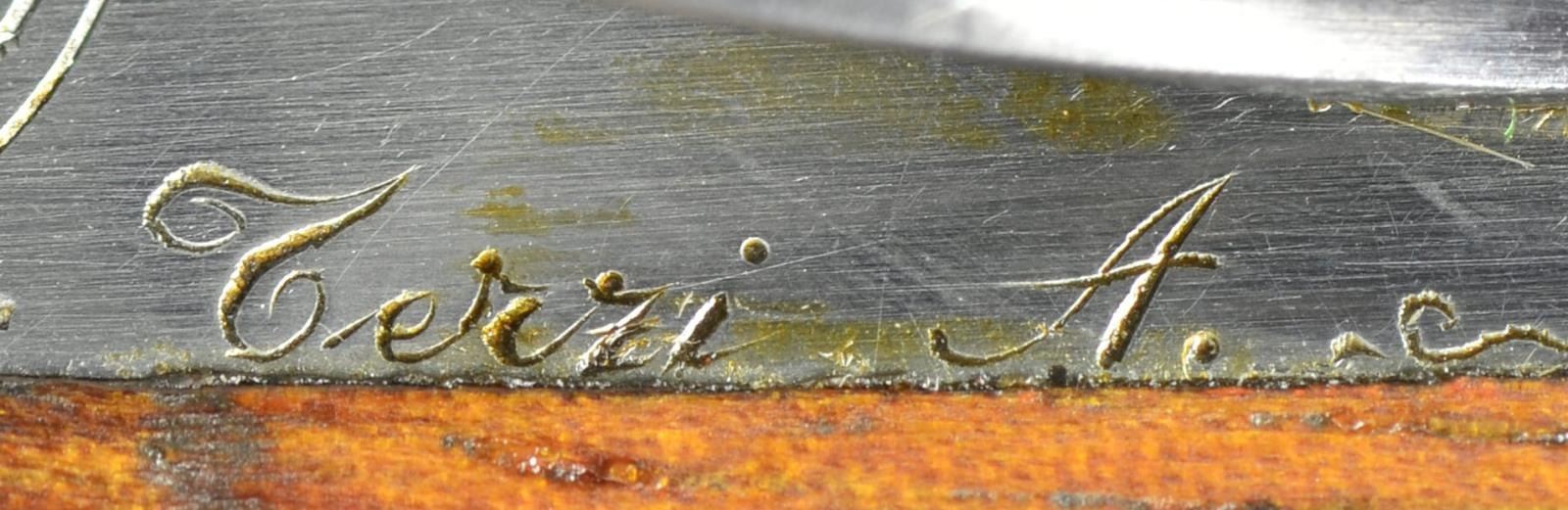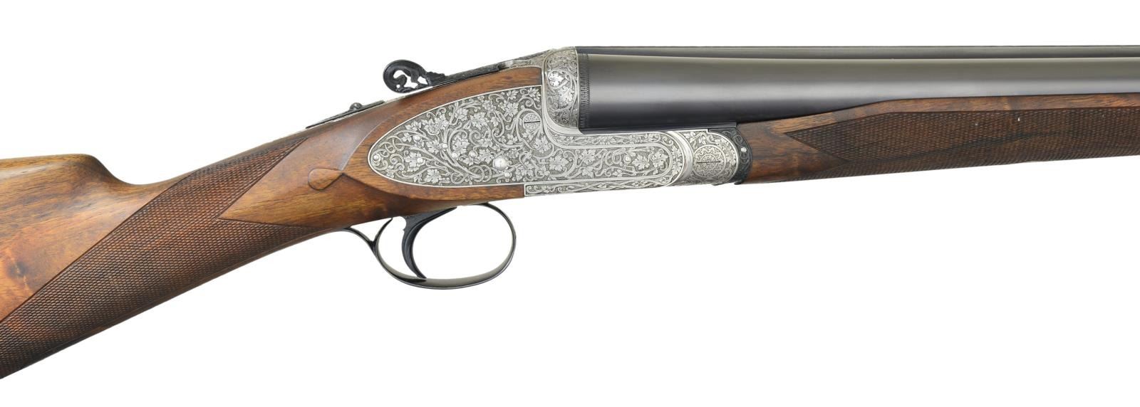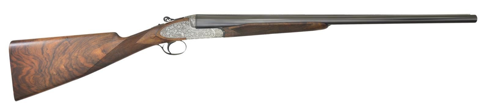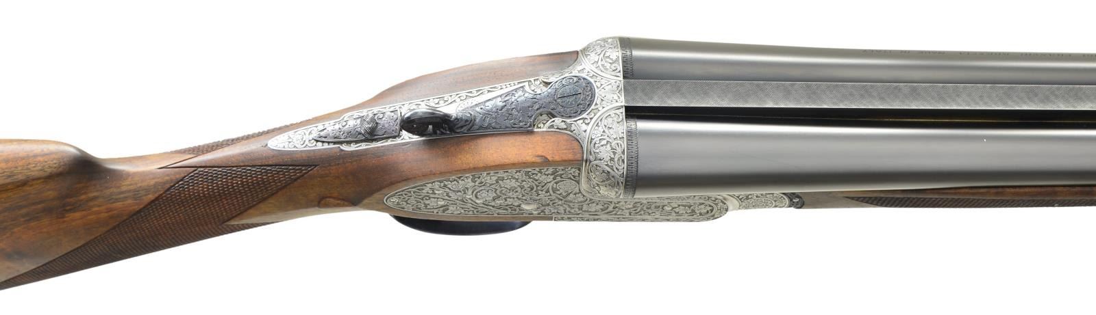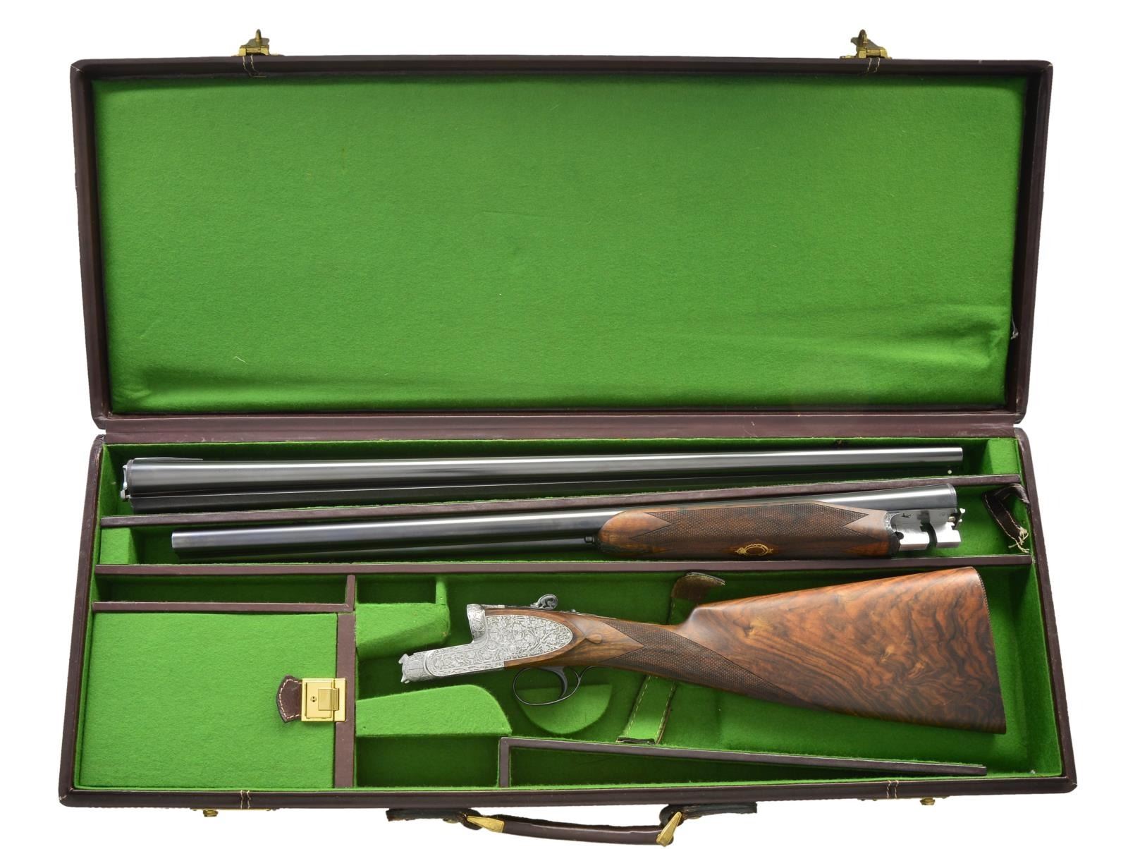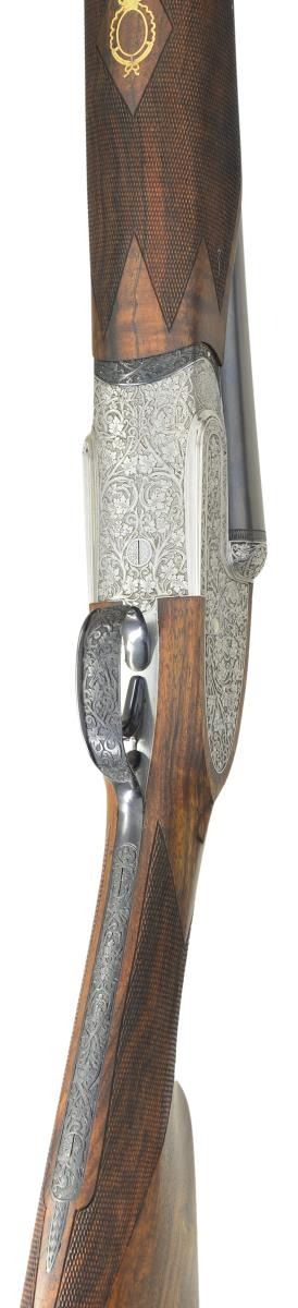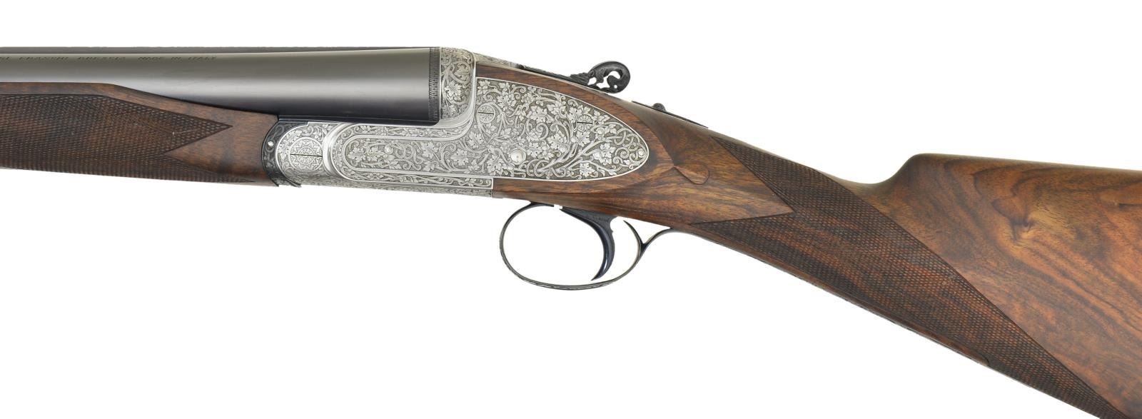 SIDELOCK EJECTOR SINGLE TRIGGER SHOTGUN WITH EXTRA BARRELS AND CASE AND FINE SEMI RELIEF ENGRAVING BY TERZI. Cal. 12 Ga., 2 3/4". S# 15056 (1981). The top of the Franchi line, this fine gun is supplied with 2 sets of chopper lump barrels; one measuring 25 5/8", the other 27 7/8". Both are fitted with slightly raised matted game ribs holding white beads. Left barrels are engraved "S.P.A. LUIGI FRANCHI BRESCIA MADE IN ITALY". Barrel flats are stamped with 1981 Italian nitro proofs for 2 3/4" chambers along with Franchi logos. Bottoms of barrels are stamped with steel type (Boehler Antinit). Coin finished sidelock action with model and proofs stamped on watertable features non automatic safety, bushed strikers and single non selective trigger by Fabbri. Action is engraved with full coverage, very finely cut and shaded tangle of branches, cinqfoil leaves and scroll. Engraver's signature "Terzi A" is on trigger plate. Top lever thumb piece is pierced and sculpted in the form of a crouching gargoyle. Top lever, safety, trigger and single beaded trigger guard are blued. Engraving that matches action are on all parts except trigger. Straight grip buttstock of intricately marbled and burl figured European walnut measures 14 1/8" over checkered wood butt. Stock features drop points and point pattern checkering on semi diamond hand. Matching beavertail ejector forend with Anson release has gold "Imperial Monte Carlo" crowned devise inlet into central uncheckered diamond. MEASUREMENTS: 25 5/8" BBLS: Bore Diameter: L .725". R .727". Restriction: L .008" (IC). R .008" (IC) Wall thickness: L .030". R .030". 27 7/8" BBLS. Bore Diameter: L .729". R .729". Restriction: L .040" (Extra Full). R .024" (Mod). Wall thickness: L .032". R .029". STOCK: with 27 7/8" bbls. DAH: 2 1/4". DAC: 1 1/2 plus", CAST: about 3/16" off. LOP: 14 1/8" WEIGHT: 7 lb. 8 oz. UNATTACHED ACCESSORIES: gun is housed in its original dark brown leather case lined in green felt, which contains instruction book, guarantee card and bags for action and both sets of barrels. CONDITION: exceptionally fine, essentially unfired since proof. Retaining nearly all original finishes on wood and metal. There are some assembly scratches on short barrel set and forend iron. Gun presently will not fire, most likely due to congealed oil in locks. Top lever, extractors, etc. have needed Kroil to be freed up. Case leather has a fair number of scratches and scuffs. Interior felt is good. A new Imperial Monte Carlo Extra as presently made by Beretta sells for over $145,000 with one barrel set. This is a very fine gun. (22-5658/MGM). MODERN. $10,000-20,000.