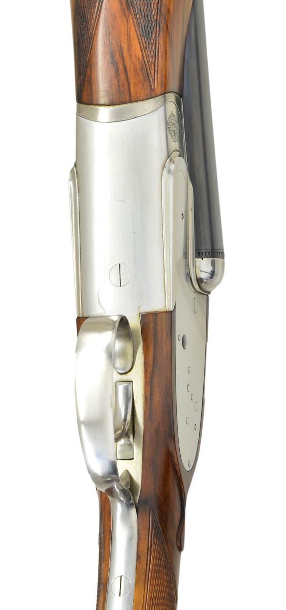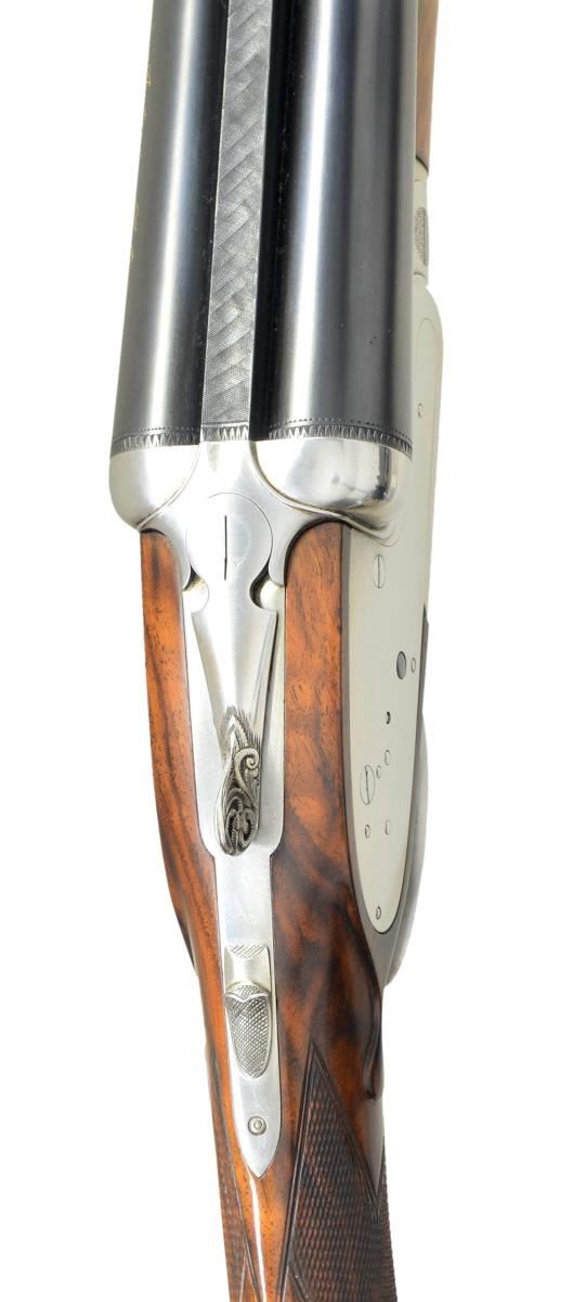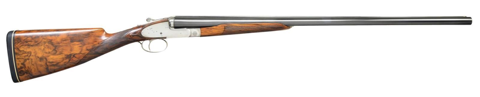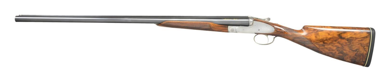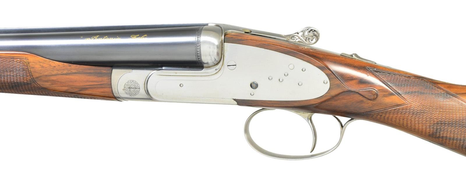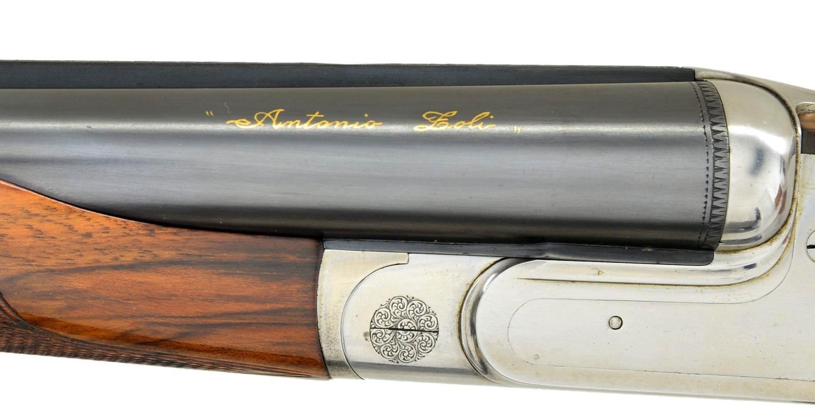 Cal. 12 Ga. 2 3/4". S# 89018 (1973). One of the highest grade guns made by Antonio Zoli, the Volcano Record was custom made. Examples are seldom seen. This unusual gun, almost devoid of engraving, is possibly unique. It has 28" shoelump barrels with slightly raised matted concave rib. "Antonio Zoli" is gold inlaid in script on left barrel. Barrel flats are stamped with 1973 Italian nitro proofs for 2 3/4" chambers along with "106A" and grade "VR". These marks are also found on watertable of coin finished H&H type sidelock action. Action features non-automatic safety, hidden third fastener, bushed strikers with gas vents, gold line tumbler end cocking indicators and single non-selective trigger. Action is well filed and nicely polished. The only engraved decoration is a burst of small scroll on hinge pin caps and pierced and relief carved foliate scrolls on thumb piece. Plain trigger guard has S# in gold on tang. (Plain finish guns like this were often made to show off excellent gun making skills with joining of parts not hidden by engraving). Very attractive well marbled and lightly stump figured European walnut, slightly swan necked buttstock measures 14 5/8" over solid black "Old English" white line pad. Stock features drop points and point pattern grip checkering. Matching beavertail ejector forend has Anson release. MEASUREMENTS: BBLS: Bore Diameter: L .724. R .724. Restriction: L .037 (extra full). R .023 (mod). Wall thickness: L .021. R .020. STOCK: DAH: 1 1/2". DAC: 1 3/16". CAST: about 1/4" off. LOP: 14 5/8". WEIGHT: 7 lb. 7 oz. CONDITION: finish very fine, mechanics fair. Metal parts retaining nearly all of their blue and coin finish with only some minor handling marks. Stocks have a few scattered marks in what appears to be their original lacquer finish. Bores are bright and shiny without noted problems. Action is tight, barrels are on face, ejectors in time, mechanical trigger appears to work well. The third fastener locking bolt is sheared off of top lever, so no bolt engages third fastener. (22-5921/MGM). MODERN. $3,000-4,500.