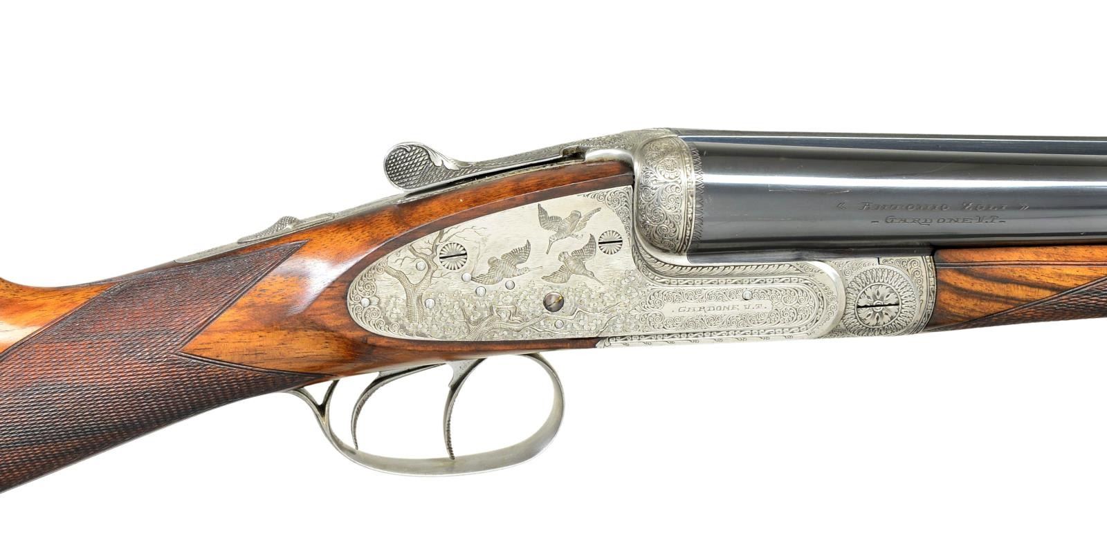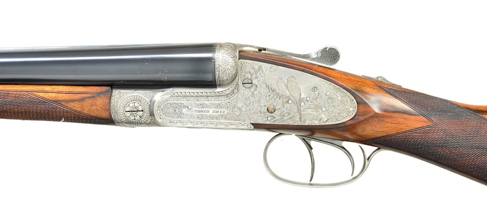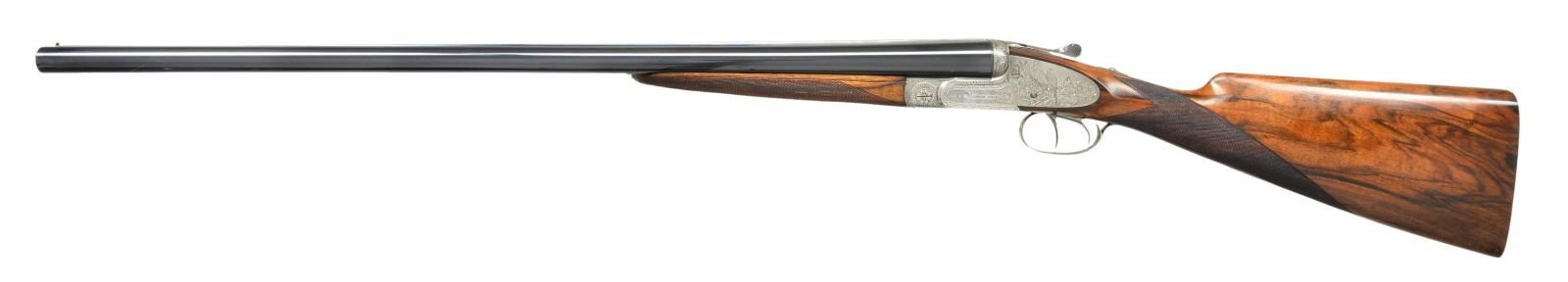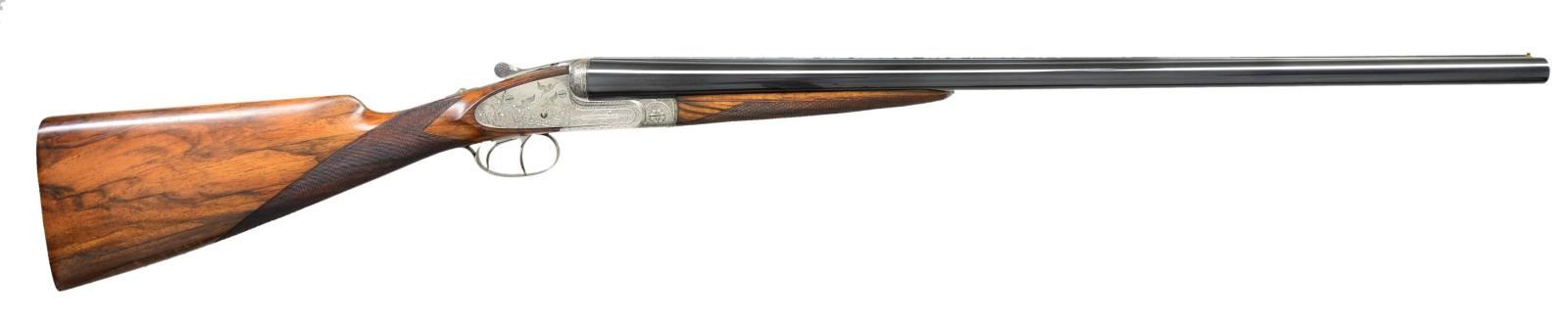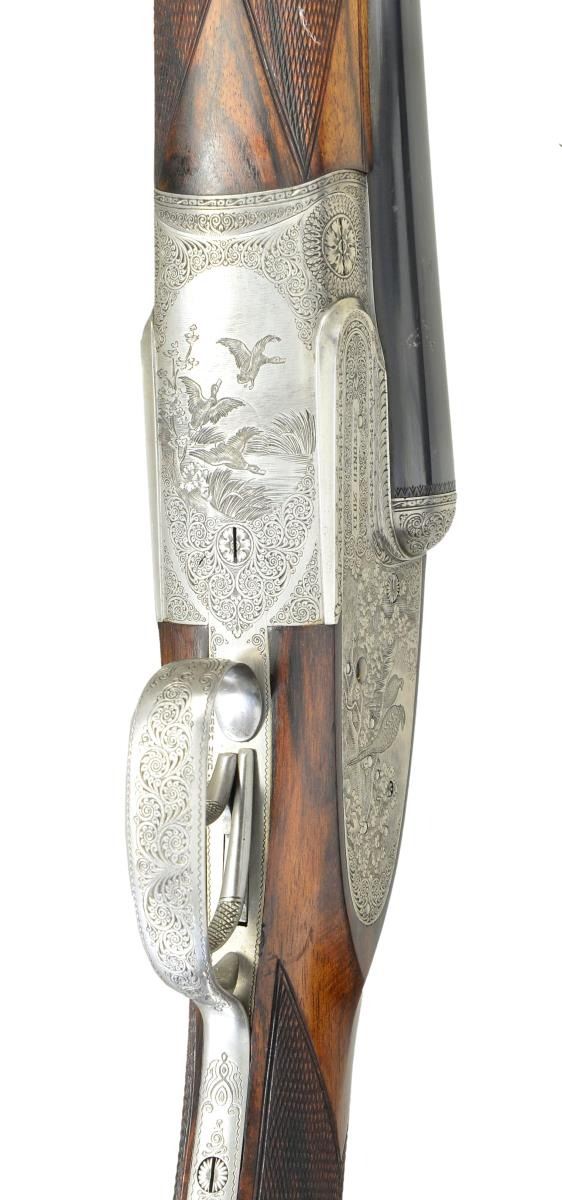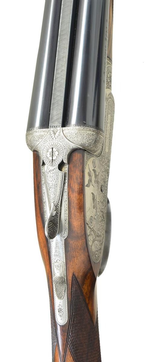 ENGRAVED SIDELOCK SHOTGUN. Cal. 12 Ga 2-3/4’’. S# 43944. Bbls. 27-1/2’’ w/ hand matted solid rib. Choke markings indicate M&F. 7 pin sidelock action w/ double under lug & 3rd fastener locking. Features include selective ejectors, hand checkered double triggers, bushed firing pins & pin type cocking indicators. Full coverage engraving features scene of flying woodcock on right lock, pheasants on left w/ mallards on floorplate. Scenes are bordered by arabesque scroll & chain type borders that continue to upper & lower receiver areas as well as trigger guard & forearm iron. “Fracassi Inc” engraver signature is located on trigger plate. Splinter forearm & straight hand stock of fancy European walnut w/ dark marbled grain. Forearm & wrist have fine point pattern hand checkering. LOP: 14-1/2’’ to checkered butt. DAC: 1-1/8’’. DAH: 1-3/4’’. Near neutral cast. Bore diameter: RT .723, LT .725. Choke constriction: RT .011, LT .028. Minimum wall thickness: RT .030, LT .031. WEIGHT: 7 lbs, 1 ozs. CONDITION: bbls. retain over 98% original blue. Satin finished action shows a lightly darkened appearance. Good original wood finish showing a few small scratches. Action is tight, top lever is sitting just past dead center. Very good bright bores. (23-642/DS). MODERN. $2,500-4,500.