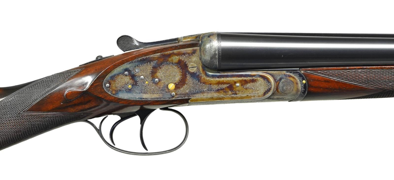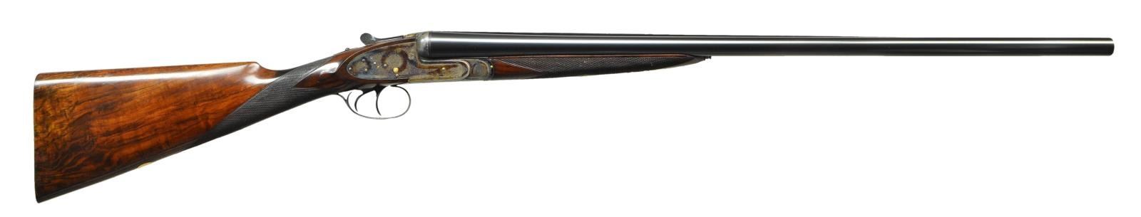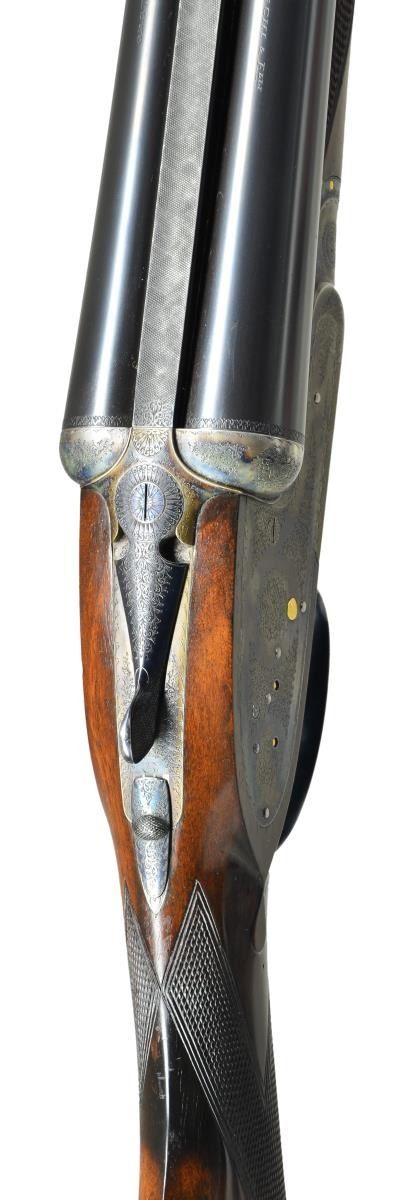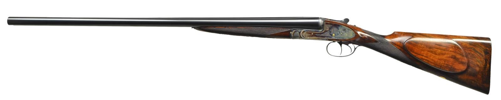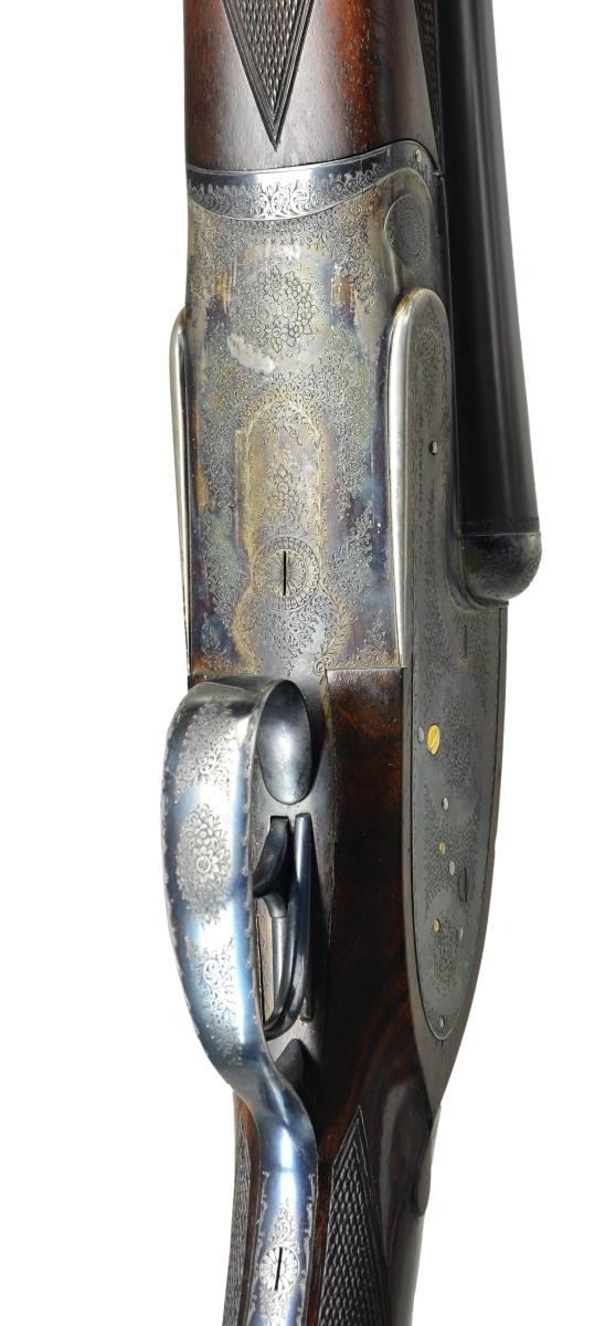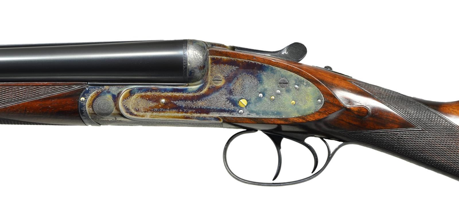 Cal. 12 Ga 2-3/4’’. S# 0994. Bbls. 28-3/8’’ of Vickers Steel w/ concave solid rib. Case colored 7 pin sidelock action w/ gold finished lock parts. Choke markings are M&F. Double under lugs & third bite locking w/ cocking indicators. Selective ejectors. Double triggers, front trigger is hinged. Action has generous coverage of fine English style rose & scroll engraving. Splinter forearm & straight hand cheek piece stock of fine European walnut. Features include hand checkering, tear drop points & brass nameplate in toeline. Forearm has an inlaid brass Toschi crest. LOP: 14’’ to a checkered butt. DAC: 1-3/8’’. DAH: 1-15/16’’. Stock has a slight cast off. Bore diameter: RT .736, LT .736. Choke constriction: RT .024, LT .040. Minimum wall thickness: RT .023, LT .023. WEIGHT: 7 lbs. Bbl. date code indicates 1966 mfg. CONDITION: action retains 90% bright case colors. Bbl. has over 98% blue w/ bright near excellent bores. Original wood finish shows light wear w/ scattered scratches, marks & small dents. Action is tight & on face. (23-679/DS). CURIO. $3,500-5,000.
