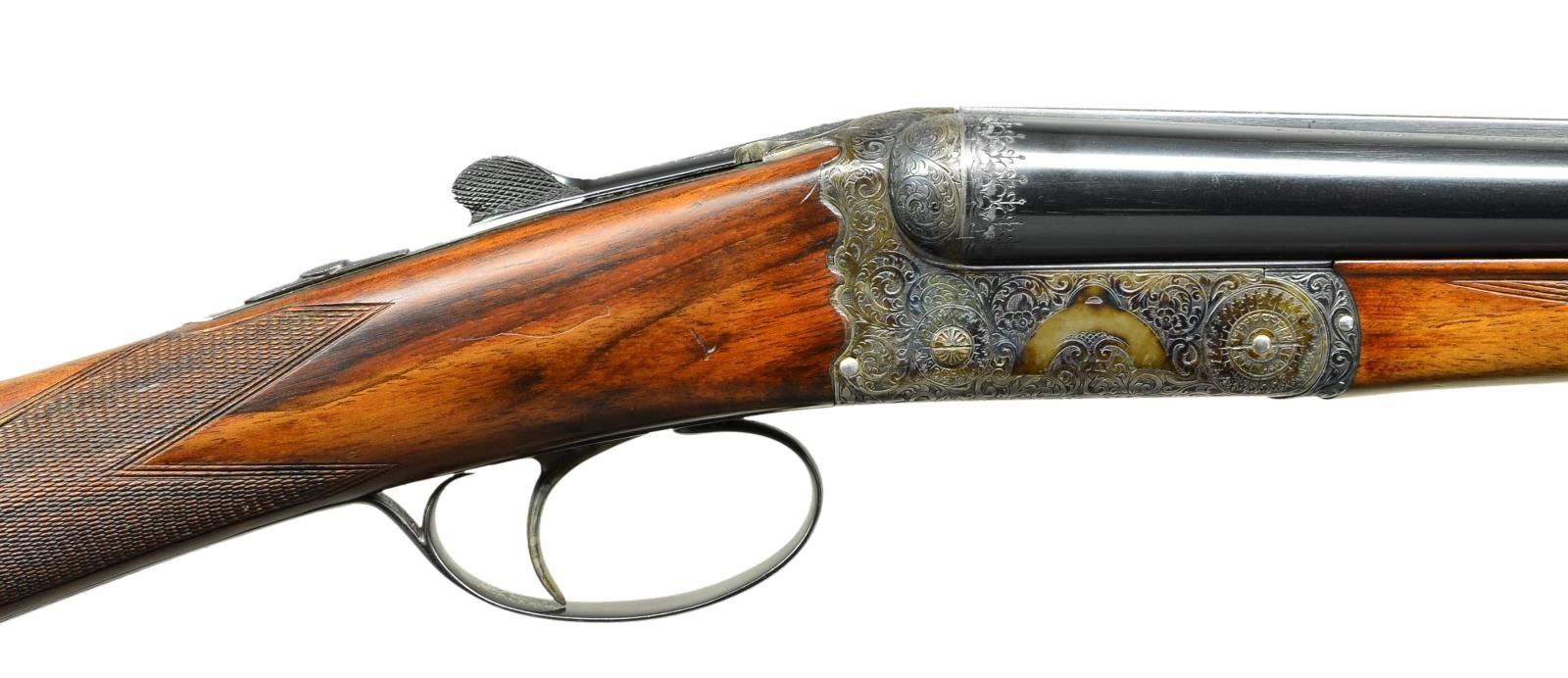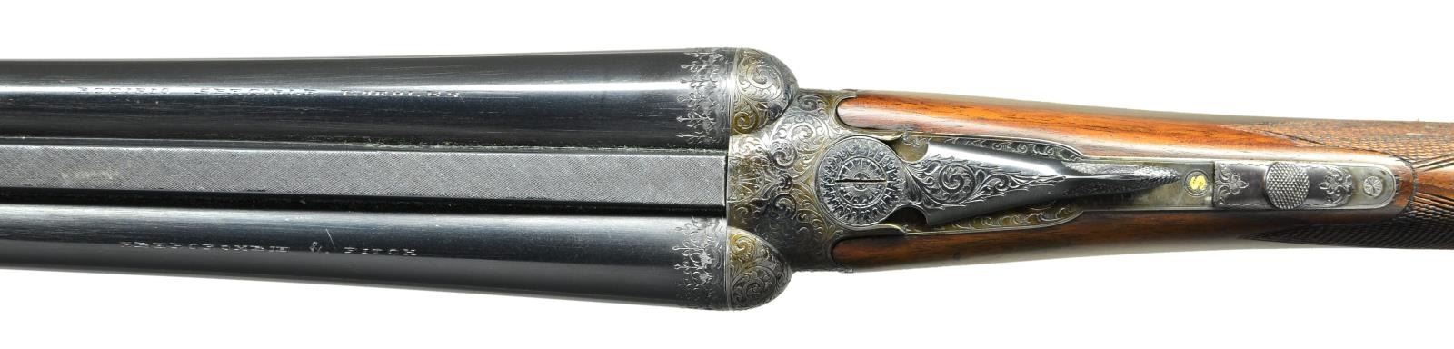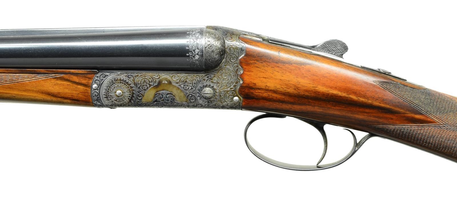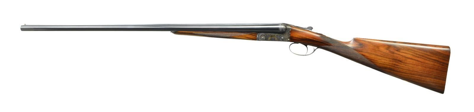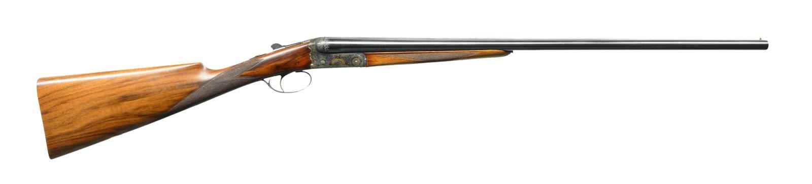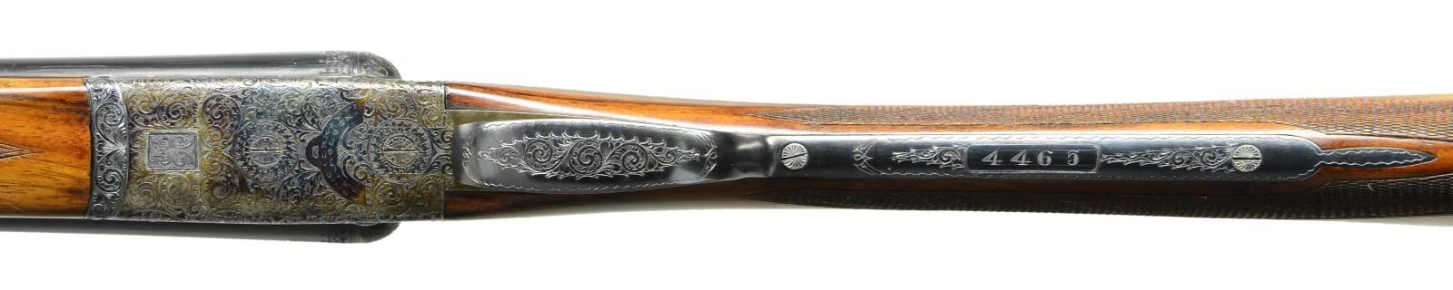 Cal. 28 Ga. 2 3/4". S# 4465 (1963). The 26" dovetailed barrels with slightly raised matted rib are engraved with steel type and retailer "ABERCROMBIE & FITCH" on tops. Barrel flats are stamped with maker's name and address, S# and 1963 Italian nitro proofs. Bottoms of barrels are stamped with two and three stars (choke). Case hardened double ogee backed boxlock action features automatic safety and single non-selective trigger. Action is engraved with near full coverage, well cut varying size open shaded scroll. Maker's name and address are in arched device on trigger plate. Blued top lever and trigger guard are engraved with matching scroll, S# is on trigger guard tang. Lightly streaked and figured European walnut straight grip buttstock measures 14 3/4" over checkered wood butt. Point pattern checkering is on semi-diamond hand and a vacant gold oval is on toeline. Matching long splinter ejector forend has Anson release. MEASUREMENTS: BBLS: Bore Diameter: L .567. R .567. Restriction: L .037 (extra full). R .017 (mod). Wall thickness: L .022. R .028. STOCK: DAH: 2 3/8". DAC: 1 1/2". CAST: neutral. LOP: 14 3/4". WEIGHT: 5 lb. 0 oz. UNATTACHED ACCESSORIES: gun comes with A&F Co. marked LOM type rectangular brown leather case. CONDITION: very fine, showing signs of little use with only a few handling and assembly marks on all surfaces. There is slight silvering on high points on action. Bores are bright and shiny. Mechanically fine. Case is also very fine, straps and handle intact. (22-5750/MGM). CURIO. $3,000-5,000.