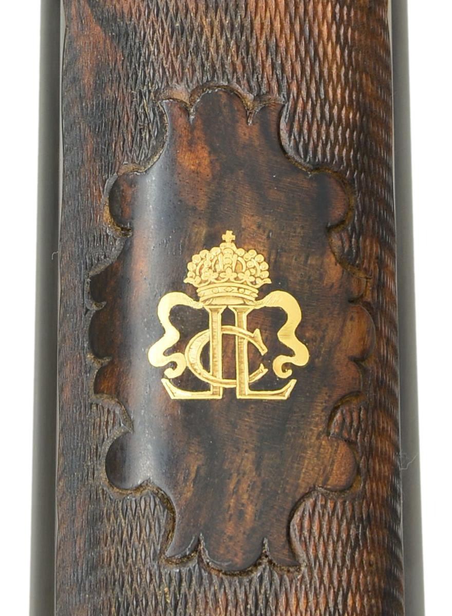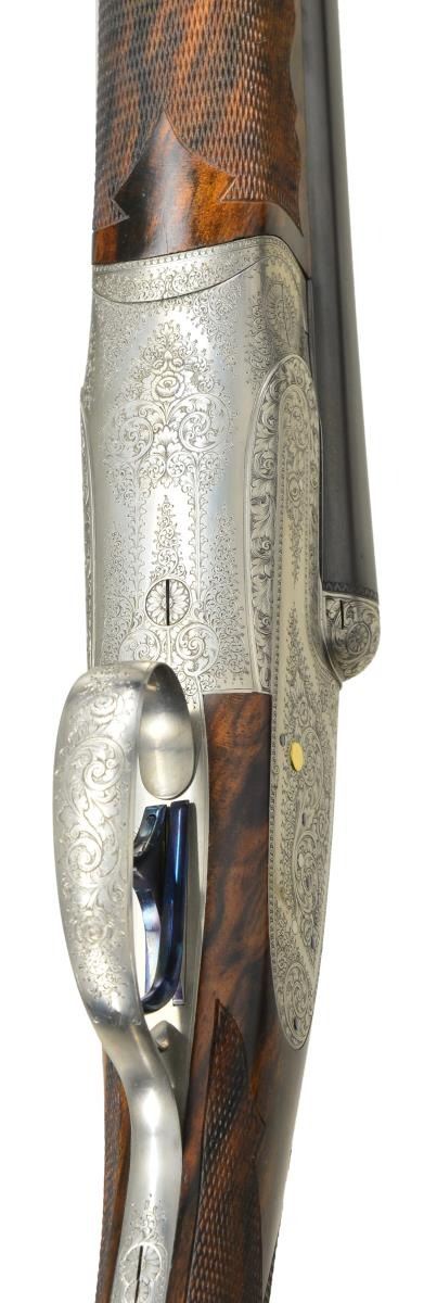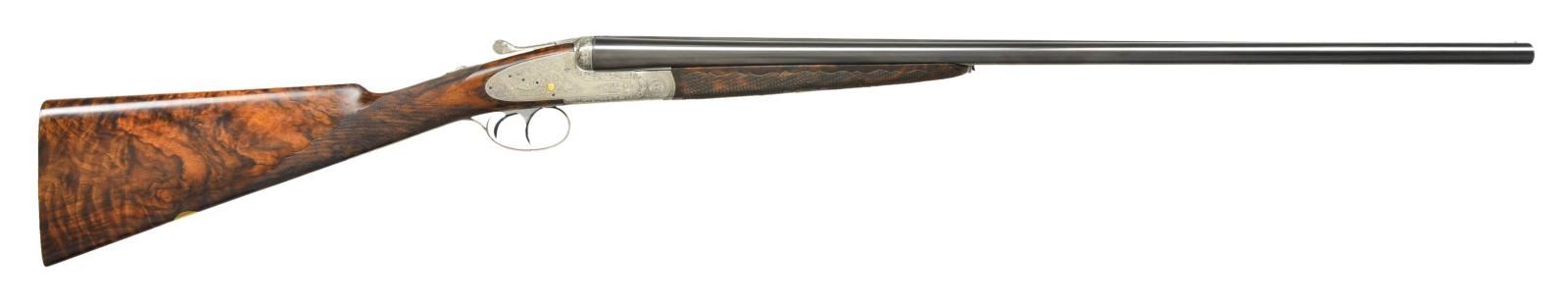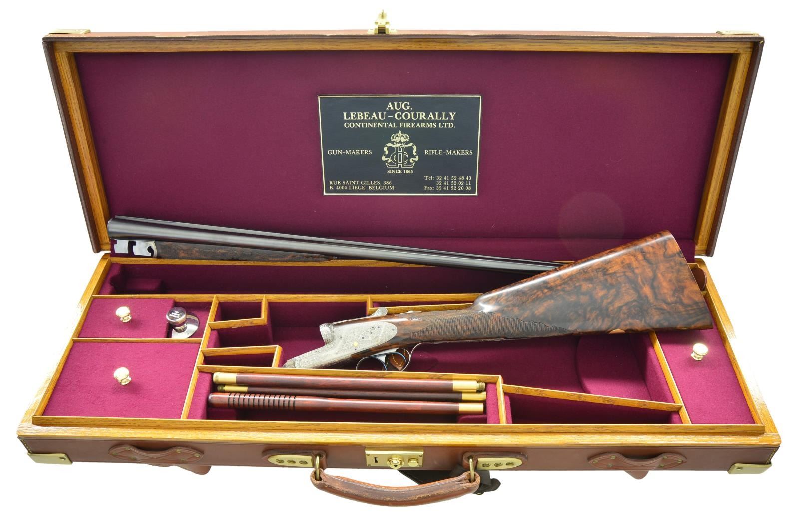 EJECTOR GAME GUN WITH CASE. Cal. 20 Ga., 2 3/4". S# 45449. The long lived firm of Lebeau-Courally is known for making some of the finest guns ever produced. This tradition continues today, and their quality is obvious in this very finely crafted gun with its 28" chopper lump barrels fitted with slightly raised matted game rib. Tops of barrels are engraved "AUG. LEBEAU- COURALLY" "ARMES DE GRAND LUXE A LIEGE". Barrel flats are stamped with year 2000 Belgian proofs for 2 3/4" chambers. Bottoms of barrels are stamped with steel type logos and "DE. WAHLREYNE" along with "MADE IN BELGIUM" and importer "Wtt. Stirling VA". Coin finished round bodied sidelock action features automatic safety, hidden third fastener, bushed strikers, gold plated internals, and double triggers (front articulated). Lockplates are also rounded and action is very nicely filed. Action and lockplates are engraved with exceptionally well cut large open shaded scroll with floral highlights surrounded by accents of small scroll, all within acanthus and beaded borders. The quality of this engraving is very fine. Engravers signature, "Tanssen" (?) is on trigger plate. Serial number is on trigger guard tang. Superbly marbled and lightly figured European walnut straight grip buttstock measures 14 1/2" over checkered wood butt with continuous ogee borders. This checkering style continues to grip and on to forend, and is very well executed. A vacant gold oval is on toe line. Matching splinter ejector forend has Anson release. Fancy central uncheckered area has nicely inlet engraved gold monogram and crown with intertwined "LLC". MEASUREMENTS: BBLS: Bore Diameter: L .635". R .635". Restriction: L .021". (mod). R .011". (light mod). Wall thickness: L .030". R .028". STOCK: DAH: 2". DAC: 1 1/2". CAST: about 1/2" off. LOP: 14 1/2". WEIGHT: 5 lb. 12 oz. UNATTACHED ACCESSORIES: this fine gun is housed in an oak and leather case with brass corners. Interior is lined in burgundy cloth with black leather Lebeau Courally label in lid. Tops of dividers in bottom section are outlined in oak and case contains cleaning equipment along with Lebeau Courally oil bottle and snap caps. CONDITION: excellent, essentially, as new. Appears unfired since proof, with only the faintest of handling and assembly marks on all wood and metal surfaces. Case is very good with about a 12" scratch on top of the lid. Accessories near excellent. The "Prince" sidelock ejector in 20 gauge presently retails at over 60.000 euros. (22-5660/MGM). MODERN. $15,000-25,000.