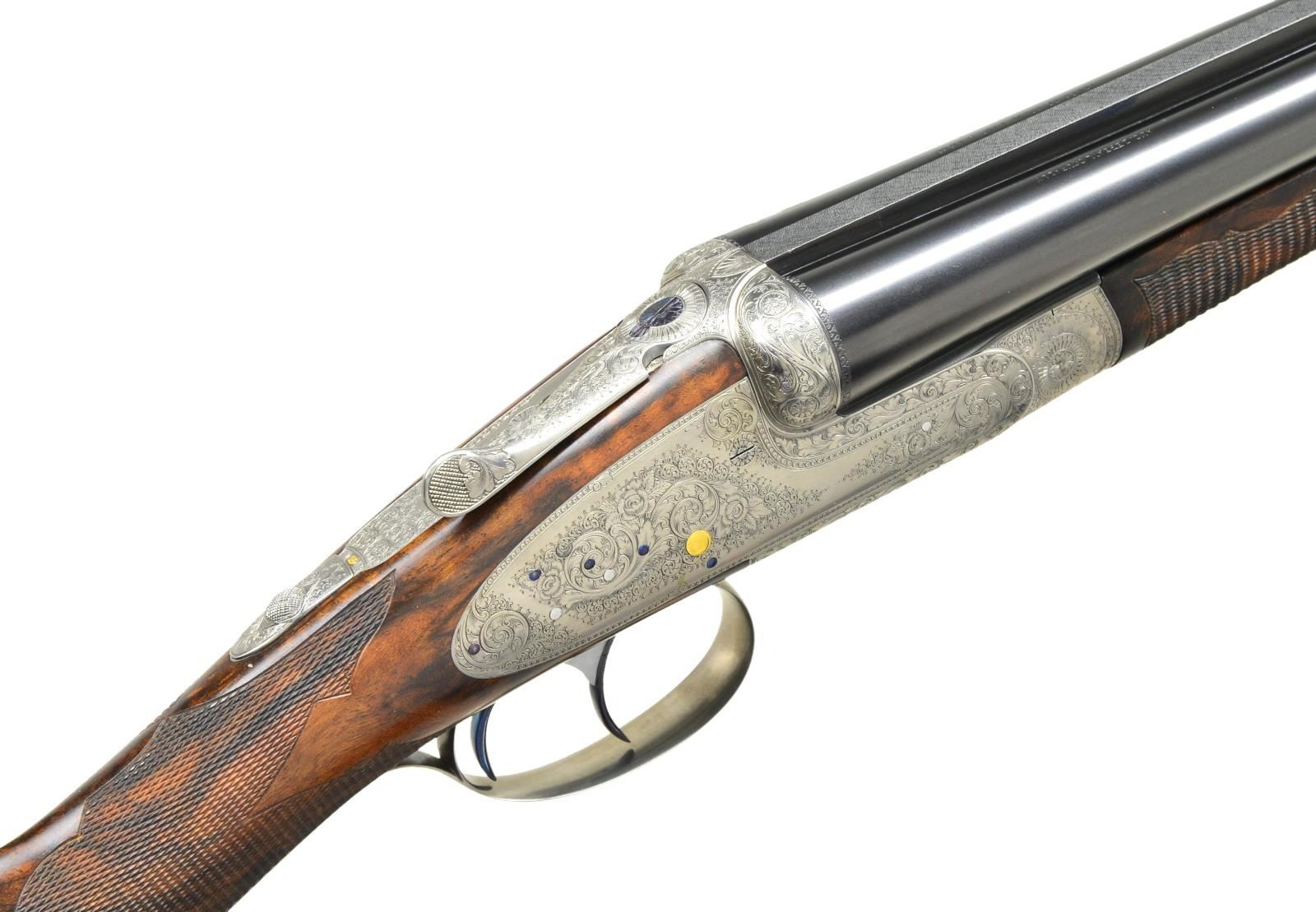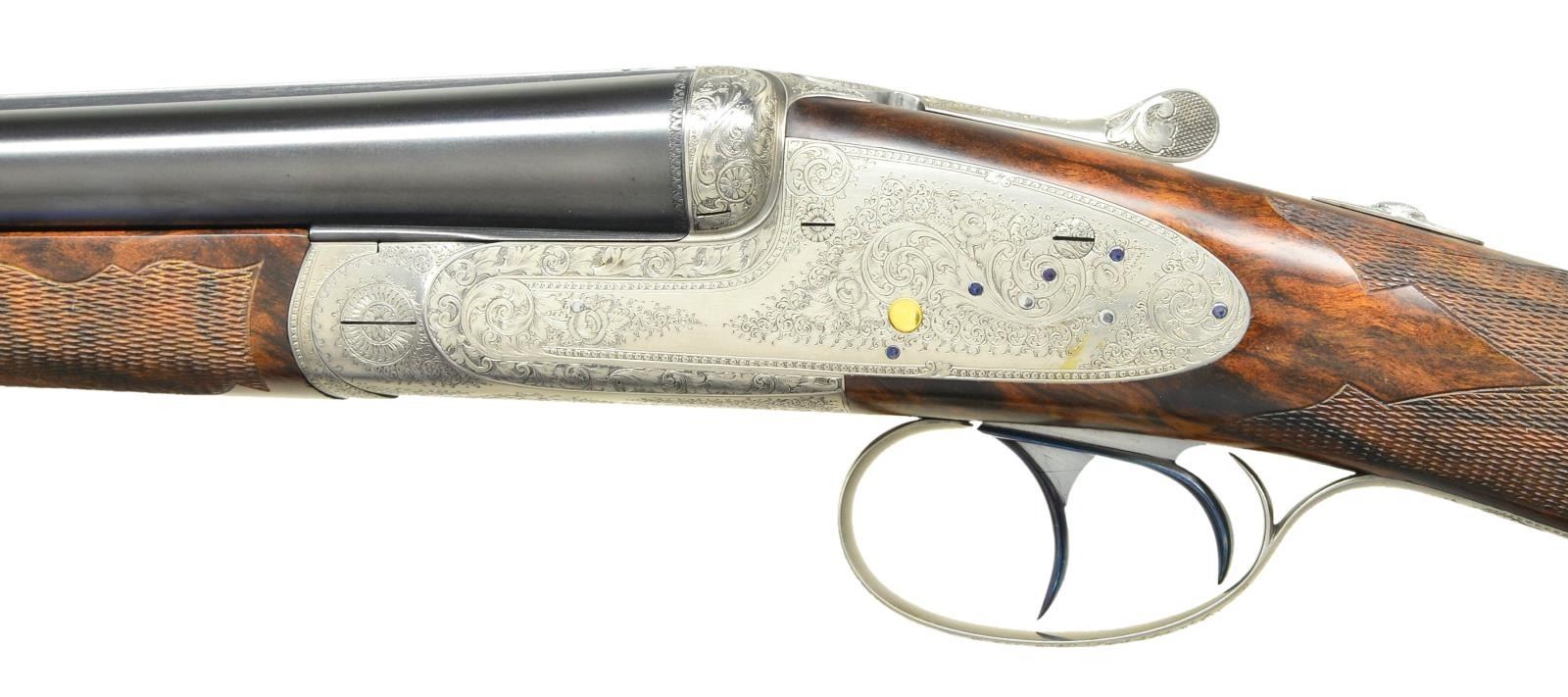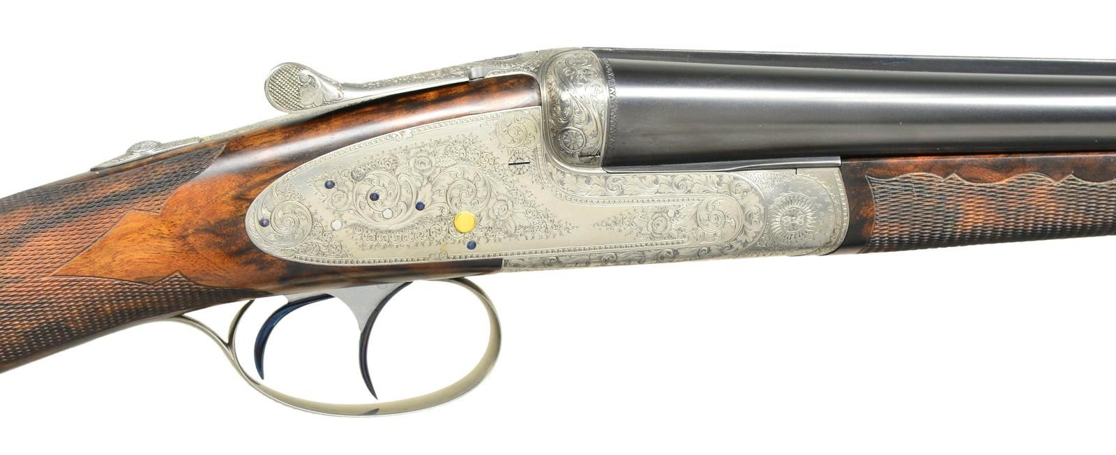 EJECTOR GAME GUN WITH CASE. Cal. 20 Ga., 2 3/4". S# 45449. The long lived firm of Lebeau-Courally is known for making some of the finest guns ever produced. This tradition continues today, and their quality is obvious in this very finely crafted gun with its 28" chopper lump barrels fitted with slightly raised matted game rib. Tops of barrels are engraved "AUG. LEBEAU- COURALLY" "ARMES DE GRAND LUXE A LIEGE". Barrel flats are stamped with year 2000 Belgian proofs for 2 3/4" chambers. Bottoms of barrels are stamped with steel type logos and "DE. WAHLREYNE" along with "MADE IN BELGIUM" and importer "Wtt. Stirling VA". Coin finished round bodied sidelock action features automatic safety, hidden third fastener, bushed strikers, gold plated internals, and double triggers (front articulated). Lockplates are also rounded and action is very nicely filed. Action and lockplates are engraved with exceptionally well cut large open shaded scroll with floral highlights surrounded by accents of small scroll, all within acanthus and beaded borders. The quality of this engraving is very fine. Engravers signature, "Tanssen" (?) is on trigger plate. Serial number is on trigger guard tang. Superbly marbled and lightly figured European walnut straight grip buttstock measures 14 1/2" over checkered wood butt with continuous ogee borders. This checkering style continues to grip and on to forend, and is very well executed. A vacant gold oval is on toe line. Matching splinter ejector forend has Anson release. Fancy central uncheckered area has nicely inlet engraved gold monogram and crown with intertwined "LLC". MEASUREMENTS: BBLS: Bore Diameter: L .635". R .635". Restriction: L .021". (mod). R .011". (light mod). Wall thickness: L .030". R .028". STOCK: DAH: 2". DAC: 1 1/2". CAST: about 1/2" off. LOP: 14 1/2". WEIGHT: 5 lb. 12 oz. UNATTACHED ACCESSORIES: this fine gun is housed in an oak and leather case with brass corners. Interior is lined in burgundy cloth with black leather Lebeau Courally label in lid. Tops of dividers in bottom section are outlined in oak and case contains cleaning equipment along with Lebeau Courally oil bottle and snap caps. CONDITION: excellent, essentially, as new. Appears unfired since proof, with only the faintest of handling and assembly marks on all wood and metal surfaces. Case is very good with about a 12" scratch on top of the lid. Accessories near excellent. The "Prince" sidelock ejector in 20 gauge presently retails at over 60.000 euros. (22-5660/MGM). MODERN. $15,000-25,000.