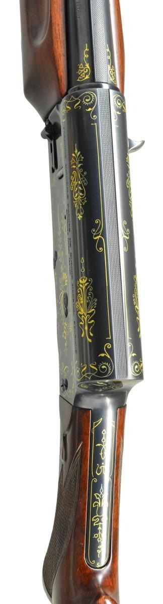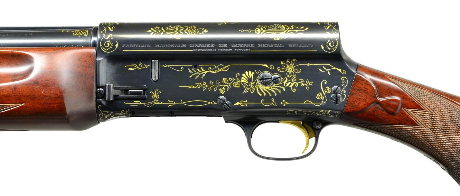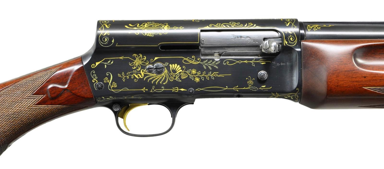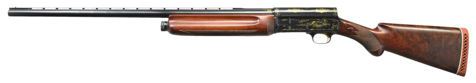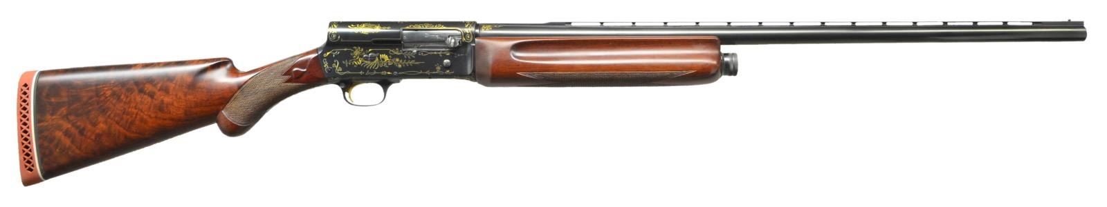 AUTO SHOTGUN. Cal. 16 Ga., 2 9/16". S#. 73046. Bbl. 27 1/2" of Special Steel with factory vent rib and fixed Full choke. Browning patent A-5 square stern recoil operated action. The blued receiver has exquisite Grade IV gold inlay ornamentation consisting of generous coverage of floral and geometric shapes. The inlay work extends to the upper and lower receiver and tang areas as well as the trigger guard bow and breech end of bbl. Gold plated trigger. Cross bolt safety. Beavertail forend and round knob stock of fancy walnut features tear drop points and point pattern checkering. LOP: 14 3/4" to a red ventilated Pachmayr replacement pad. WEIGHT: 8 lbs., 6.6 oz. 1929 mfg. UNATTACHED ACCESORIES: the extremely fine Pre-War Browning luggage case is a highlight of this lot. The 34"x8"x4" case has black leatherette covering and leather covered handle. The fitted gray felt interior has strap closures for the action and bbl. compartments. The lid interior has a 2"x3/4" brass Browning label with the St. Louis, MO. address. The exterior is in very fine condition showing only a few small marks. The gray felt interior is very good showing spots of light discoloration and fading. CONDITION: near excellent as restored. Finely polished metal retains virtually all reblued finish. Wood has very good satin refinish. Very good bright bore. (22-6035/DS). CURIO. $8,500-12,500.