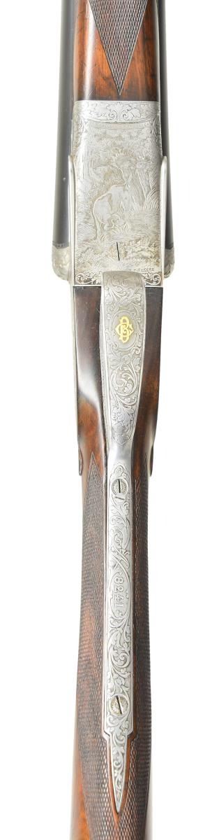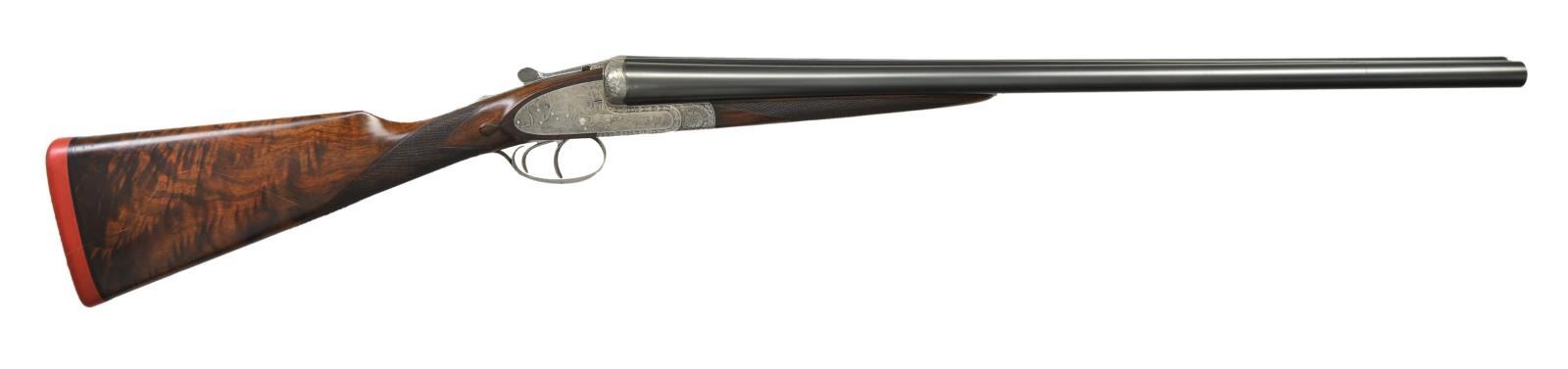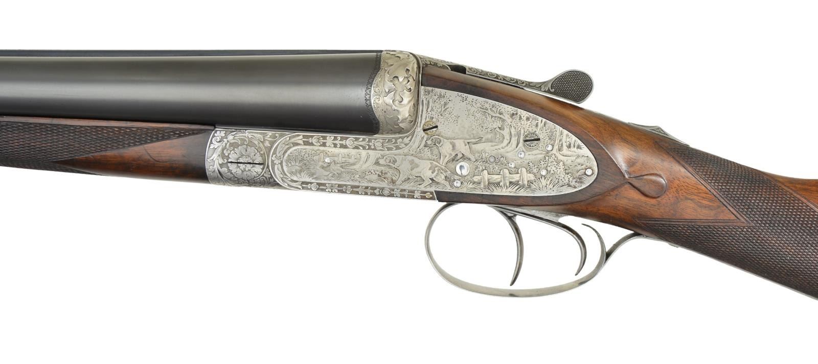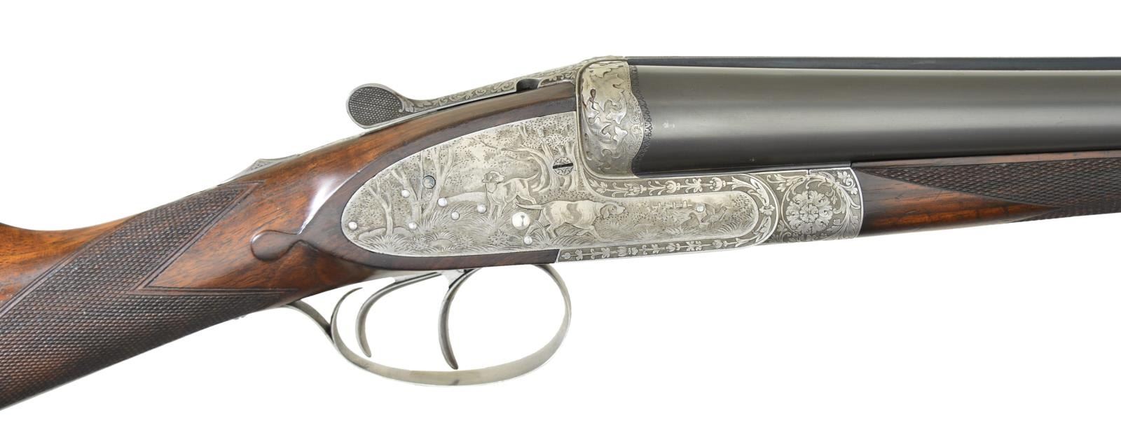 2 BBL. SET SIDELOCK SHOTGUN. Cal. 12 Ga 2-3/4’’. S# 8241. A beautiful high quality gun by H. Mahillon of Brussels, Belgium. Research indicates Mahillion often listed as Mayon is more accurately transcribed as "Meiyeon". Manufacturer of firearm, is original descendant of Michel Meyon who had 3 girls & 3 boys; 2 of which who first worked mfg. music instruments. Charles (1 of 3 sons) youngest son Bartholemew (born 1817 and listed in 1831 as day laborer) opened his own gunsmithing business in 1840s. References state he entered his works in 2 world exhibitions: Paris in 1867 & Antwerp in 1885. At the Exhibitions he received medals, but not gold; old company records indicate he also competed in 1891 Paris Exhibition (no acknowledgement of medals). Henri Mahillon (son of Charles, born 1862) continued the business & exhibited at Antwerp in 1894. Between WW1 & WW2 Henri was well known as high quality firearms maker advertising himself as "Manufacturer to King" in his advertising. Seven pin sidelock action. Double under lug w/ third bite fastener & side clips. Bushed firing pins. Selective ejectors. Double triggers, front trigger is hinged. Exquisite game scene engraving signed by “H. Leukers”. Leukers was a Belgian master engraver who’s work was highlighted at the 1937 Paris Exposition. Right lock plate has an open scene of two pointing dogs w/ flushing quail. Left lock scene features two pointing dogs & a rooster pheasant. Floorplate has a highly detailed upland scene of a dog locked on point. Bolsters have a deep relief oak leaf carving. Remaining areas of receiver, top tang, top lever, trigger guard & forearm iron have a fine vine type foliate scroll. Breech end of bbls. have borderline engraving. Trigger guard bow has gold monogram that appears to be “CB”. Splinter forearm w/ Anson release & straight hand stock of exhibition quality European walnut. Stock & forearm have fine point pattern hand checkering w/ tear drop points behind ears. Toeline of stock has German silver nameplate. LOP: 14-1/2’’ over a solid red London style pad. DAC: 1-1/2’’. DAH: 2-1/8’’. Stock has approx. 3/8’’ cast off. Weight w/ 25-3/4’’ bbls: 6 lbs, 12.6 ozs. Bbls. have concave matted solid ribs w/ steel beads. Bottom of bbls. are marked “Toledo Steel Works Sheffield, N”. Importer or retailer markings are “JNO.HY. ANDREW & Co. LTD.”. (Bbl. No. 1) 25-3/4’’ is numbered to gun. Bore diameter: RT .719, LT .720. Choke constriction: RT .008, LT .035. Minimum wall thickness: RT .038, LT .038. (Bbl. No. 2) 28-3/8’’ & is numbered 8242. Bore diameter: RT .721, LT .721. Choke constriction: RT .035, LT .034. Minimum wall thickness: RT .033, LT .033. CONDITION: action retains sharp clear engraving having a soft gray appearance. Both sets of bbls. have over 90% original blue. Both have screws in holes for sling swivel attachment. Both sets have lengthened forcing cones. All bores are very good & bright. Refinished wood shows scattered scratches & marks. Checkering is freshened. Action is tight & on face w/ top lever sitting at center. (23-658/DS). CURIO. $5,000-8,000.