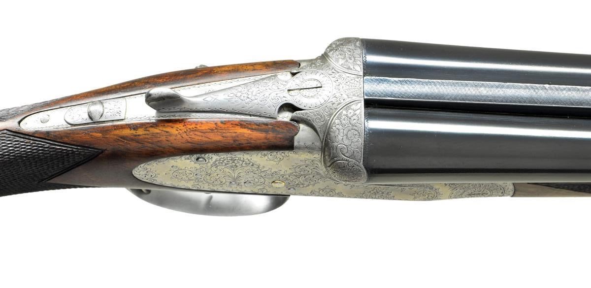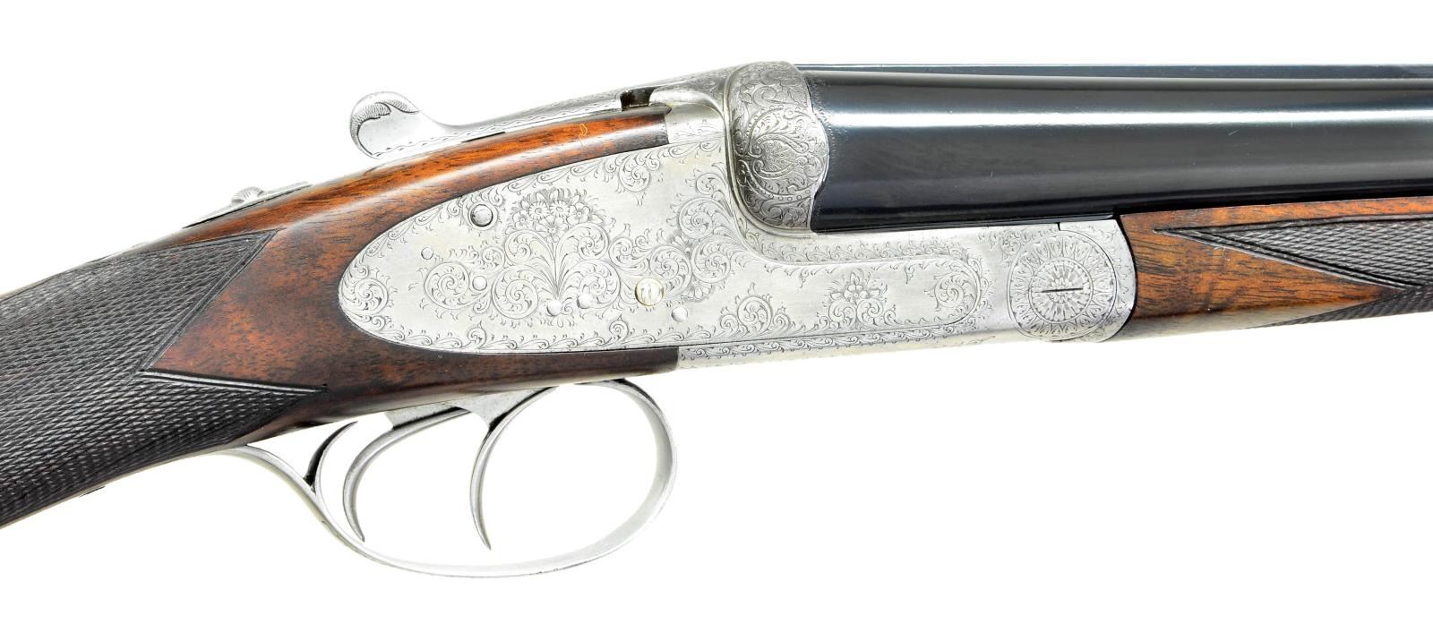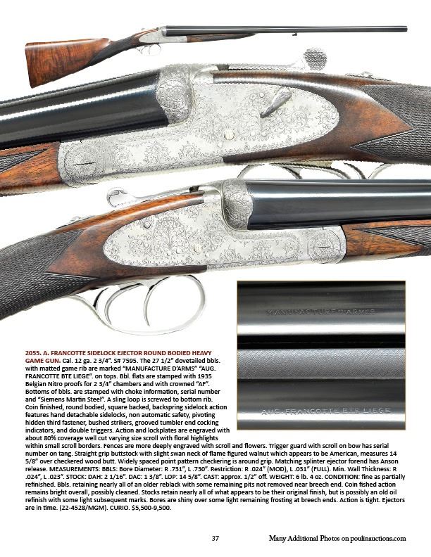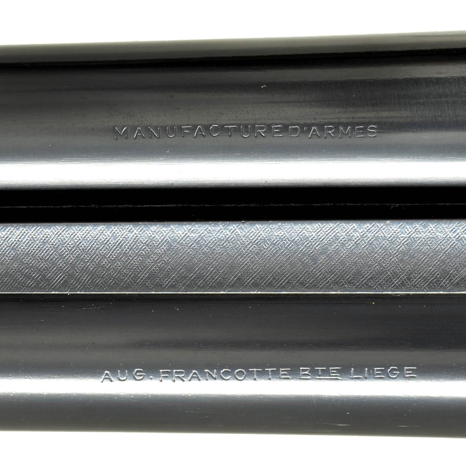 GAME GUN. Cal. 12 ga. 2 3/4". S# 7595. The 27 1/2" dovetailed bbls. with matted game rib are marked "MANUFACTURE D'ARMS" "AUG. FRANCOTTE BTE LIEGE". on tops. Bbl. flats are stamped with 1935 Belgian Nitro proofs for 2 3/4" chambers and with crowned "AF". Bottoms of bbls. are stamped with choke information, serial number and "Siemens Martin Steel". A sling loop is screwed to bottom rib. Coin finished, round bodied, square backed, backspring sidelock action features hand detachable sidelocks, non automatic safety, pivoting hidden third fastener, bushed strikers, grooved tumbler end cocking indicators, and double triggers. Action and lockplates are engraved with about 80% coverage well cut varying size scroll with floral highlights within small scroll borders. Fences are more deeply engraved with scroll and flowers. Trigger guard with scroll on bow has serial number on tang. Straight grip buttstock with slight swan neck of flame figured walnut which appears to be American, measures 14 5/8" over checkered wood butt. Widely spaced point pattern checkering is around grip. Matching splinter ejector forend has Anson release. MEASUREMENTS: BBLS: Bore Diameter: R .731", L .730". Restriction: R .024" (MOD), L .031" (FULL). Min. Wall Thickness: R .024", L .023". STOCK: DAH: 2 1/16". DAC: 1 3/8". LOP: 14 5/8". CAST: approx. 1/2" off. WEIGHT: 6 lb. 4 oz. CONDITION: fine as partially refinished. Bbls. retaining nearly all of an older reblack with some remaining pits not removed near breech end. Coin fished action remains bright overall, possibly cleaned. Stocks retain nearly all of what appears to be their original finish, but is possibly an old oil refinish with some light subsequent marks. Bores are shiny over some light remaining frosting at breech ends. Action is tight. Ejectors are in time. (22-4528/MGM). CURIO. $4,000-6,000.