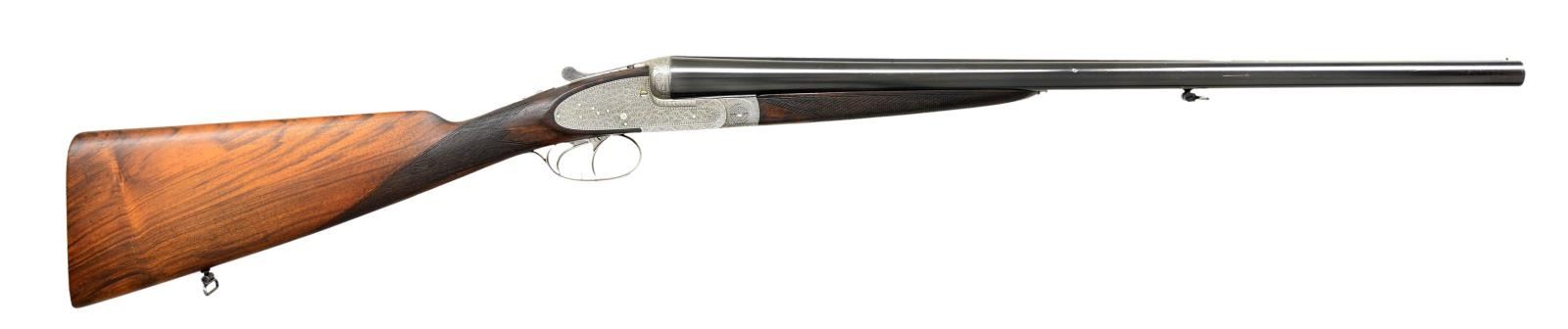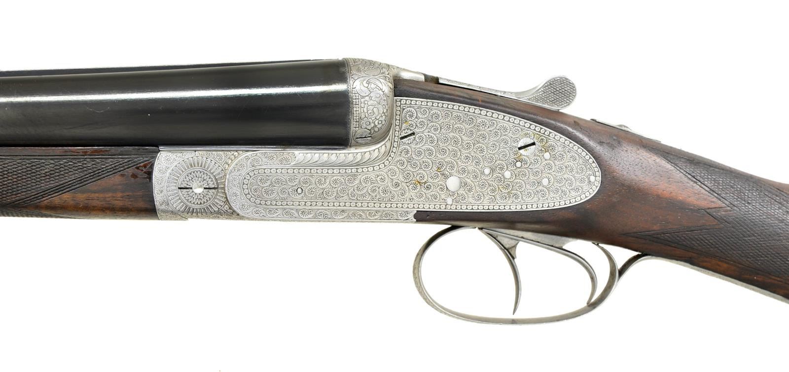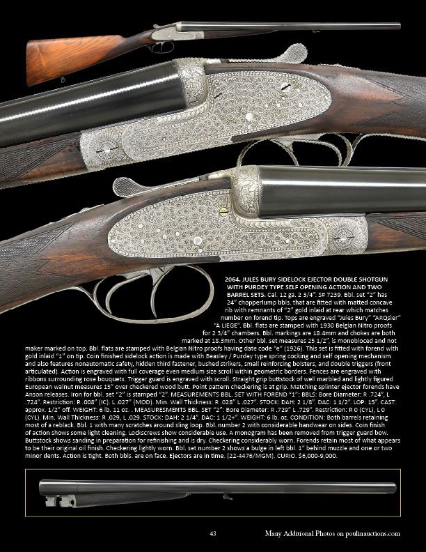 PURDEY TYPE SELF OPENING ACTION AND TWO BARREL SETS. Cal. 12 ga. 2 3/4". S# 7239. Bbl. set "2" has 24" chopperlump bbls. that are fitted with matted concave rib with remnants of "2" gold inlaid at rear which matches number on forend tip. Tops are engraved "Jules Bury" "ARQsier" "A LIEGE". Bbl. flats are stamped with 1930 Belgian Nitro proofs for 2 3/4" chambers. Bbl. markings are 18.4mm and chokes are both marked at 18.3mm. Other bbl. set measures 25 1/2", is monobloced and not maker marked on top. Bbl. flats are stamped with Belgian Nitro proofs having date code "e" (1926). This set is fitted with forend with gold inlaid "1" on tip. Coin finished sidelock action is made with Beasley / Purdey type spring cocking and self opening mechanism and also features nonautomatic safety, hidden third fastener, bushed strikers, small reinforcing bolsters, and double triggers (front articulated). Action is engraved with full coverage even medium size scroll within geometric borders. Fences are engraved with ribbons surrounding rose bouquets. Trigger guard is engraved with scroll. Straight grip buttstock of well marbled and lightly figured European walnut measures 15" over checkered wood butt. Point pattern checkering is at grip. Matching splinter ejector forends have Anson releases. Iron for bbl. set "2" is stamped "2". MEASUREMENTS BBL. SET WITH FOREND "1": BBLS: Bore Diameter: R .724", L .724". Restriction: R .008" (IC). L .027" (MOD). Min. Wall Thickness: R .028" L .027". STOCK: DAH: 2 1/8". DAC: 1 1/2". LOP: 15". CAST: approx. 1/2" off. WEIGHT: 6 lb. 11 oz. . MEASURESMENTS BBL. SET "2": Bore Diameter: R .729" L .729". Restriction: R 0 (CYL), L 0 (CYL). Min. Wall Thickness: R .029, L .029. STOCK: DAH: 2 1/4". DAC: 1 1/2+". WEIGHT: 6 lb. oz. CONDITION: Both barrels retaining most of a reblack. Bbl. 1 with many scratches around sling loop. Bbl. number 2 with considerable handwear on sides. Coin finish of action shows some light cleaning. Lockscrews show considerable use. A monogram has been removed from trigger guard bow. Buttstock shows sanding in preparation for refinishing and is dry. Checkering considerably worn. Forends retain most of what appears to be their original oil finish. Checkering lightly worn. Bbl. set number 2 shows a bulge in left bbl. 1" behind muzzle and one or two minor dents. Action is tight. Both bbls. are on face. Ejectors are in time. (22-4476/MGM). CURIO. $4,000-6,000.