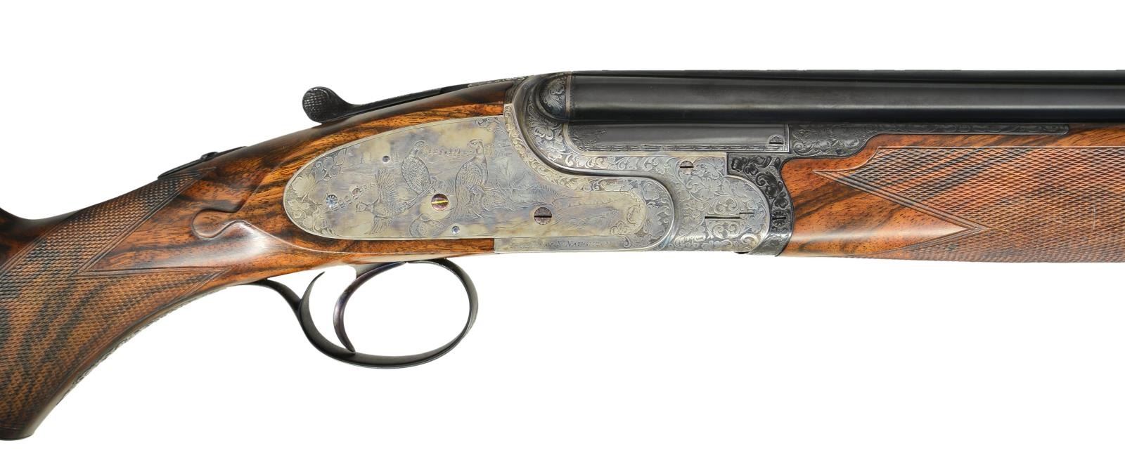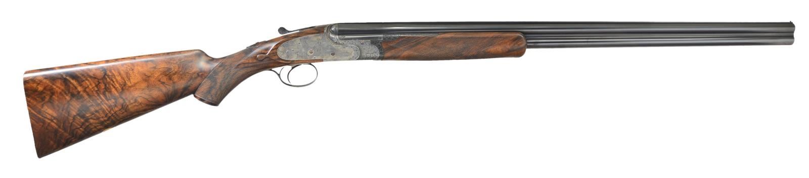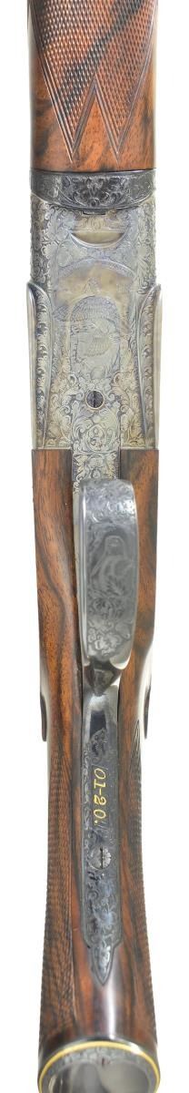 SHOTGUN. Cal. 20 Ga 2-3/4’’. S# 01-20. Bbls. 28’’ demi-block with hand matted solid rib. Modern gun featuring the time tested boss style action. Sidelock action has an attractive muted case colored finish providing a vintage appearance. Features include single non-selective trigger, pin type cocking indicators and boss ejector system. Masterful game scene engravings feature pheasants on right side plate, prairie chickens on left, quail on top tang with woodcock on floorplate and trigger guard bow. Scenes are bordered by highlights of foliate engraving with stippled backgrounds. Complimenting foliate scroll covers all other action surfaces as well as forearm iron and trigger guard. Wedges of scroll and chainlink borders highlight the breech section of the bbl. Gold highlights are found forward of the safety button, serial number on trigger guard bow with highlights on cocking indicators as well as forearm release and escutcheon. Field style forearm and stock with Woodward style pistol grip. Wood of exhibition quality thin shell walnut having brown and orange tone marbling with vivid dark streaks. Features include tear drop points, point pattern hand checkering, engraved steel grip cap with gold inlaid border and oval nameplate on toeline. LOP: 14-1/2’’ to checkered butt with engraved gold bordered toeplate. DAC: 1-5/16’’. DAH: 2-3/16’’. Stock has approx. 3/8’’ cast off. Bore diameter: U .625, O .624. Choke constriction: U .006, O .006. Minimum wall thickness: U .030, O .030. WEIGHT: 6 lbs, 4.2 ozs. UNATTACHED ACCESSORIES: leather covered luggage case with red felt interior. Interior case lid has Holloway & Naughton label. Case contains brass tipped ebony cleaning rod, sterling silver oil bottle, snap caps, set of 3 ebony handled turnscrews and leather bag containing cleaning accessories. CONDITION: near new showing little or no use and retaining virtually all metal finish. Stock shows small finish wear spots with a few light scratches. Bright near excellent bores. (23-659/DS). MODERN. $25,000-40,000.