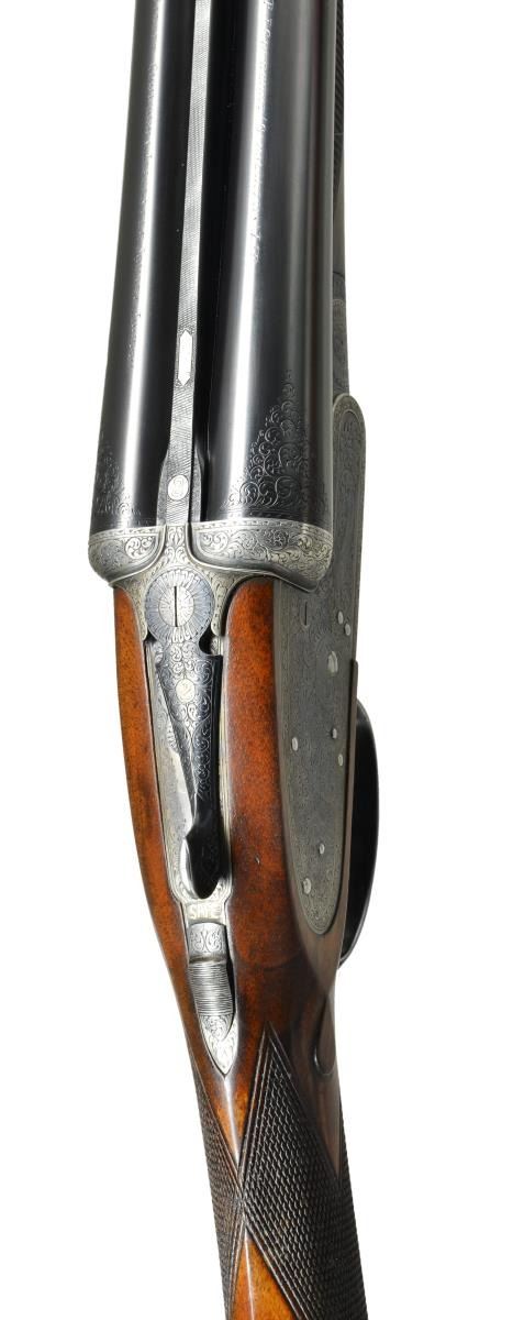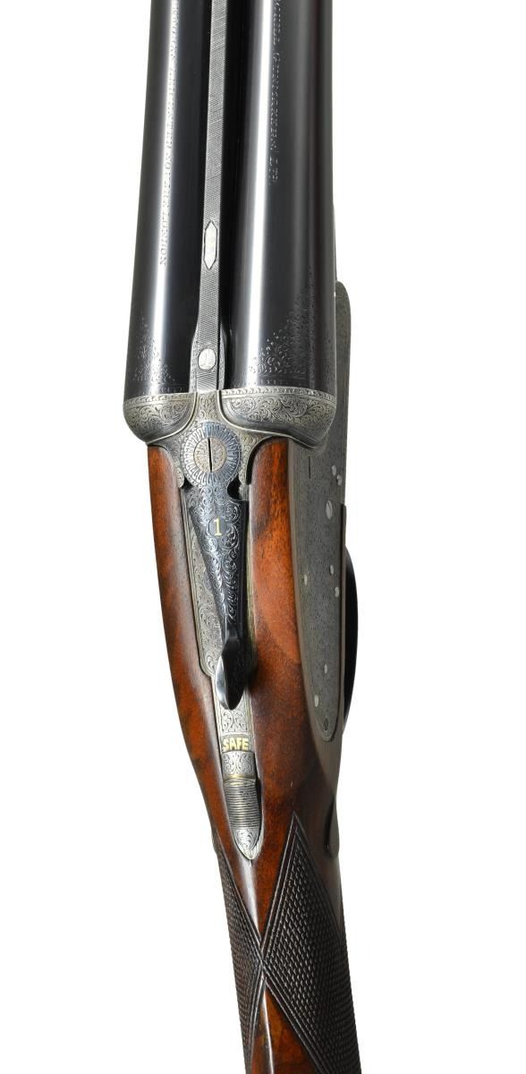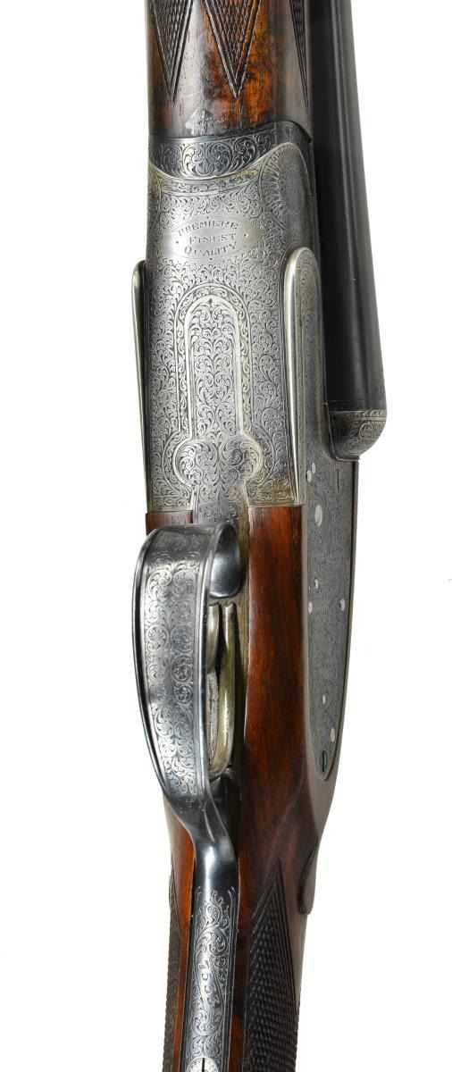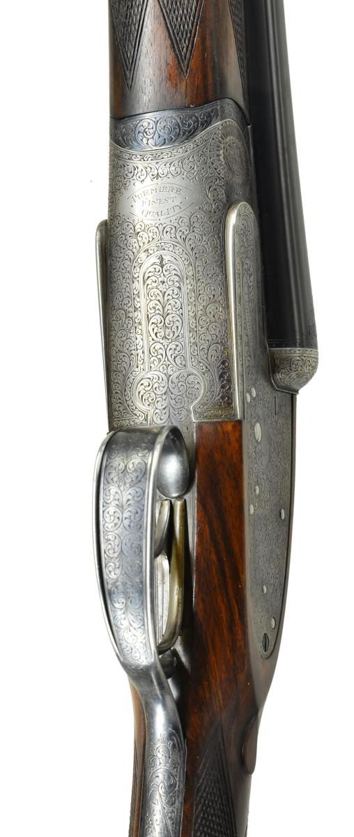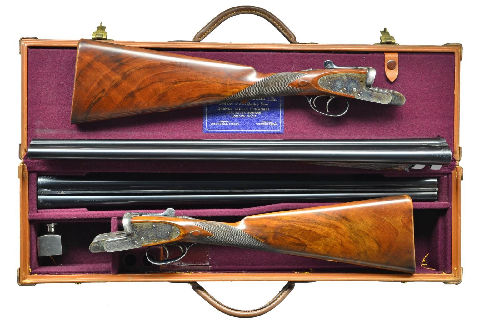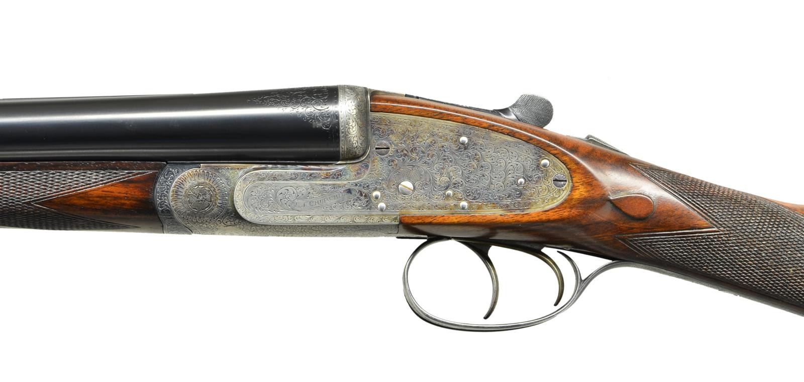 EASY-OPENING SIDELOCK EJECTOR GAME GUNS WITH CASE. Cal. 12 Ga., 2" chambers. S#s 7533/ 7534 (1961). The 25" chopper lump barrels are fitted with slightly raised Churchill ribs, gold inlaid "XXV" and with either "1" or "2" denoting a true pair. These guns are also gold inlaid with "1" or "2" on top levers and forend tips. Tops of barrels are engraved with Churchill name and Orange Street addresses. There are 1 1/4" triangles of scroll at breech ends. There are no markings or inlays visible on exterior of guns to indicate that the chambers are for 2" only. Barrel flats are stamped with British nitro proofs for 2" chambers at 2-3/4 tons per square inch, and ".729". It is interesting to note that gun "7533" has Birmingham proofs, and "7534" has London proofs. Small frame, Baker patent, easy opening, 12/20 type, sidelock actions feature automatic safeties ("SAFE" inlaid in gold), gold line tumbler end cocking indicators, and double triggers. Actions are engraved with full coverage medium scroll within line borders. "E. J. Churchill" is in scroll terminated rib and on each lockplate. "Premiere" "Finest" "Quality" is on bottoms of actions. Blued double beaded trigger guards are also scroll engraved and S#s are on short tangs. Fairly well matched, lightly marbled and figured European walnut straight grip buttstocks measure 15 1/4" over checkered wood butts, and feature typical drop points, point pattern checkering, and gold ovals engraved "R. W. C." Matching splinter ejector forends have Anson releases. MEASUREMENTS: BBLS: Gun no. "1": Bore diameter: L .729". R .729". Bore restrictions: L .019" (mod). R .016" (mod). Wall thickness: L .029". R .029". DAH: 2 1/16". DAC: 1 1/2". CAST: approx 1/2" off. Weight: 5 lbs. 11 oz. LOP: 15 1/4". Gun no. "2": Bore diameter: L .730". R.728". Bore restrictions: L .021" (mod). R .009" (IC). Wall thickness: L .026". R .025". DAH: 2 1/16". DAC: 1 1/2". CAST: approx 1/2" off. Weight: 5 lbs. 12 oz. LOP: 15 1/4". Guns are housed in their original brown leather special Churchill "VC" two gun case with stitched leather corners lined in burgundy cloth with blue label on divider. Case contains two piece cleaning rod with brush and jag, and a "Churchill" marked square oil bottle. CONDITION: very fine, as partially refinished. Barrels retain essentially all of a fine quality reblack, engraving somewhat softened. Action and lockplates retain over 60% of their original case hardening color with loss due to normal hand wear. Right lockplate of gun "2" and color of gun "1" are considerably stronger. Stocks retain nearly all of an old hand rubbed oil finish with a few subsequent marks. Sharp edges are well preserved. Checkering is lightly worn, and has not been recut. Bores are very fine without noted problems. Actions are tight. Barrels are on face. Ejectors are strong and in time. Case leather is darkening, with a number of scuffs and rubs. Handles are beginning to detach, but are still good. Interior cloth is fine with some rubs and soiling. Label is very fine. Accessories are good. Most 2" guns are boxlocks, sidelock guns are scarce. This pair of "Best" sidelocks is exceptionally rare, possibly unique. 2" Cartridges are often available from RST. (22-5641 & 22-5642/MGM). BOTH CURIO. $14,000-20,000.