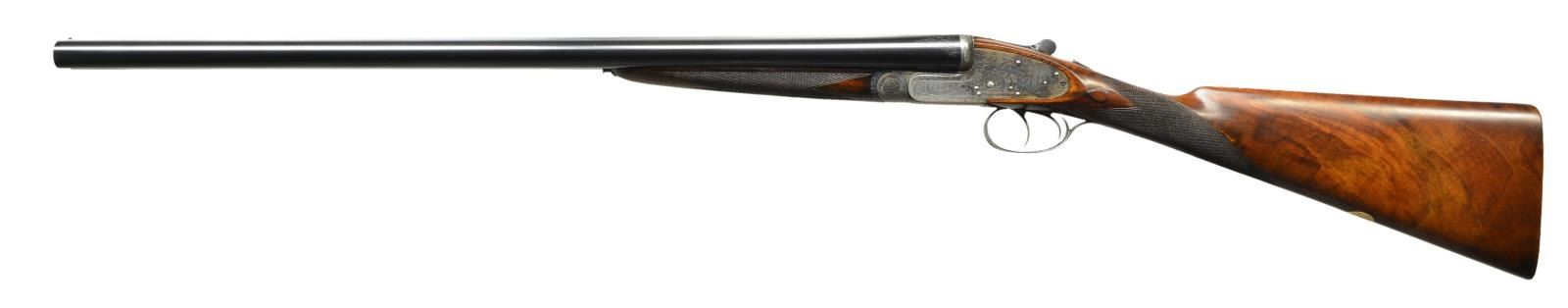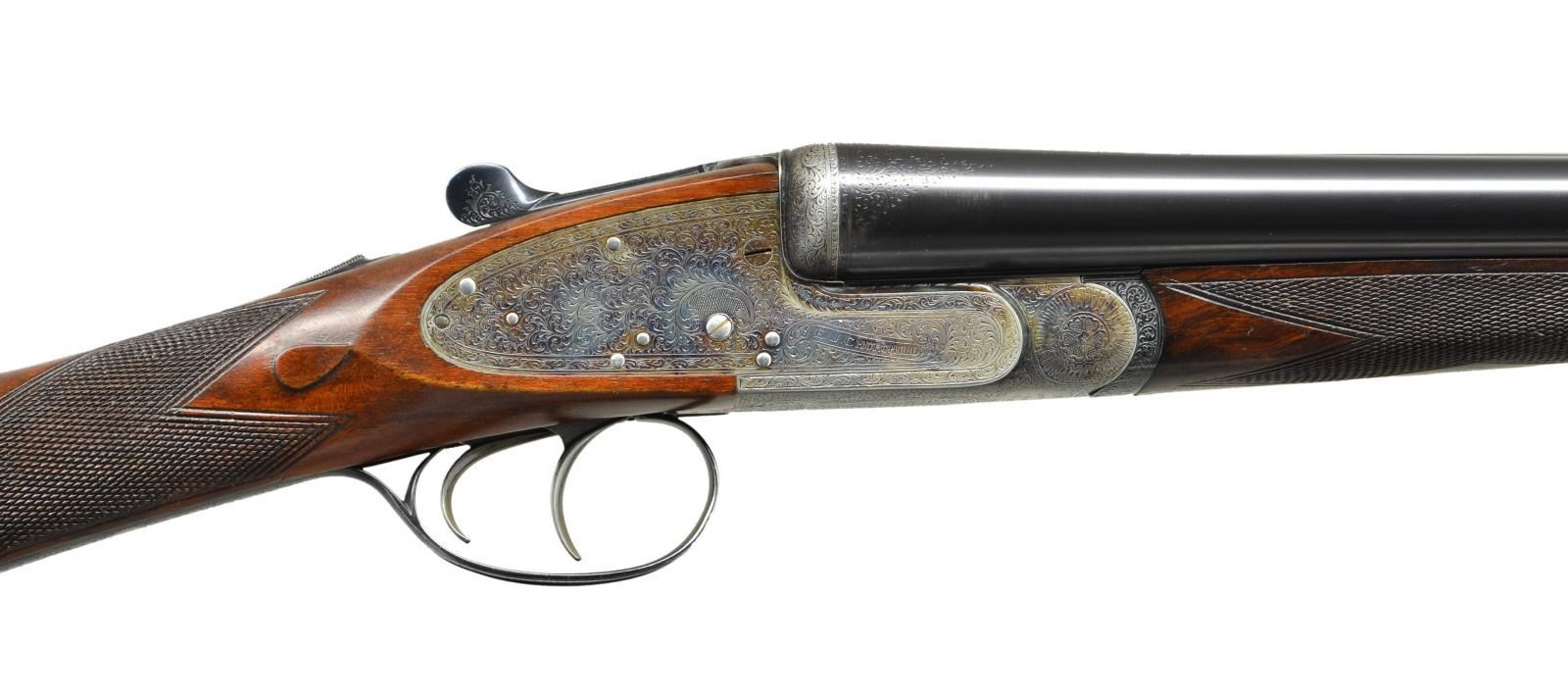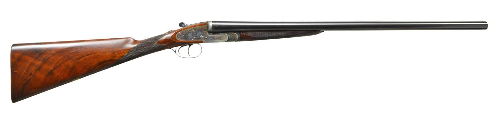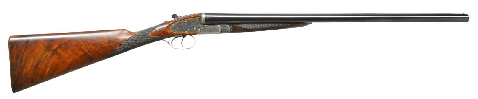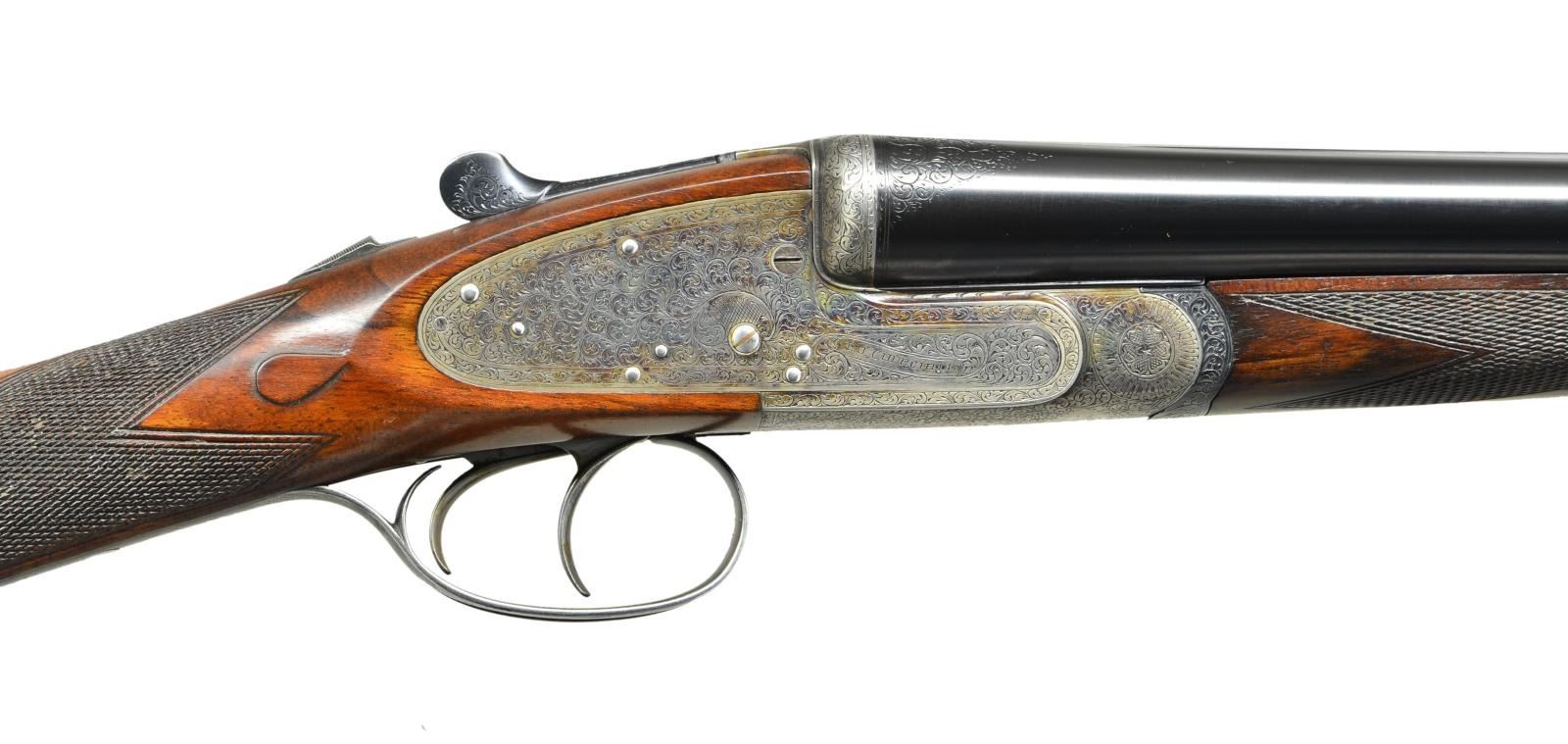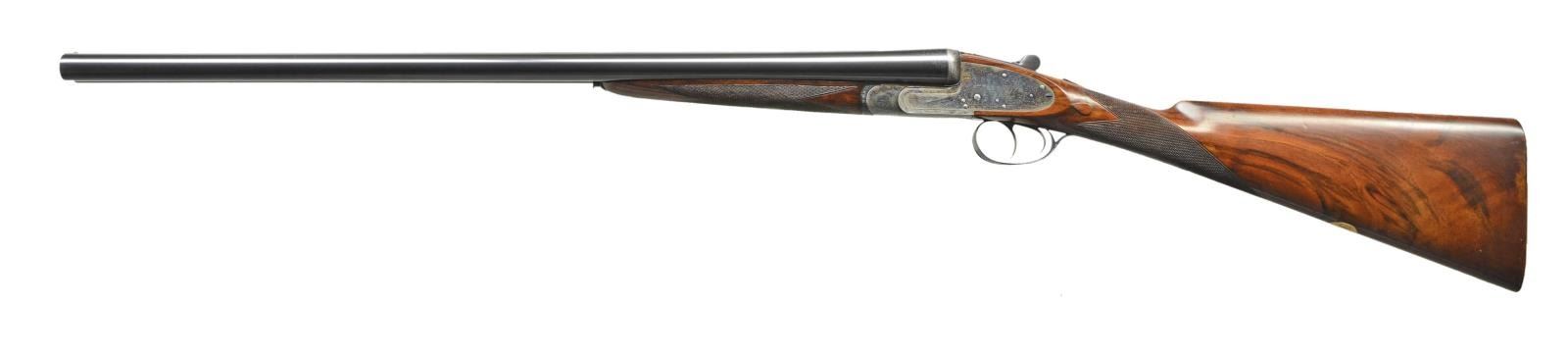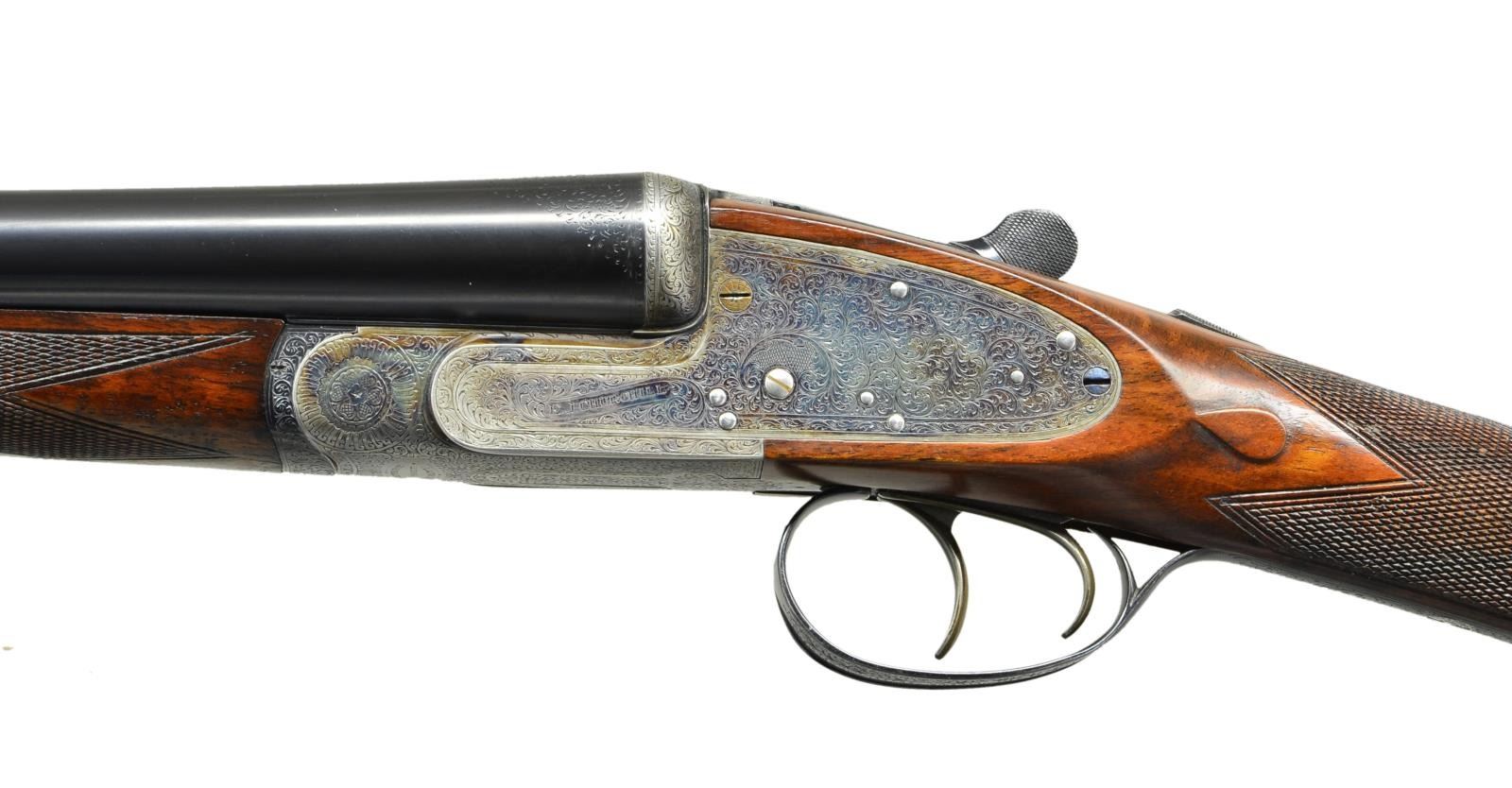 EASY-OPENING SIDELOCK EJECTOR GAME GUNS WITH CASE. Cal. 12 Ga., 2" chambers. S#s 7533/ 7534 (1961). The 25" chopper lump barrels are fitted with slightly raised Churchill ribs, gold inlaid "XXV" and with either "1" or "2" denoting a true pair. These guns are also gold inlaid with "1" or "2" on top levers and forend tips. Tops of barrels are engraved with Churchill name and Orange Street addresses. There are 1 1/4" triangles of scroll at breech ends. There are no markings or inlays visible on exterior of guns to indicate that the chambers are for 2" only. Barrel flats are stamped with British nitro proofs for 2" chambers at 2-3/4 tons per square inch, and ".729". It is interesting to note that gun "7533" has Birmingham proofs, and "7534" has London proofs. Small frame, Baker patent, easy opening, 12/20 type, sidelock actions feature automatic safeties ("SAFE" inlaid in gold), gold line tumbler end cocking indicators, and double triggers. Actions are engraved with full coverage medium scroll within line borders. "E. J. Churchill" is in scroll terminated rib and on each lockplate. "Premiere" "Finest" "Quality" is on bottoms of actions. Blued double beaded trigger guards are also scroll engraved and S#s are on short tangs. Fairly well matched, lightly marbled and figured European walnut straight grip buttstocks measure 15 1/4" over checkered wood butts, and feature typical drop points, point pattern checkering, and gold ovals engraved "R. W. C." Matching splinter ejector forends have Anson releases. MEASUREMENTS: BBLS: Gun no. "1": Bore diameter: L .729". R .729". Bore restrictions: L .019" (mod). R .016" (mod). Wall thickness: L .029". R .029". DAH: 2 1/16". DAC: 1 1/2". CAST: approx 1/2" off. Weight: 5 lbs. 11 oz. LOP: 15 1/4". Gun no. "2": Bore diameter: L .730". R.728". Bore restrictions: L .021" (mod). R .009" (IC). Wall thickness: L .026". R .025". DAH: 2 1/16". DAC: 1 1/2". CAST: approx 1/2" off. Weight: 5 lbs. 12 oz. LOP: 15 1/4". Guns are housed in their original brown leather special Churchill "VC" two gun case with stitched leather corners lined in burgundy cloth with blue label on divider. Case contains two piece cleaning rod with brush and jag, and a "Churchill" marked square oil bottle. CONDITION: very fine, as partially refinished. Barrels retain essentially all of a fine quality reblack, engraving somewhat softened. Action and lockplates retain over 60% of their original case hardening color with loss due to normal hand wear. Right lockplate of gun "2" and color of gun "1" are considerably stronger. Stocks retain nearly all of an old hand rubbed oil finish with a few subsequent marks. Sharp edges are well preserved. Checkering is lightly worn, and has not been recut. Bores are very fine without noted problems. Actions are tight. Barrels are on face. Ejectors are strong and in time. Case leather is darkening, with a number of scuffs and rubs. Handles are beginning to detach, but are still good. Interior cloth is fine with some rubs and soiling. Label is very fine. Accessories are good. Most 2" guns are boxlocks, sidelock guns are scarce. This pair of "Best" sidelocks is exceptionally rare, possibly unique. 2" Cartridges are often available from RST. (22-5641 & 22-5642/MGM). BOTH CURIO. $14,000-20,000.