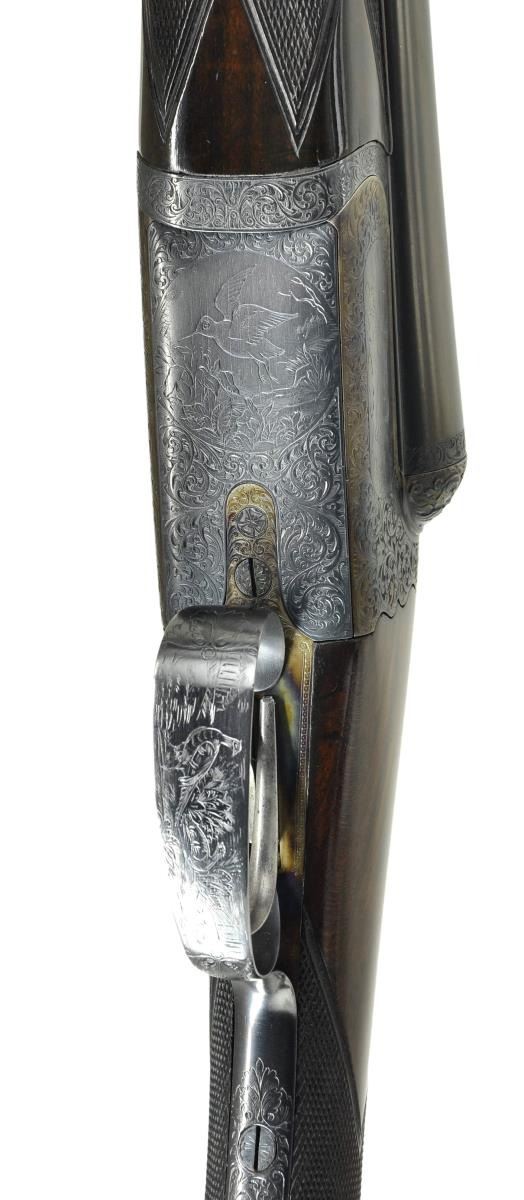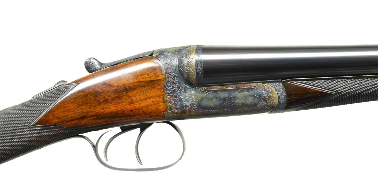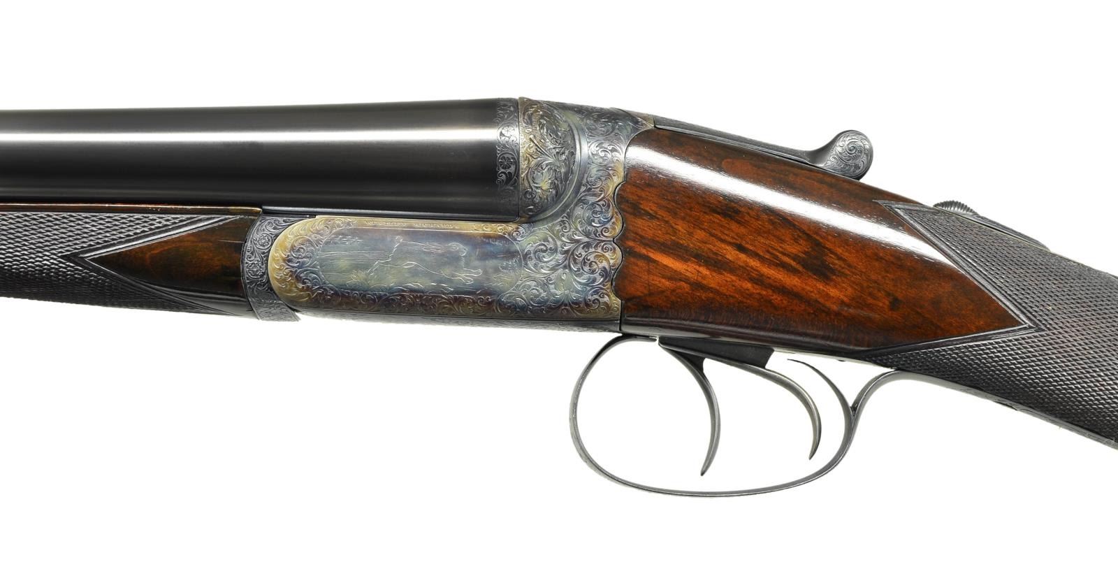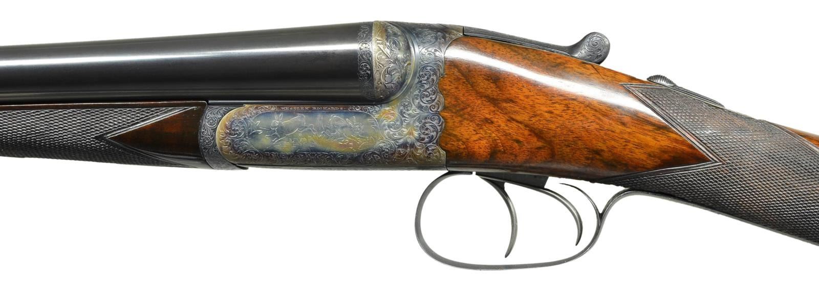 DETACHABLE LOCK EJECTOR GAME GUNS WITH CASE. Cal. 12 Ga., 2 3/4" chambers. 1899 Vintage. S# 15817/15818. The 30" chopper lump barrels are fitted with deeply swamped, narrow, game ribs, and are engraved "WESTLEY RICHARDS 178 NEW BOND ST LONDON." and "WHITWORTH FLUID COMPRESSED STEEL" on tops. Rib extensions are scroll engraved and gold inlaid with "1" or "2". These numbers also appear in gold on top levers and Deeley catches on forends. Barrel flats are stamped with Birmingham black powder proofs and nitro reproofs for 2 1/2? chambers. Bottoms of barrels are stamped with S#s and "WHITWORTH STEEL". Case hardened, scallop backed actions feature automatic safeties ("SAFE" inlaid in gold), bushed strikers, double triggers, and Westley Richards patented sliding third fasteners. Actions are also fitted with very early Deeley patent hand detachable locks. Locks are engine turned and engraved "Patent 17731" and "1897". They are marked for "left" and "right". Floorplates are of early removable type. Water tables are stamped with patent information and use numbers "18" and "19". Actions are embellished in "Deluxe" style with deep chiseled acanthus fences and near full coverage of exceptionally well cut open shaded scroll surrounding rather naive game scenes; gun no. "1" has a single running rabbit on left side, with a pair of rabbits on left side of gun no "2". Right side of gun "1" depicts a trio of pheasant (?) in mountainous background, gun no. "2" has a pair of standing partridges. Circular scenes on trigger plates each depict a single snipe. A pheasant is on trigger guard bow of gun "1", and a trio of grouse on gun "2". "WESTLEY RICHARDS" is on both sides of action on both guns. Well matched, nicely marbled European walnut straight grip buttstocks measure 15" over 1/2" thick checkered horn buttplates. Standard checkering is at grips. Matching splinter Deeley ejector forends have inset horn tips and Deeley releases. UNATTACHED ACCESSORIES: 1993 reprint of "The Westley Richards Firm 1812-1913" by Leslie B. Taylor. MEASUREMENTS: BBLS: Gun no. "1": Bore diameter: L .740". R .734". Bore restrictions: L .031" (full). R .003" (IC). Wall thickness: L .017". R .022". DAH: 2". DAC: 1 9/16". Weight: 6 lbs 8 oz. LOP: 15". BBLS: Gun no. "2": Bore diameter: L .734". R .735". Bore restrictions: L .031" (full). R .002" (IC). Wall thickness: L .023". R .020". DAH: 2 1/8", DAC: 1 9/16". Weight: 6 lbs 10 oz. LOP: 15". Maker's oak and leather case, possibly original, is finished in typical Westley Richards style, has been relined in green cloth with Westley Richards paper labels reinstalled. Case has space for both guns, and contains two old horn buttplates, two pairs of snap caps and a square oil bottle. CONDITION: very fine, as completely refinished, retaining essentially all well done finishes on wood and metal, with a few light handling marks. Engraving slightly softened on blued parts. Bores are bright and shiny with some light striations, and a few light pits. Left barrel of gun "1" is slightly rivilled 10" back from muzzle. Actions are tight. Gun no. "1" is somewhat off face. Gun "2" is on face. Ejectors are slightly out of time on gun "1", in time on gun "2". Case leather is considerably darkened with numerous scuffs and marks. Renewed straps and handle are good. Renewed interior cloth is fine. Original labels are considerably foxed, chipped, and soiled. Book is very fine. (22-5643 & 22-5644/MGM) CURIO. $10,000-15,000.