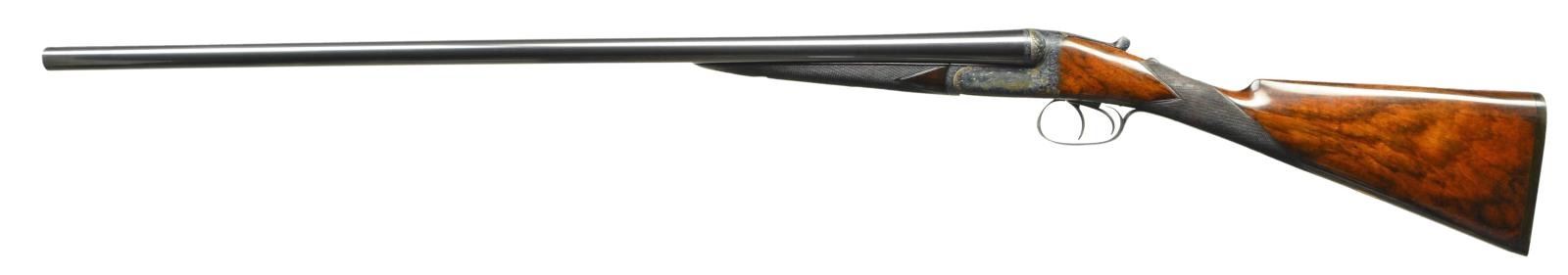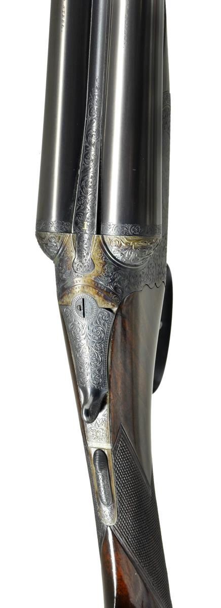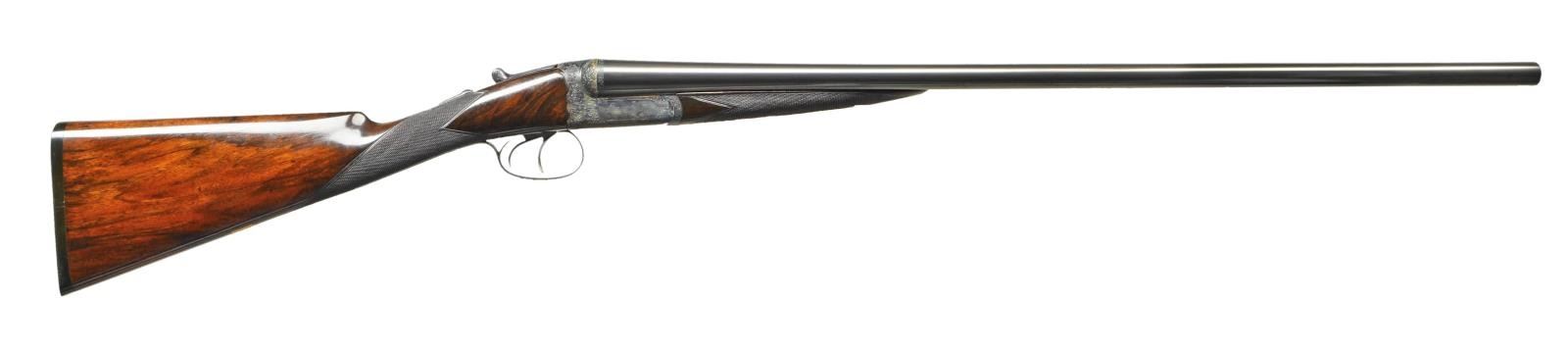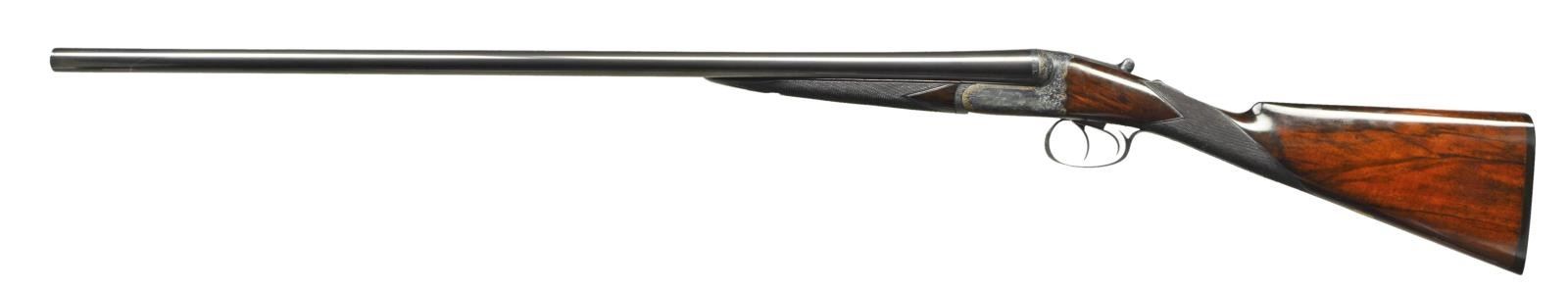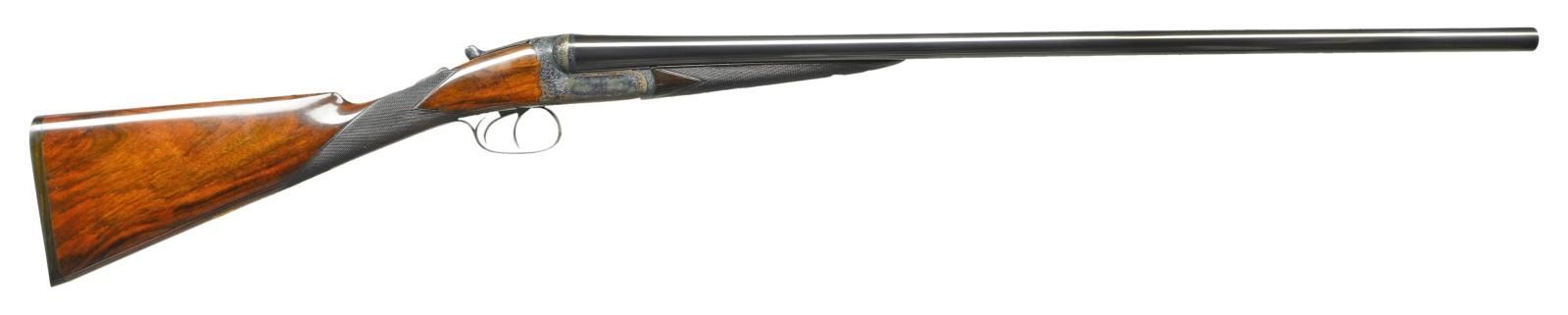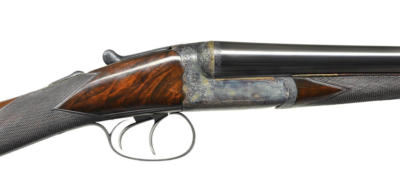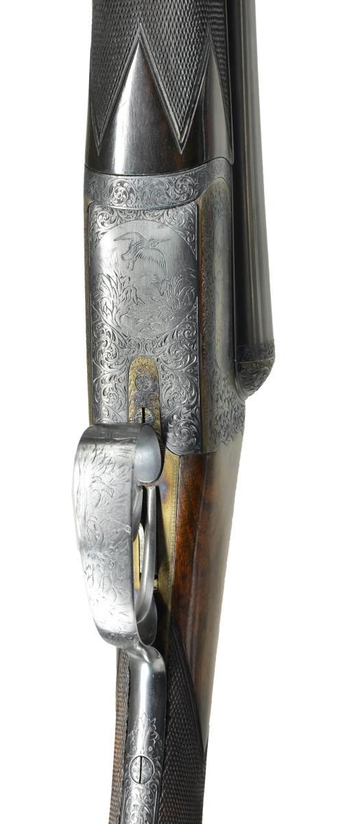 DETACHABLE LOCK EJECTOR GAME GUNS WITH CASE. Cal. 12 Ga., 2 3/4" chambers. 1899 Vintage. S# 15817/15818. The 30" chopper lump barrels are fitted with deeply swamped, narrow, game ribs, and are engraved "WESTLEY RICHARDS 178 NEW BOND ST LONDON." and "WHITWORTH FLUID COMPRESSED STEEL" on tops. Rib extensions are scroll engraved and gold inlaid with "1" or "2". These numbers also appear in gold on top levers and Deeley catches on forends. Barrel flats are stamped with Birmingham black powder proofs and nitro reproofs for 2 1/2? chambers. Bottoms of barrels are stamped with S#s and "WHITWORTH STEEL". Case hardened, scallop backed actions feature automatic safeties ("SAFE" inlaid in gold), bushed strikers, double triggers, and Westley Richards patented sliding third fasteners. Actions are also fitted with very early Deeley patent hand detachable locks. Locks are engine turned and engraved "Patent 17731" and "1897". They are marked for "left" and "right". Floorplates are of early removable type. Water tables are stamped with patent information and use numbers "18" and "19". Actions are embellished in "Deluxe" style with deep chiseled acanthus fences and near full coverage of exceptionally well cut open shaded scroll surrounding rather naive game scenes; gun no. "1" has a single running rabbit on left side, with a pair of rabbits on left side of gun no "2". Right side of gun "1" depicts a trio of pheasant (?) in mountainous background, gun no. "2" has a pair of standing partridges. Circular scenes on trigger plates each depict a single snipe. A pheasant is on trigger guard bow of gun "1", and a trio of grouse on gun "2". "WESTLEY RICHARDS" is on both sides of action on both guns. Well matched, nicely marbled European walnut straight grip buttstocks measure 15" over 1/2" thick checkered horn buttplates. Standard checkering is at grips. Matching splinter Deeley ejector forends have inset horn tips and Deeley releases. UNATTACHED ACCESSORIES: 1993 reprint of "The Westley Richards Firm 1812-1913" by Leslie B. Taylor. MEASUREMENTS: BBLS: Gun no. "1": Bore diameter: L .740". R .734". Bore restrictions: L .031" (full). R .003" (IC). Wall thickness: L .017". R .022". DAH: 2". DAC: 1 9/16". Weight: 6 lbs 8 oz. LOP: 15". BBLS: Gun no. "2": Bore diameter: L .734". R .735". Bore restrictions: L .031" (full). R .002" (IC). Wall thickness: L .023". R .020". DAH: 2 1/8", DAC: 1 9/16". Weight: 6 lbs 10 oz. LOP: 15". Maker's oak and leather case, possibly original, is finished in typical Westley Richards style, has been relined in green cloth with Westley Richards paper labels reinstalled. Case has space for both guns, and contains two old horn buttplates, two pairs of snap caps and a square oil bottle. CONDITION: very fine, as completely refinished, retaining essentially all well done finishes on wood and metal, with a few light handling marks. Engraving slightly softened on blued parts. Bores are bright and shiny with some light striations, and a few light pits. Left barrel of gun "1" is slightly rivilled 10" back from muzzle. Actions are tight. Gun no. "1" is somewhat off face. Gun "2" is on face. Ejectors are slightly out of time on gun "1", in time on gun "2". Case leather is considerably darkened with numerous scuffs and marks. Renewed straps and handle are good. Renewed interior cloth is fine. Original labels are considerably foxed, chipped, and soiled. Book is very fine. (22-5643 & 22-5644/MGM) CURIO. $10,000-15,000.