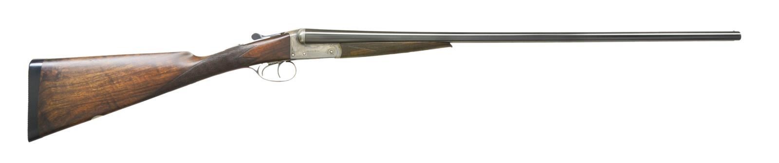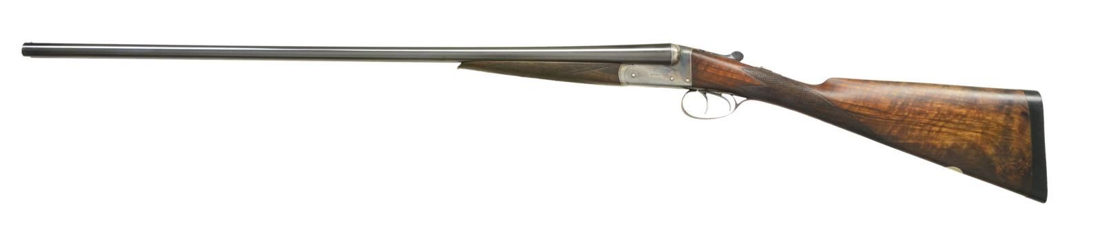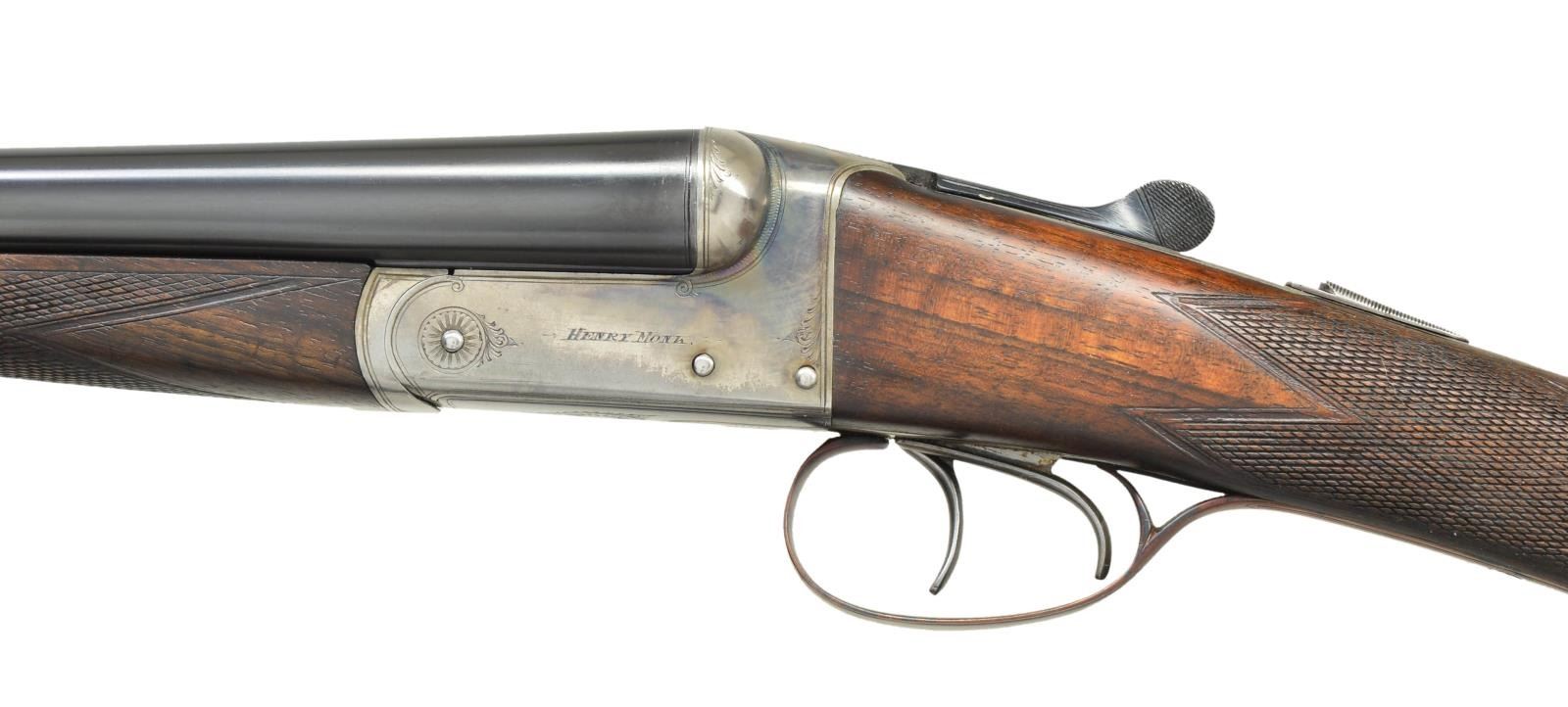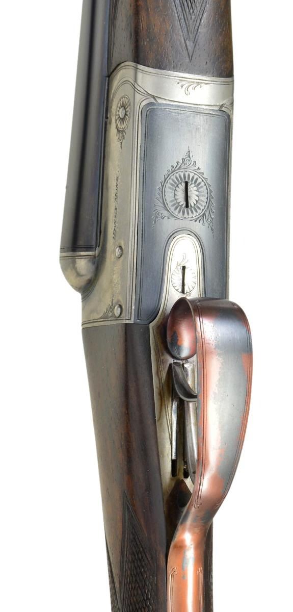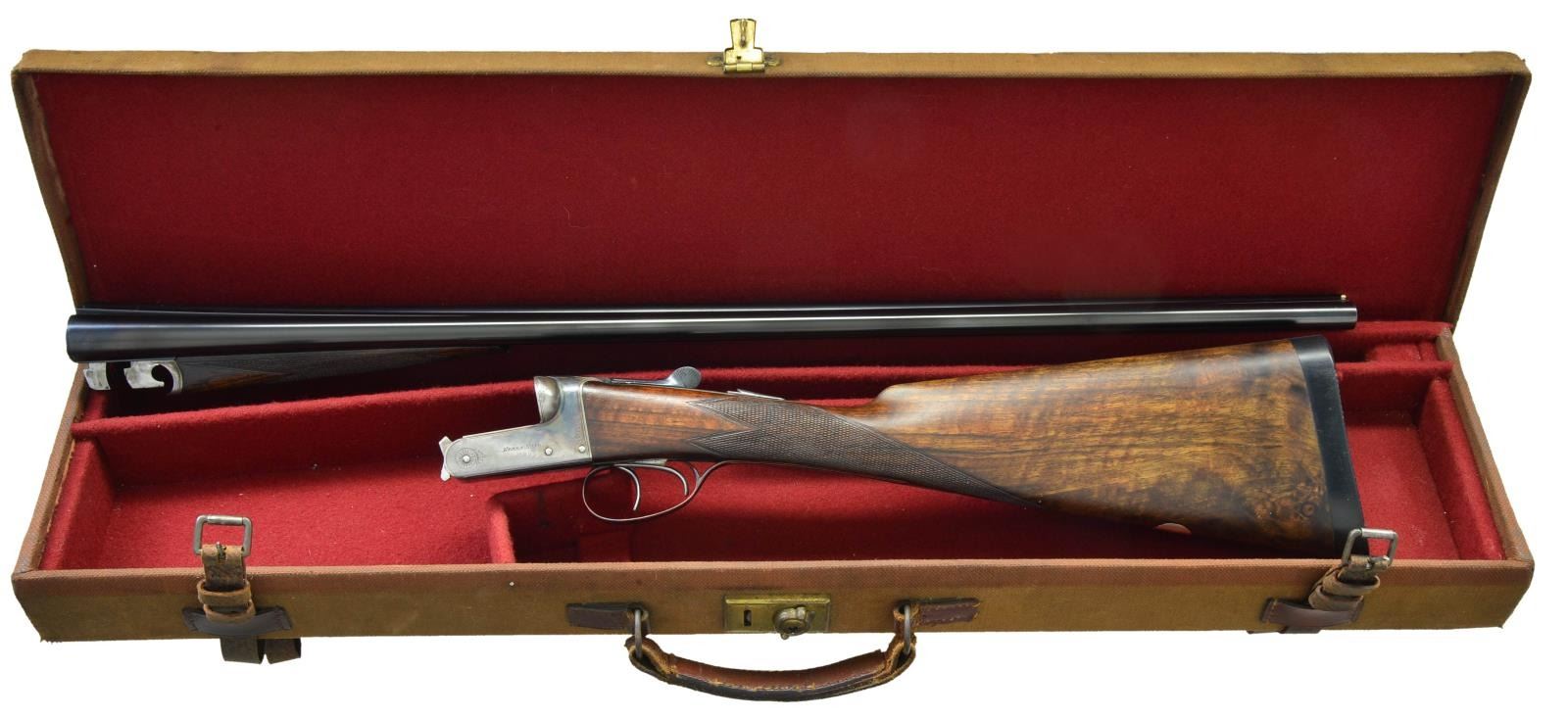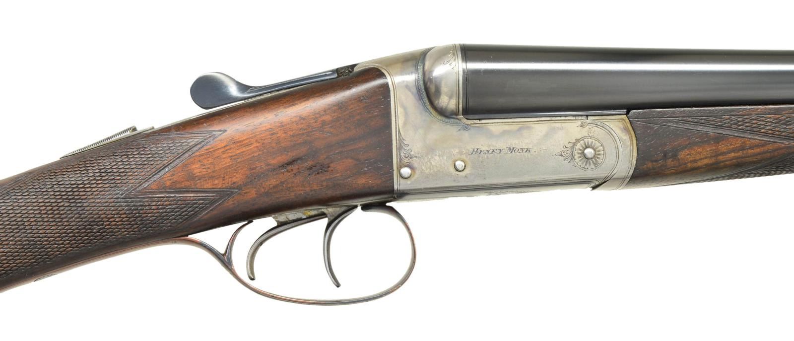 CASE. Cal. 28 Ga., 2 3/4". S# 19243 (1909-24). The 27" dovetailed barrels are engraved "Henry Monk. Foregate St. Chester." on deeply swamped narrow game rib. Barrel flats are stamped with Birmingham nitro proofs and 2013 London reproofs for 2 3/4" chambers. Case hardened small size boxlock action features automatic safety ("SAFE" inlaid in silver) and double triggers. Action is line border engraved and has some sprays of scroll. "Henry Monk" is on each side. Top lever, floorplate and trigger guard are blued and have matching engraving. S# is on trigger guard tang. Attractively fiddle figured and lightly streaked European walnut straight grip buttstock measures 14 7/8" over 3/4" thick checkered hard rubber buttplate. Flat top point pattern checkering is at grip and a vacant silver oval is on toeline. Matching splinter forend with fancy filed steel tip has spring tension release. MEASUREMENTS: BBLS: Bore Diameter: L .551". R .550". Restriction: L .013" (mod). R .000" (cyl). Wall thickness: L .023". R .021". STOCK: DAH: 2 1/8". DAC: 1 1/2". CAST: neutral. LOP: 14 7/8". WEIGHT: 4 lb. 15 oz. UNATTACHED ACCESSORIES: gun is housed in vintage brown canvas case lined in burgundy cloth. CONDITION: fine as mostly refinished. Barrels retaining nearly all fine quality reblack. Action retains approximately 40% original case hardening color, balance showing normal hand wear to silver gray. Top lever, floorplate and trigger plate reblued showing some light marks. Blue of trigger guard is nearly all a copper color. Stocks retain nearly all of an oil refinish with some scattered subsequent marks. Checkering lightly worn, has not been recut. Bores are bright and shiny, without any noted problems. Action is tight. Exterior of case shows some staining and rubs. Straps and handle are good. Interior cloth is very fine as renewed. A great little quail or woodcock gun. (23-453/MGM). CURIO. $4,000-6,000.