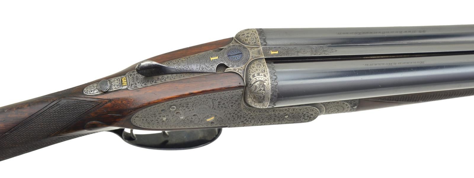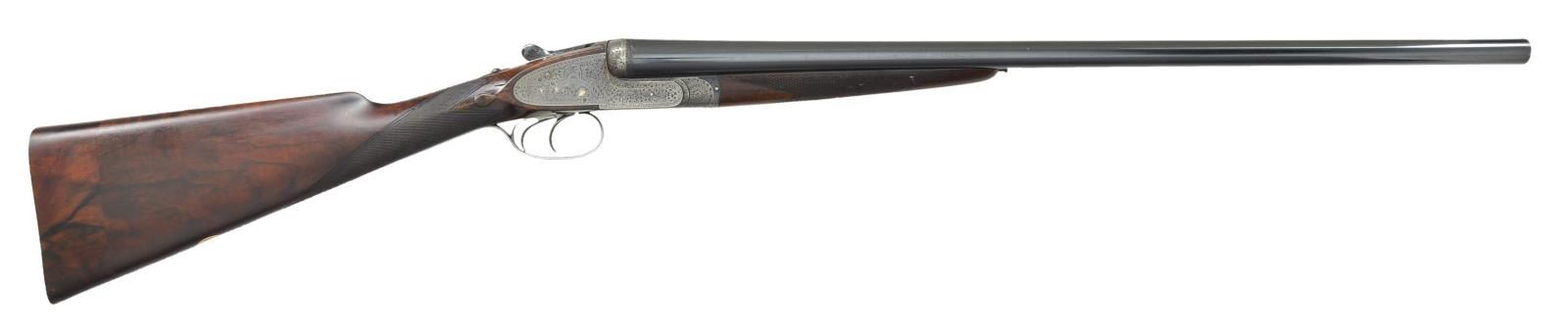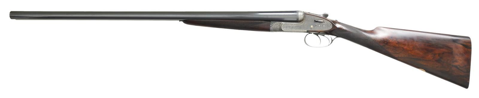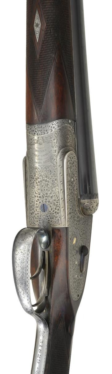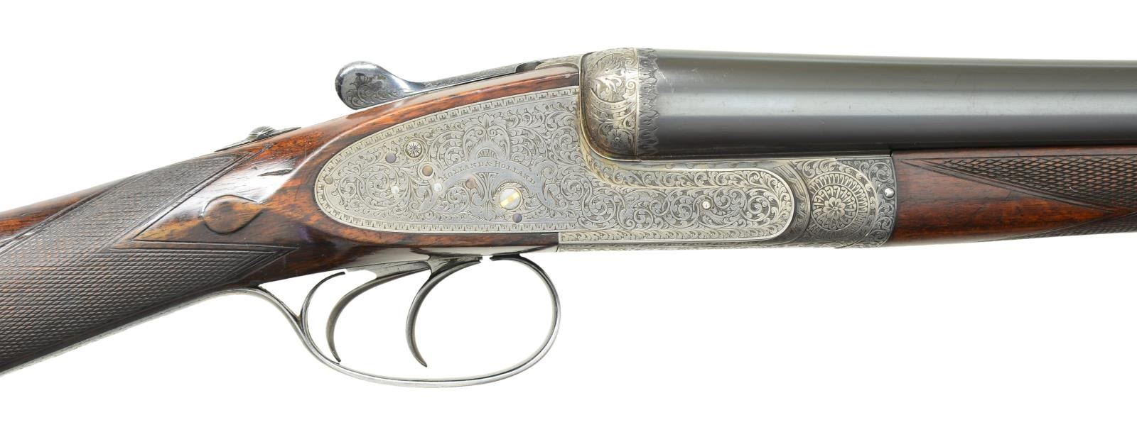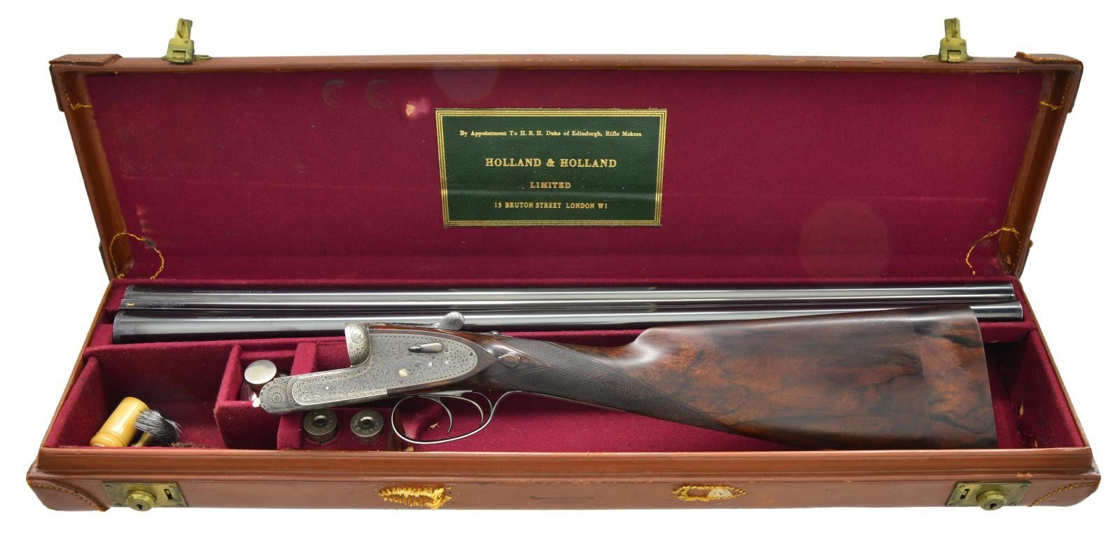 SIDELOCK EJECTOR GAME GUN WITH CASE. Cal. 12 Ga., 2 1/2". S# 31829 (1928). The 26 1/2" chopper lump barrels fitted with swamped game rib are engraved "Holland & Holland." "98. New Bond Street London" on tops. Rear portion of rib is gold inlaid "1". Matching numeral is top lever and forend tip. Barrel flats are stamped with London nitro proofs for 2 1/2" chambers. Holland patent self opening assist spring is installed. Case hardened "Royal" sidelock action features automatic safety ("SAFE" inlaid in gold). Hand detachable sidelocks, gold band tumbler end cocking indicators and double triggers. Action is engraved in classic "Royal" style with full coverage well cut varying sized shaded scroll. "Holland & Holland" is in classic arched device on each lockplate. Bottom of action is engraved "ROYAL""SELF-OPENER""PATENT 1922". Fences are engraved with acanthus at centers flanked by strap work and floral scroll. Blued top lever is engraved "ROYAL""EJECTOR". Single beaded trigger guard with scroll on bow has S# on short tang. Lightly figured and well marbled European walnut straight grip buttstock measures 14 3/4" over checkered wood butt on 3" lengthening piece that is fairly well matched. Stock features drop points, point pattern checkering on diamond hand and gold oval engraved "L.S.G.". Matching splinter ejector forend has Anson release. MEASUREMENTS: BBLS: Bore Diameter: L .732". R .0733". Restriction: L.018" (mod). R .004" (IC). Wall thickness: L .028". R .026". STOCK: DAH: 2 5/16". DAC: 1 7/16". CAST: about 5/8" off. LOP: 14 3/4". WEIGHT: 6 lb. 6 oz. UNATTACHED ACCESSORIES: gun is housed in vintage "VC" case with stitched leather corners by Abercrombie & Fitch. Case is lined in burgundy cloth. It has green 13 Bruton Street H&H label in lid. Case contains square oil bottle, A&F snap caps and a bone striker bottle with this guns S# containing strikers. CONDITION: fine as partially refurbished. Barrels retaining about 90% original blue with a scattering of marks and scratches. Action retains about 30% of its case hardening color, lockplates retain most of their color. Most original blue remains on top lever. Trigger guard retains only about 20% blue the balance being silver gray. Stocks retain most of what appears to be their original finish. Buttstock with added oil with installation of lengthening piece. Checkering partially recut on buttstock, forend checkering remains original with moderate wear. Bores are bright and shiny without noted problems, action is tight, barrels are on face, ejectors are strong and in time. Case leather is still light in color but is crazed, rubbed, has tape marks and handle missing. Interior cloth is good with soiling and rubs, some through. Label is good, accessories are good. (22-5637/MGM). CURIO. $8,000-12,000.