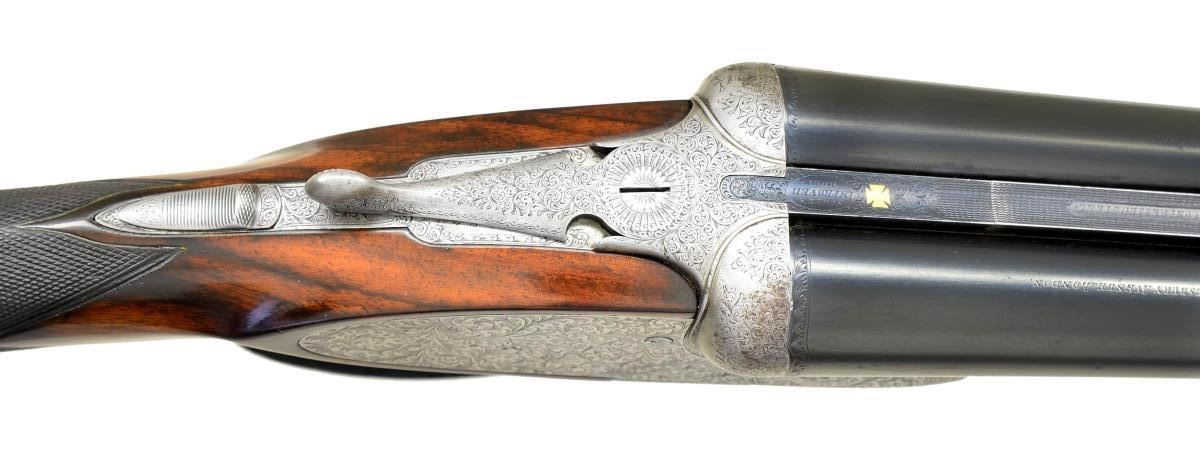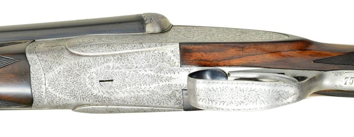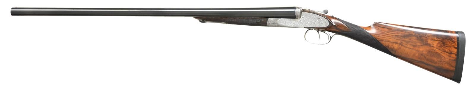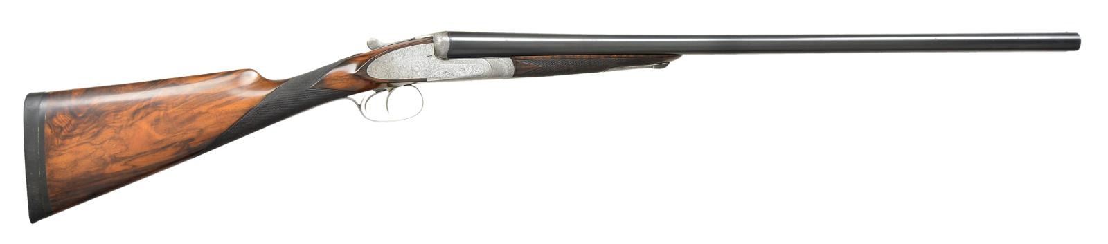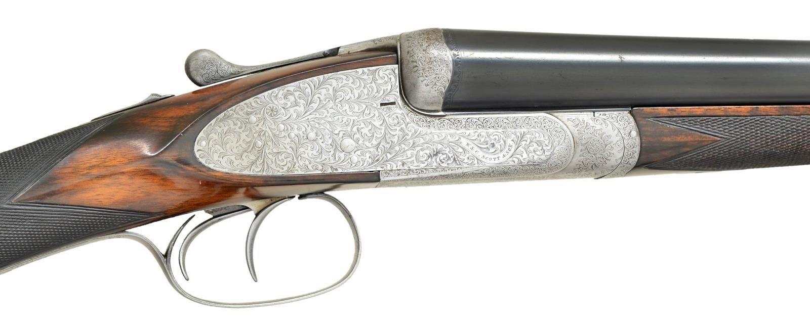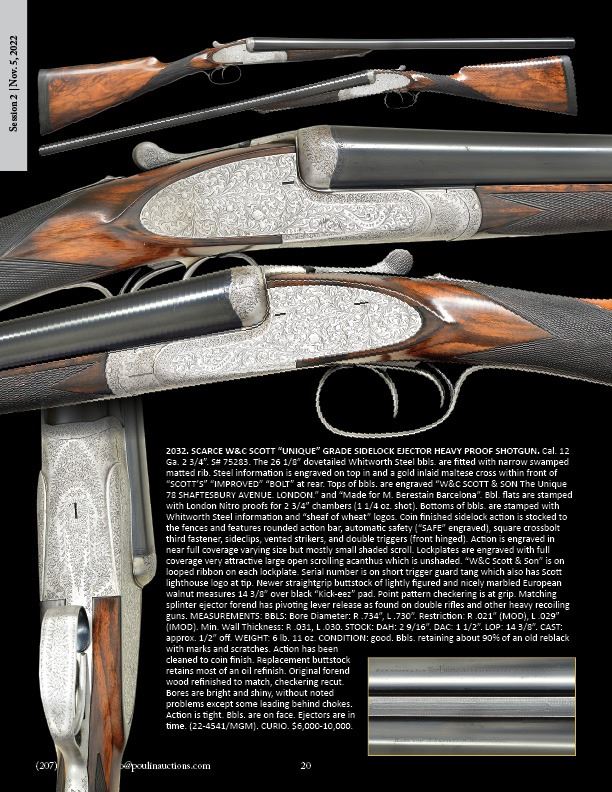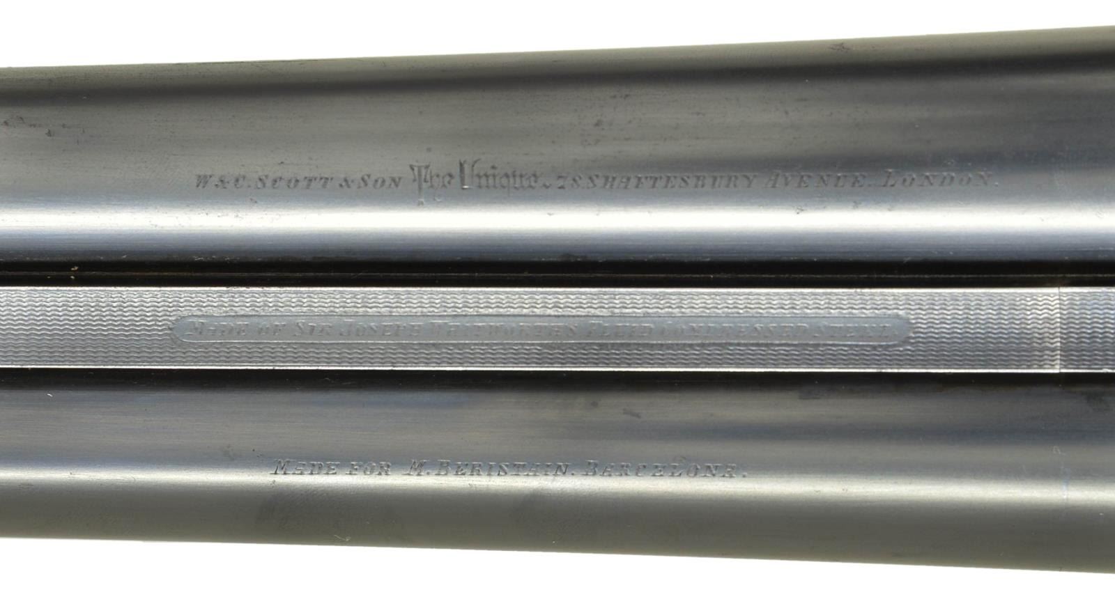 HEAVY PROOF SHOTGUN. Cal. 12 Ga. 2 3/4". S# 75283. The 26 1/8" dovetailed Whitworth Steel bbls. are fitted with narrow swamped matted rib. Steel information is engraved on top in and a gold inlaid maltese cross within front of "SCOTT'S" "IMPROVED" "BOLT" at rear. Tops of bbls. are engraved "W&C SCOTT & SON The Unique 78 SHAFTESBURY AVENUE. LONDON." and "Made for M. Berestain Barcelona". Bbl. flats are stamped with London Nitro proofs for 2 3/4" chambers (1 1/4 oz. shot). Bottoms of bbls. are stamped with Whitworth Steel information and "sheaf of wheat" logos. Coin finished sidelock action is stocked to the fences and features rounded action bar, automatic safety ("SAFE" engraved), square crossbolt third fastener, sideclips, vented strikers, and double triggers (front hinged). Action is engraved in near full coverage varying size but mostly small shaded scroll. Lockplates are engraved with full coverage very attractive large open scrolling acanthus which is unshaded. "W&C Scott & Son" is on looped ribbon on each lockplate. Serial number is on short trigger guard tang which also has Scott lighthouse logo at tip. Newer straightgrip buttstock of lightly figured and nicely marbled European walnut measures 14 3/8" over black "Kick-eez" pad. Point pattern checkering is at grip. Matching splinter ejector forend has pivoting lever release as found on double rifles and other heavy recoiling guns. MEASUREMENTS: BBLS: Bore Diameter: R .734", L .730". Restriction: R .021" (MOD), L .029" (IMOD). Min. Wall Thickness: R .031, L .030. STOCK: DAH: 2 9/16". DAC: 1 1/2". LOP: 14 3/8". CAST: approx. 1/2" off. WEIGHT: 6 lb. 11 oz. CONDITION: good. Bbls. retaining about 90% of an old reblack with marks and scratches. Action has been cleaned to coin finish. Replacement buttstock retains most of an oil refinish. Original forend wood refinished to match, checkering recut. Bores are bright and shiny, without noted problems except some leading behind chokes. Action is tight. Bbls. are on face. Ejectors are in time. (22-4541/MGM). CURIO. $4,000-6,000.