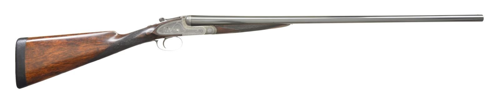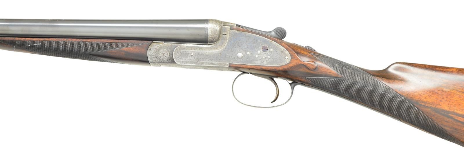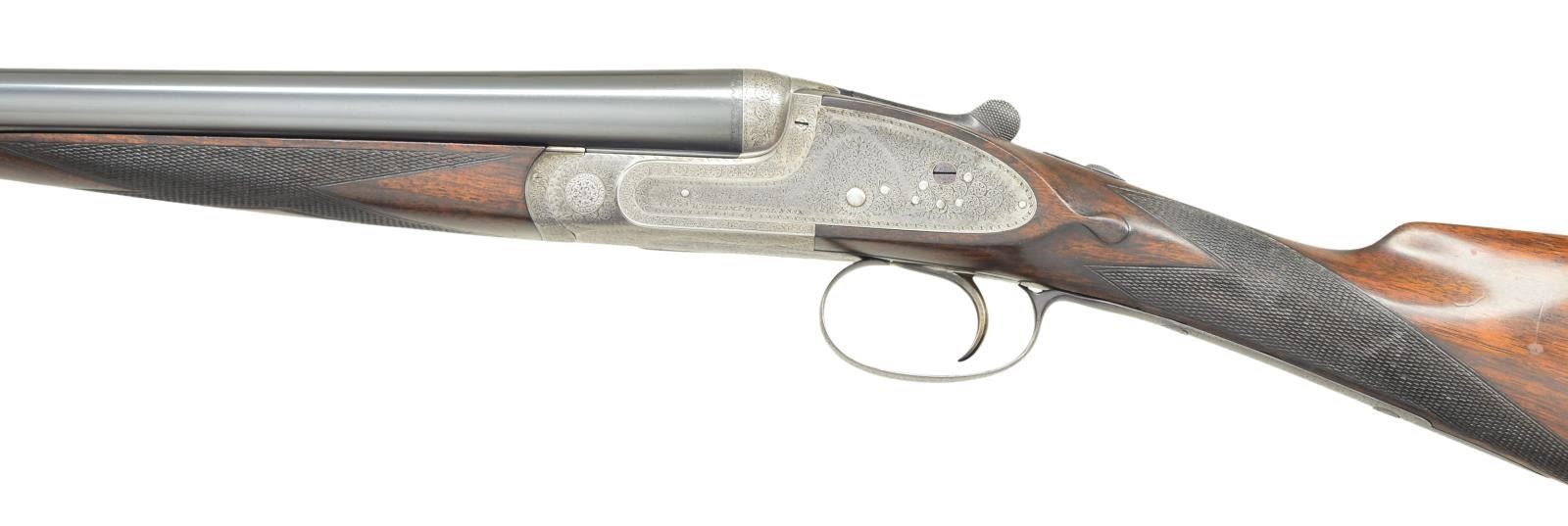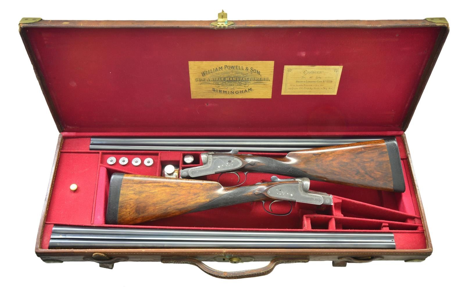 EJECTOR SINGLE TRIGGER GAME GUNS WITH CASE. Cal. 16 Ga., 2 3/4" both. S# 12084/12085 (1909). The 28" dovetailed barrels are engraved "William Powell & Son, 35, Carr's Lane, Birmingham" on narrow game ribs. Rib extensions with scroll engraving are gold inlaid "1" & "2" (matching numbers are on top levers and forend tips). Barrel flats are stamped with Birmingham nitro proofs for 16 Ga. and 1 oz. of shot. S#s are on bottoms of barrels. Case hardened square back sidelock actions feature automatic safetys ("SAFE" inlaid in gold) and single non selective triggers. Actions and locks are engraved with near full coverage, very well cut shaded scroll. Maker's name is on each lockplate. Blued top levers, trigger plates and trigger guards are engraved with matching scroll. S#s are on trigger guard tangs. Well matched straight grip buttstocks of nicely marbled European walnut have different lengths of pull. Gun No. "1" measures 14", Gun No. "2" measures 13 3/4" both over black leather covered pads. Stocks also feature drop points, vacant silver ovals and point pattern checkering on semi diamond hands. Matching splinter ejector forends have Anson releases. MEASUREMENTS: BBLS: Bore Diameter: Gun No. "1" L .670". R .670". Restriction: L .027" (mod) R .006" (IC). Wall thickness: L .022". R .026". STOCK: DAH: 2 3/16". DAC: 1 1/2". CAST: neutral. LOP: 14". WEIGHT: 5 lb. 15 oz. BBLS: Bore Diameter Gun No. "2" L .669". R .671". Restriction: L .013" (light mod) R .003" (IC). Wall thickness: L .028". R .022". STOCK: DAH: 2 3/16". DAC: 1 1/2". CAST: very slightly off. LOP: 13 3/4". WEIGHT: 5 lb. 15 oz. UNATTACHED ACCESSORIES: guns are housed in what appears to be their original leather two gun case with shaped brass corners. Top is embossed "E.M.Z." and has some steamship labels affixed. Interior is lined in scarlet cloth. A paper William Powell label is in lid along with charge card for these particular guns; indicating a charge of 7/8 oz. shot. Case contains two pair of Powell marked snap caps, a square oil bottle and a striker bottle. A covered compartment with brass knob holds a 16 Ga. broken case extractor and two keys one of which locks case. CONDITION: good to very good as partially refinished. Barrels retaining nearly all of an old reblack, engraving considerably softened. Actions retain traces of original case hardening color where protected, lock plates retain about 40% color. Top levers, trigger plates and trigger guards reblued retaining nearly all that blue; engraving quite soft on trigger guard tang. Stocks retain nearly all of an oil refinish with a fair number of small subsequent marks. Checkering has not been recut and shows wear. Silver ovals dented. Bores are bright and shiny, without noted problems, actions are tight, barrels are on face, ejectors are in time, mechanical triggers appear to work well. Case leather is still relatively light and has many marks and rubs, straps and handles are good. Interior cloth is fine with compressions and some reblocking. Labels are good, lightly foxed, accessories are good. A serviceable pair of light weight small bore British guns. (22-5645 & 22-5646/MGM). CURIO. $9,000-15,000.