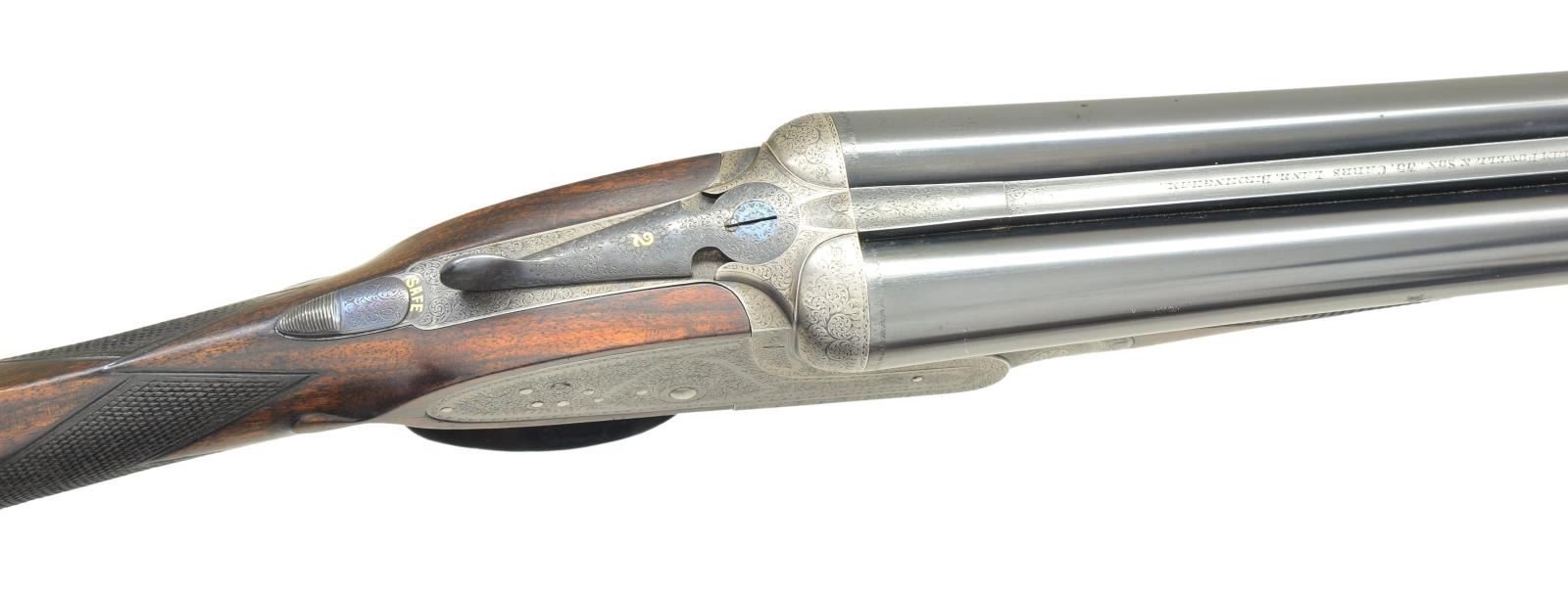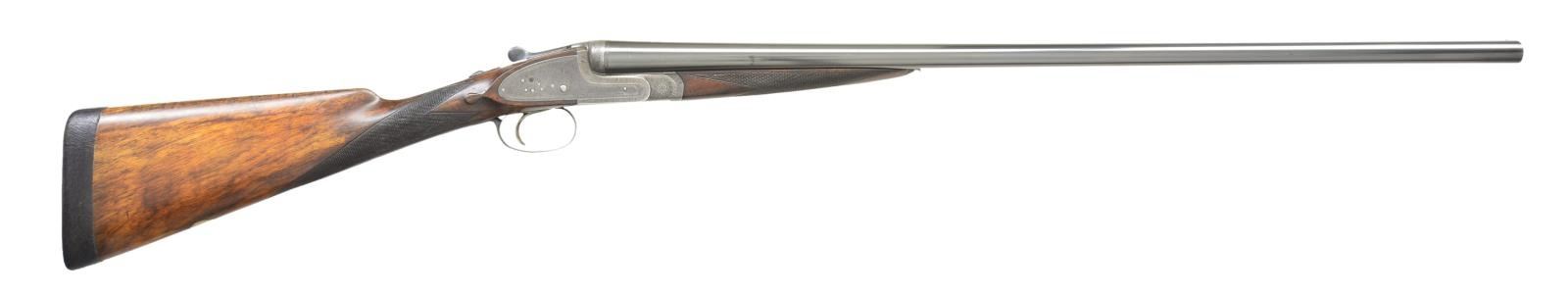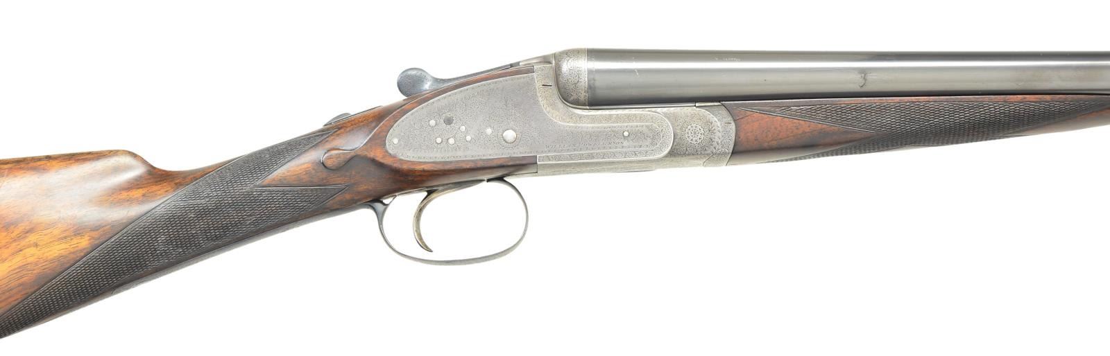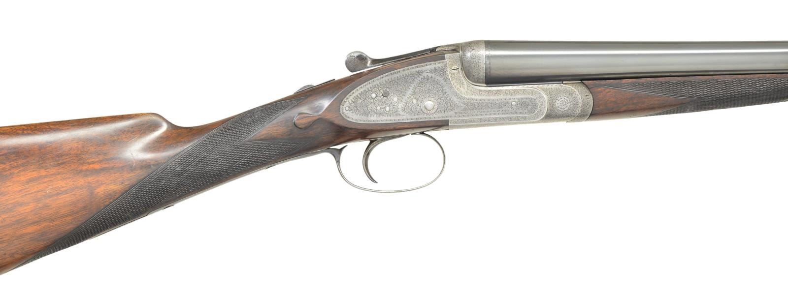 EJECTOR SINGLE TRIGGER GAME GUNS WITH CASE. Cal. 16 Ga., 2 3/4" both. S# 12084/12085 (1909). The 28" dovetailed barrels are engraved "William Powell & Son, 35, Carr's Lane, Birmingham" on narrow game ribs. Rib extensions with scroll engraving are gold inlaid "1" & "2" (matching numbers are on top levers and forend tips). Barrel flats are stamped with Birmingham nitro proofs for 16 Ga. and 1 oz. of shot. S#s are on bottoms of barrels. Case hardened square back sidelock actions feature automatic safetys ("SAFE" inlaid in gold) and single non selective triggers. Actions and locks are engraved with near full coverage, very well cut shaded scroll. Maker's name is on each lockplate. Blued top levers, trigger plates and trigger guards are engraved with matching scroll. S#s are on trigger guard tangs. Well matched straight grip buttstocks of nicely marbled European walnut have different lengths of pull. Gun No. "1" measures 14", Gun No. "2" measures 13 3/4" both over black leather covered pads. Stocks also feature drop points, vacant silver ovals and point pattern checkering on semi diamond hands. Matching splinter ejector forends have Anson releases. MEASUREMENTS: BBLS: Bore Diameter: Gun No. "1" L .670". R .670". Restriction: L .027" (mod) R .006" (IC). Wall thickness: L .022". R .026". STOCK: DAH: 2 3/16". DAC: 1 1/2". CAST: neutral. LOP: 14". WEIGHT: 5 lb. 15 oz. BBLS: Bore Diameter Gun No. "2" L .669". R .671". Restriction: L .013" (light mod) R .003" (IC). Wall thickness: L .028". R .022". STOCK: DAH: 2 3/16". DAC: 1 1/2". CAST: very slightly off. LOP: 13 3/4". WEIGHT: 5 lb. 15 oz. UNATTACHED ACCESSORIES: guns are housed in what appears to be their original leather two gun case with shaped brass corners. Top is embossed "E.M.Z." and has some steamship labels affixed. Interior is lined in scarlet cloth. A paper William Powell label is in lid along with charge card for these particular guns; indicating a charge of 7/8 oz. shot. Case contains two pair of Powell marked snap caps, a square oil bottle and a striker bottle. A covered compartment with brass knob holds a 16 Ga. broken case extractor and two keys one of which locks case. CONDITION: good to very good as partially refinished. Barrels retaining nearly all of an old reblack, engraving considerably softened. Actions retain traces of original case hardening color where protected, lock plates retain about 40% color. Top levers, trigger plates and trigger guards reblued retaining nearly all that blue; engraving quite soft on trigger guard tang. Stocks retain nearly all of an oil refinish with a fair number of small subsequent marks. Checkering has not been recut and shows wear. Silver ovals dented. Bores are bright and shiny, without noted problems, actions are tight, barrels are on face, ejectors are in time, mechanical triggers appear to work well. Case leather is still relatively light and has many marks and rubs, straps and handles are good. Interior cloth is fine with compressions and some reblocking. Labels are good, lightly foxed, accessories are good. A serviceable pair of light weight small bore British guns. (22-5645 & 22-5646/MGM). CURIO. $9,000-15,000.
