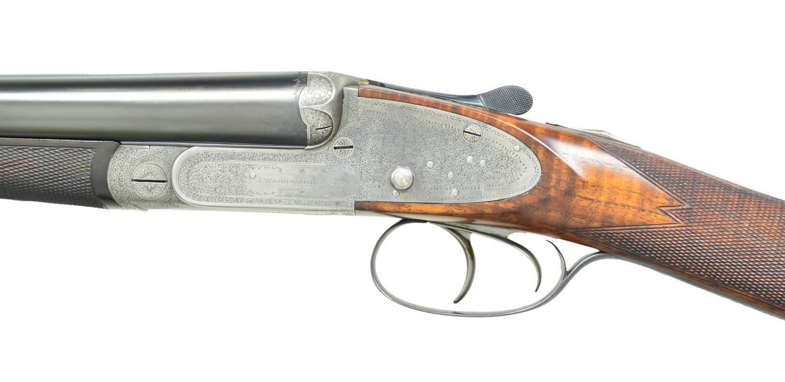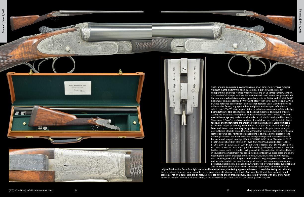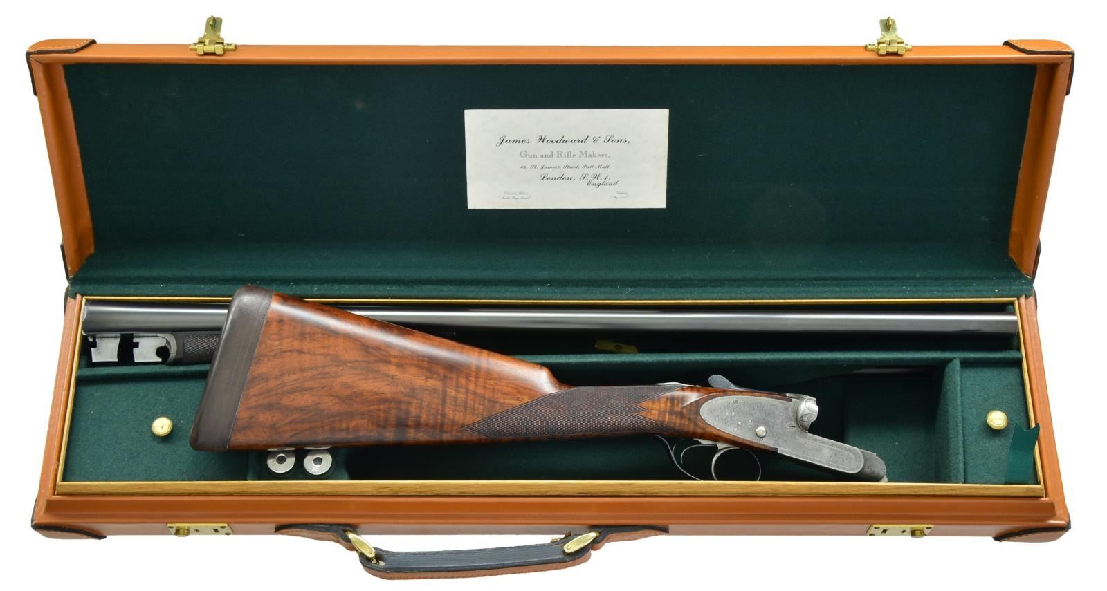 EJECTOR DOUBLE TRIGGER GAME GUN WITH CASE. Cal. 20 Ga., 2 1/2". S# 4851. Bbls. 26" chopperlump, engraved "James Woodward & Sons 64 St. James's Street, London. S.W. Made of Sir Joseph Whitworth's Fluid Pressed Steel" on narrow game rib. Bbl. flats are stamped with London black powder proofs for 20 Ga. and "CHOKE EC34". Bottoms of bbls. are stamped "Whitworth Steel" with serial numbers and "J. W. & S". Case hardened square back sidelock action features usual Woodward styling with arcaded fences, bug eye tumbler end pivots and T-shaped safety button which coverS "SAFE" inlaid in gold. Action also features automatic safety, sideclips, bushed strikers, gold band tumbler end cocking indicators and double triggers. Action and lockplates are engraved in usual Woodward "best" house style with near full coverage very well cut small shaded scroll within small scroll borders. "J. Woodward & Sons" is in classic parchment scroll device on each lockplate. Blued top lever and trigger guard are engraved with matching scroll. Serial number is in relief on trigger guard tang. The number "1" is gold inlaid on rear of rib, top lever, and forend iron, denoting this gun is number 1 of a pair. Newer straight grip buttstock of fiddle figured European(?) walnut measures 14 1/8" over brown leather covered pad. Point pattern checkering is at grip. Splinter ejector forend with original wood has about 80% checkering coverage and Anson release with button in well shaped steel tip. MEASUREMENTS: BBLS: Bore Diameter: R .622", L .622". Restriction: R 0" (CYL), L 0" (CYL). Min. Wall Thickness: R .020", L .021". STOCK: DAH: 2". DAC: 1 1/2". LOP: 14 1/8". CAST: approx. 1/2" off. WEIGHT: 5 lb. 7 oz. UNATTACHED ACCESSORIES: gun is housed in good quality leather VC case with leather corners which is lined in dark green cloth. Reproduction Woodward label is in lid. Bottom compartment has oak lining and contains two piece brass and ebony cleaning rod, pair of snapcaps and oil bottle. CONDITION: fine as refurbished. Bbls. retaining nearly all of a good quality reblack, engraving remains clear. Action and lockplates retain traces of their original muted case hardening color where protected, but is mostly a pleasing pewter gray. Top lever and trigger guard reblued and retain most of that blue. Newer buttstock retains most of what may be its original finish with a few minor light marks. Pad is relatively new, checkering appears to be recut. Forend checkering has definitely been recut and there are some minor losses to wood along bbl. channel on left side. Bores are bright and shiny, without noted problems. Action is tight. Bbls. are on face. Ejectors are strong and in time. Relatively new case is very fine with only a few minor marks on exterior. Interior is also extra fine, as are accessories. (01-21787/MGM). ANTIQUE. $14,000-18,000.