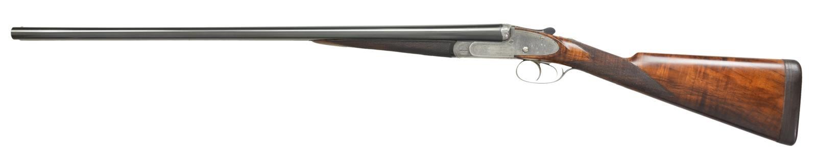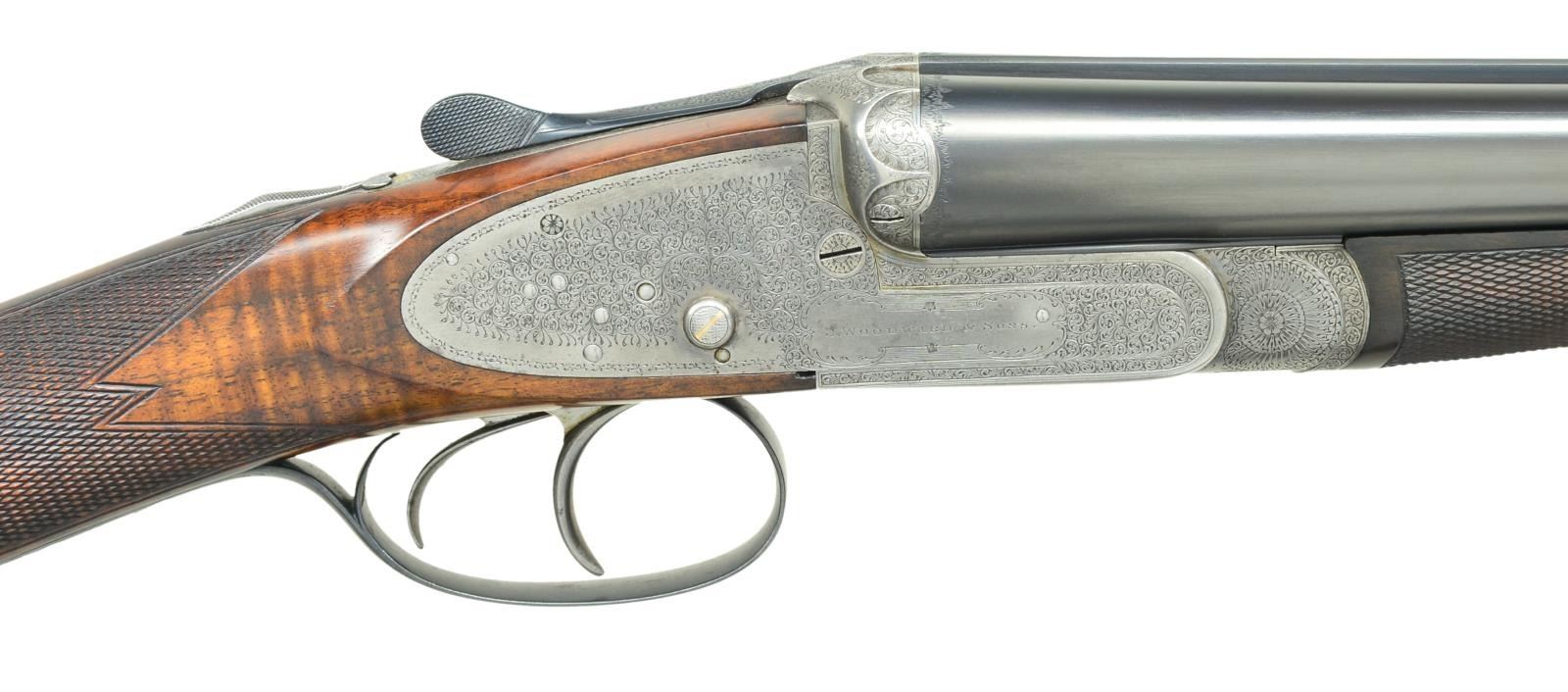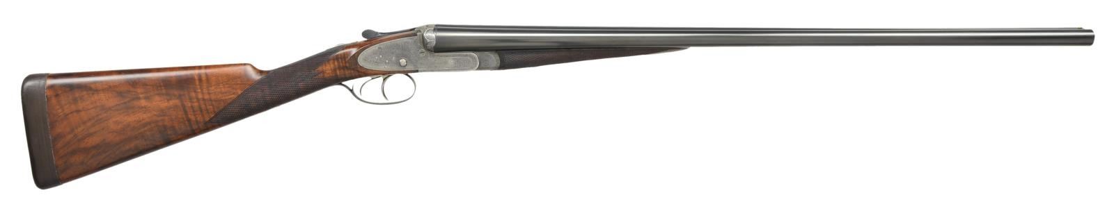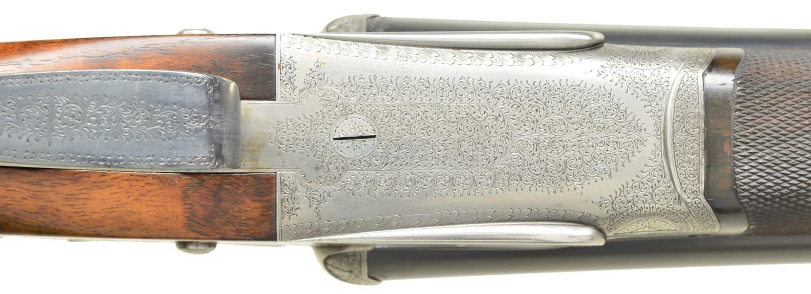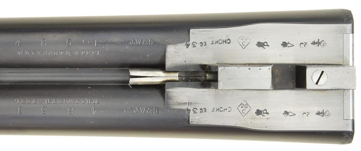 EJECTOR DOUBLE TRIGGER GAME GUN WITH CASE. Cal. 20 Ga., 2 1/2". S# 4851. Bbls. 26" chopperlump, engraved "James Woodward & Sons 64 St. James's Street, London. S.W. Made of Sir Joseph Whitworth's Fluid Pressed Steel" on narrow game rib. Bbl. flats are stamped with London black powder proofs for 20 Ga. and "CHOKE EC34". Bottoms of bbls. are stamped "Whitworth Steel" with serial numbers and "J. W. & S". Case hardened square back sidelock action features usual Woodward styling with arcaded fences, bug eye tumbler end pivots and T-shaped safety button which coverS "SAFE" inlaid in gold. Action also features automatic safety, sideclips, bushed strikers, gold band tumbler end cocking indicators and double triggers. Action and lockplates are engraved in usual Woodward "best" house style with near full coverage very well cut small shaded scroll within small scroll borders. "J. Woodward & Sons" is in classic parchment scroll device on each lockplate. Blued top lever and trigger guard are engraved with matching scroll. Serial number is in relief on trigger guard tang. The number "1" is gold inlaid on rear of rib, top lever, and forend iron, denoting this gun is number 1 of a pair. Newer straight grip buttstock of fiddle figured European(?) walnut measures 14 1/8" over brown leather covered pad. Point pattern checkering is at grip. Splinter ejector forend with original wood has about 80% checkering coverage and Anson release with button in well shaped steel tip. MEASUREMENTS: BBLS: Bore Diameter: R .622", L .622". Restriction: R 0" (CYL), L 0" (CYL). Min. Wall Thickness: R .020", L .021". STOCK: DAH: 2". DAC: 1 1/2". LOP: 14 1/8". CAST: approx. 1/2" off. WEIGHT: 5 lb. 7 oz. UNATTACHED ACCESSORIES: gun is housed in good quality leather VC case with leather corners which is lined in dark green cloth. Reproduction Woodward label is in lid. Bottom compartment has oak lining and contains two piece brass and ebony cleaning rod, pair of snapcaps and oil bottle. CONDITION: fine as refurbished. Bbls. retaining nearly all of a good quality reblack, engraving remains clear. Action and lockplates retain traces of their original muted case hardening color where protected, but is mostly a pleasing pewter gray. Top lever and trigger guard reblued and retain most of that blue. Newer buttstock retains most of what may be its original finish with a few minor light marks. Pad is relatively new, checkering appears to be recut. Forend checkering has definitely been recut and there are some minor losses to wood along bbl. channel on left side. Bores are bright and shiny, without noted problems. Action is tight. Bbls. are on face. Ejectors are strong and in time. Relatively new case is very fine with only a few minor marks on exterior. Interior is also extra fine, as are accessories. (01-21787/MGM). ANTIQUE. $14,000-18,000.