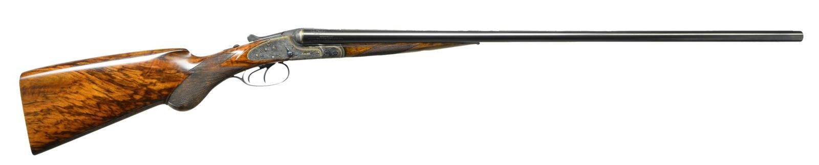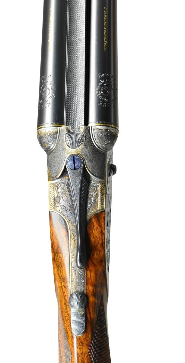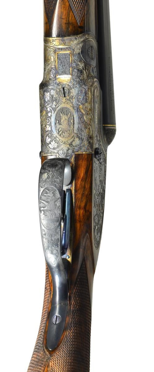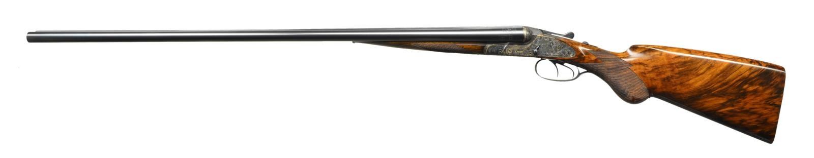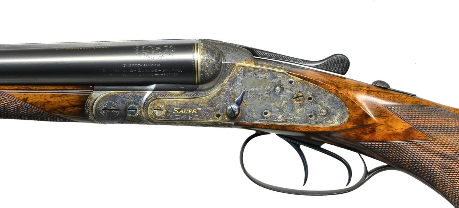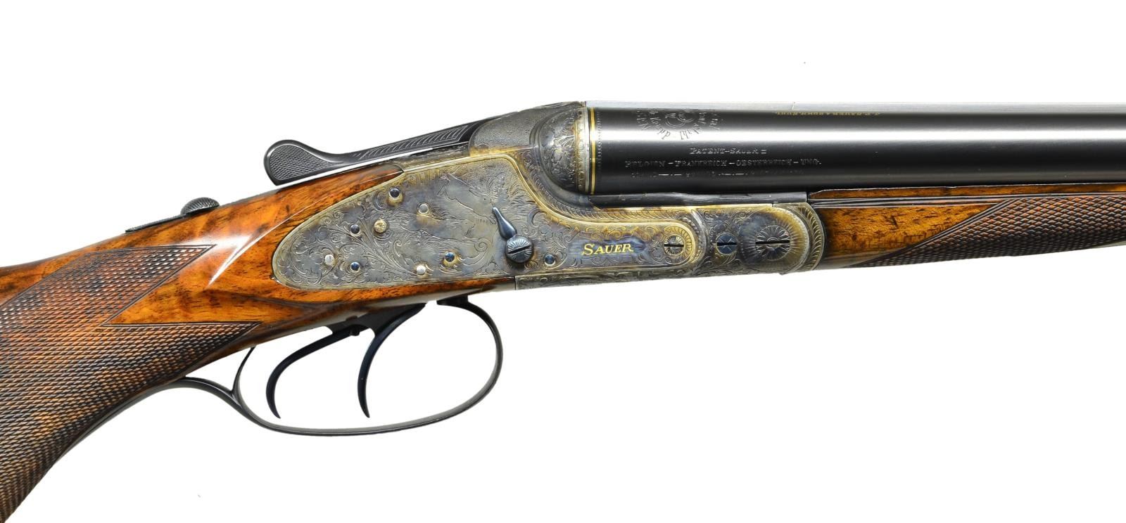 GRADE SIDELOCK GAME GUN. Cal. 20 Ga., 2 3/4". S# 64701 (CA 1899). The 30" dovetailed shoe lump barrels fitted with matted game rib are gold inlaid with maker's name and address along with engraved Krupp steel information on tops. Sides are stamped with patent numbers for Germany, England and America. Gold lines are around breech ends. Barrel flats are stamped with Imperial German proofs for 20 Ga. and with dual crowns. Sidelock top lever action features non automatic safety, dolls head third fastener, bushed strikers, clock hand cocking indicators and double triggers (front "set"). Action is engraved with near full coverage very delicately cut open scrolling acanthus which surrounds the portrait of a chamois on trigger plate. "PRIMUS" is in gold in front of trigger plate. Sidelocks have more acanthus surrounding game scenes. A doe and fawn are on left and two running hares are on right. "Sauer" is in gold at the front of each lockplate. Trigger guard has scene of flying ducks on bow. Replacement round knob buttstock of finely marbled European walnut measures 14 1/2" over checkered wood butt. Point pattern checkering is at grip. Splinter forend with original wood has Deeley release. MEASUREMENTS: BBLS: Bore Diameter: L .635". R .624". Restriction: L .018" (mod). R .003" (IC). Wall thickness: L .027". R .029". STOCK: DAH: 2 5/8". DAC: 1 3/16". CAST: neutral. LOP: 14 1/2". WEIGHT: 5 lb. 14 oz. CONDITION: very fine as completely refurbished retaining nearly all custom finishes on wood and metal. Checkering on forend recut to match buttstock. Bores are shiny with considerable pitting mostly in left barrel. Action is tight, barrels on face, mechanically good. (01-23341/MGM). ANTIQUE. $5,000-10,000.