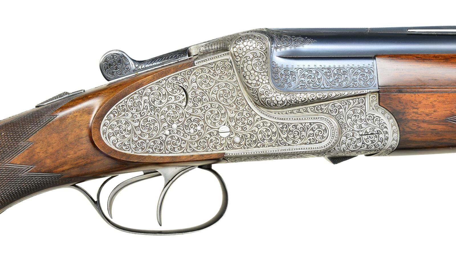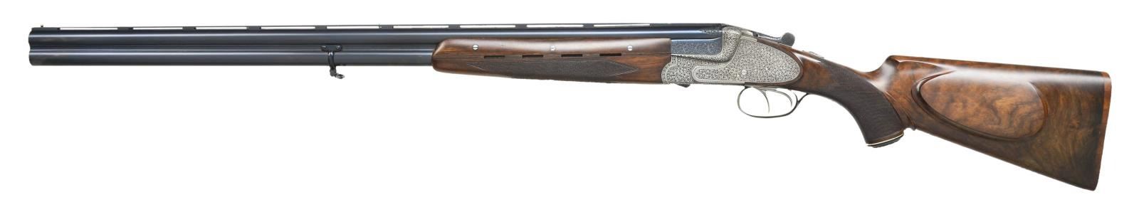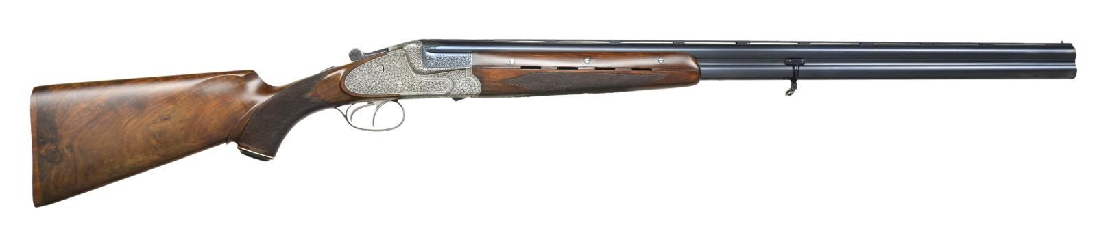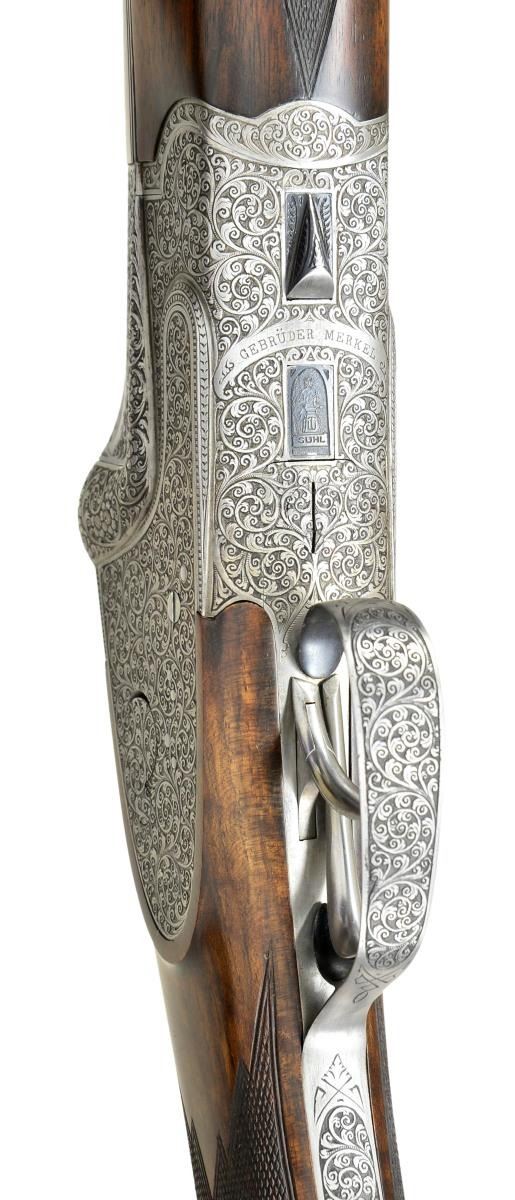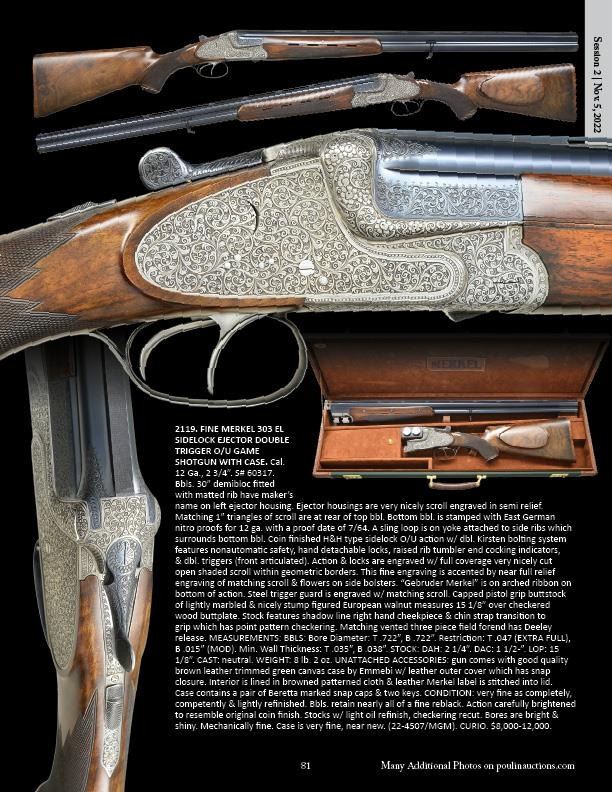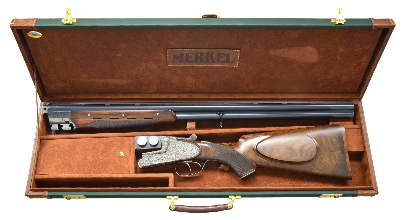 O/U GAME SHOTGUN WITH CASE. Cal. 12 Ga., 2 3/4". S# 60317. Bbls. 30" demibloc fitted with matted rib have maker's name on left ejector housing. Ejector housings are very nicely scroll engraved in semi relief. Matching 1" triangles of scroll are at rear of top bbl. Bottom bbl. is stamped with East German nitro proofs for 12 ga. with a proof date of 7/64. A sling loop is on yoke attached to side ribs which surrounds bottom bbl. Coin finished H&H type sidelock O/U action w/ dbl. Kirsten bolting system features nonautomatic safety, hand detachable locks, raised rib tumbler end cocking indicators, & dbl. triggers (front articulated). Action & locks are engraved w/ full coverage very nicely cut open shaded scroll within geometric borders. This fine engraving is accented by near full relief engraving of matching scroll & flowers on side bolsters. "Gebruder Merkel" is on arched ribbon on bottom of action. Steel trigger guard is engraved w/ matching scroll. Capped pistol grip buttstock of lightly marbled & nicely stump figured European walnut measures 15 1/8" over checkered wood buttplate. Stock features shadow line right hand cheekpiece & chin strap transition to grip which has point pattern checkering. Matching vented three piece field forend has Deeley release. MEASUREMENTS: BBLS: Bore Diameter: T .722", B .722". Restriction: T .047 (EXTRA FULL), B .015" (MOD). Min. Wall Thickness: T .035", B .038". STOCK: DAH: 2 1/4". DAC: 1 1/2-". LOP: 15 1/8". CAST: neutral. WEIGHT: 8 lb. 2 oz. UNATTACHED ACCESSORIES: gun comes with good quality brown leather trimmed green canvas case by Emmebi w/ leather outer cover which has snap closure. Interior is lined in browned patterned cloth & leather Merkel label is stitched into lid. Case contains a pair of Beretta marked snap caps & two keys. CONDITION: very fine as completely, competently & lightly refinished. Bbls. retain nearly all of a fine reblack. Action carefully brightened to resemble original coin finish. Stocks w/ light oil refinish, checkering recut. Bores are bright & shiny. Mechanically fine. Case is very fine, near new. (22-4507/MGM). CURIO. $5,000-8,000.