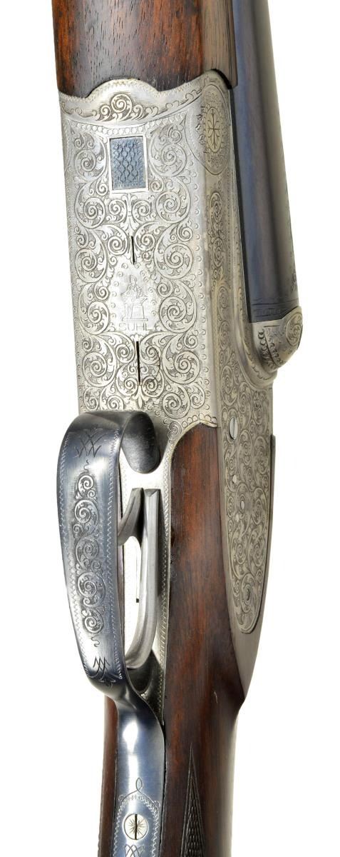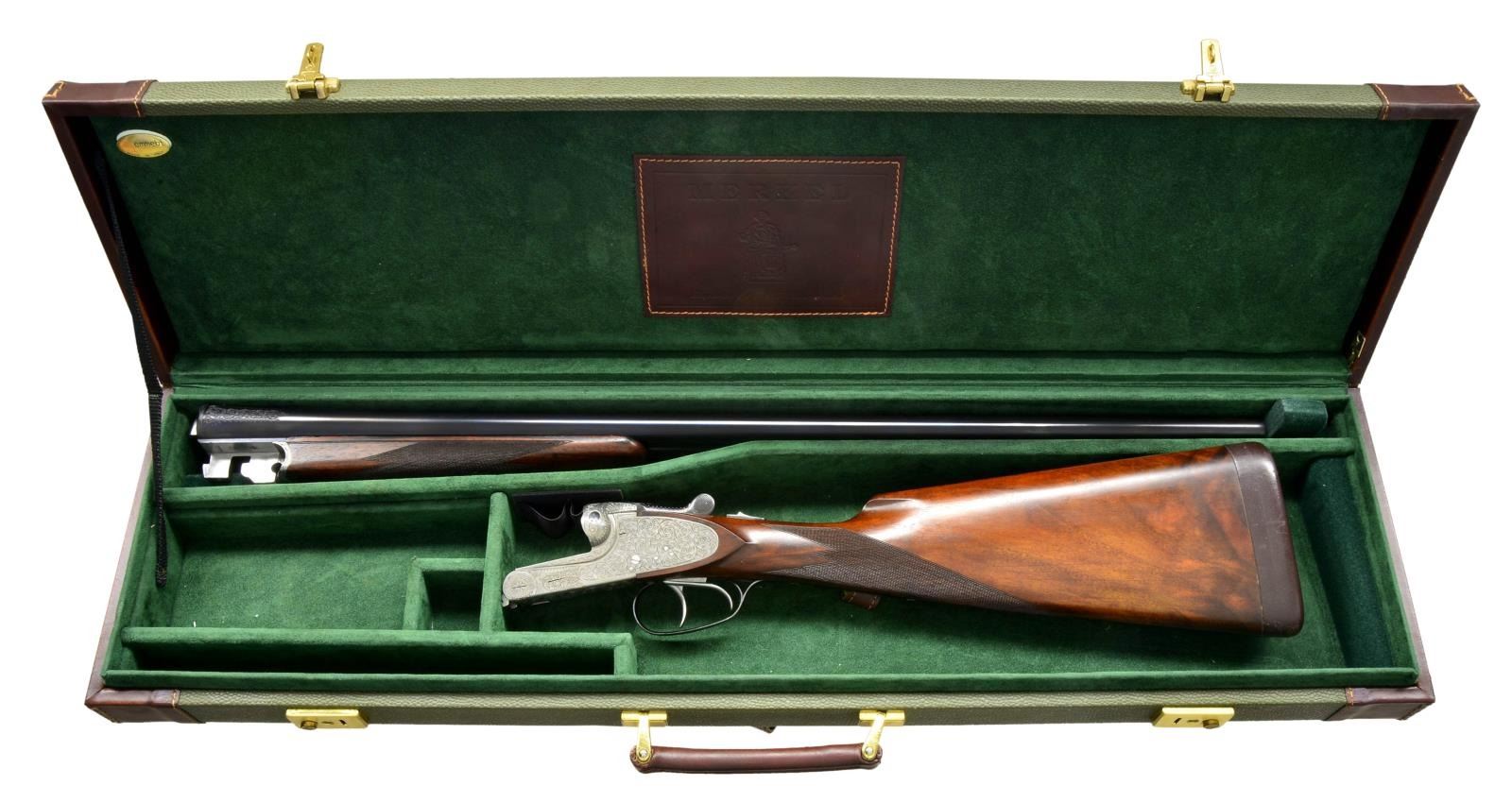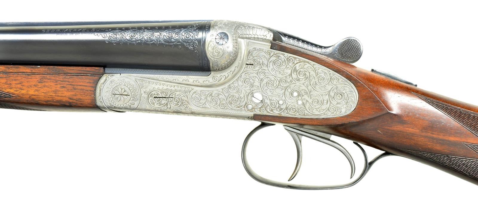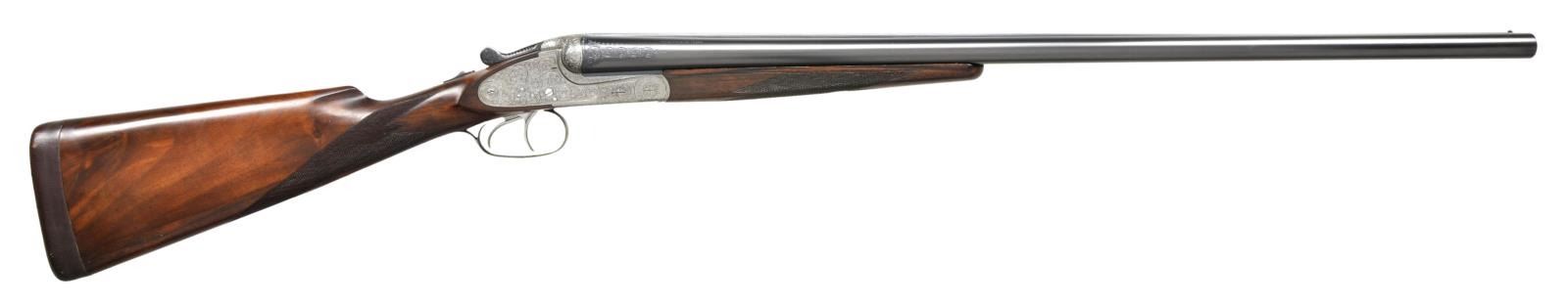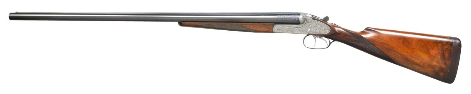 WITH CASE. Cal. 12 ga. 2 3/4". S# 412028. Mfg. 1991. The 28" shoelump bbls. fitted with slightly raised matted concave game rib are marked with steel type and Merkel information on sides. There are 2 1/4" triangles of scroll engraving at breech ends. Bbl. flats are stamped with 1991 East German Nitro proofs for 2 3/4" chambers and with chokes 1/2 and 1/1. Coin finished backspring sidelock action features automatic safety, crossbolt third fastener, sideclips, reinforced frame, raised rib tumbler end cocking indicators and double triggers. Action and lockplates are engraved with near full coverage large open shaded scroll within some wiggle and line borders. Bottom of action is stamped with Suhl Blacksmith logo. Blued top lever and trigger guard are also scroll engraved. Straight grip buttstock of lightly marbled European walnut measures 15 3/8" over brown leather covered pad. Closely spaced point pattern checkering is at grip. Matching splinter ejector forend has Deeley release. MEASUREMENTS: BBLS: Bore Diameter: R .730", L .729". Restriction: R .016" (LIGHT MOD), L .030" (FULL). Min. Wall Thickness: R .032", L .032". STOCK: DAH: 2 5/8". DAC: 1 1/2". LOP: 15 3/8". CAST: neutral. WEIGHT: 7 lb. 7 oz. UNATTACHED ACCESSORIES: gun comes with its original patterned vinyl case with brown leather trim by Emmebi. Case has brown suede outer cover with glossy brown leather trim. Interior is lined in green velvet and has leather Merkel label stitched into lid. CONDITION: exceptionally fine, very close to "as new" with only a few minor handling marks in all finishes. Pad is likely a later addition. Bores are bright and shiny. Mechanically fine. Case is also fine as protected by its outer cover which has some rubs. Straps and handle are good. Interior cloth is very fine with some minor compressions. (22-4534/MGM). MODERN. $3,500-5,000.