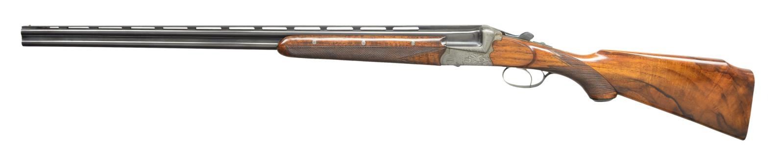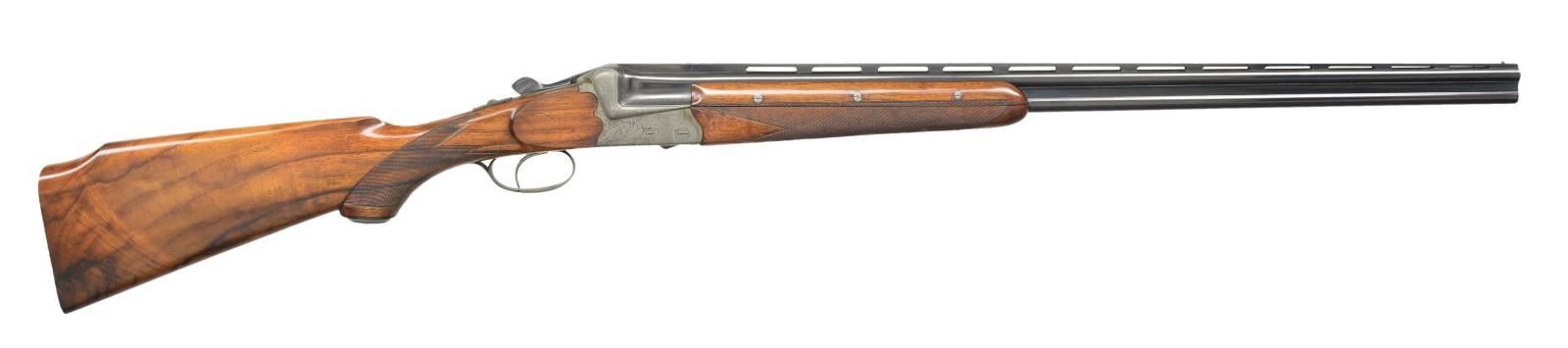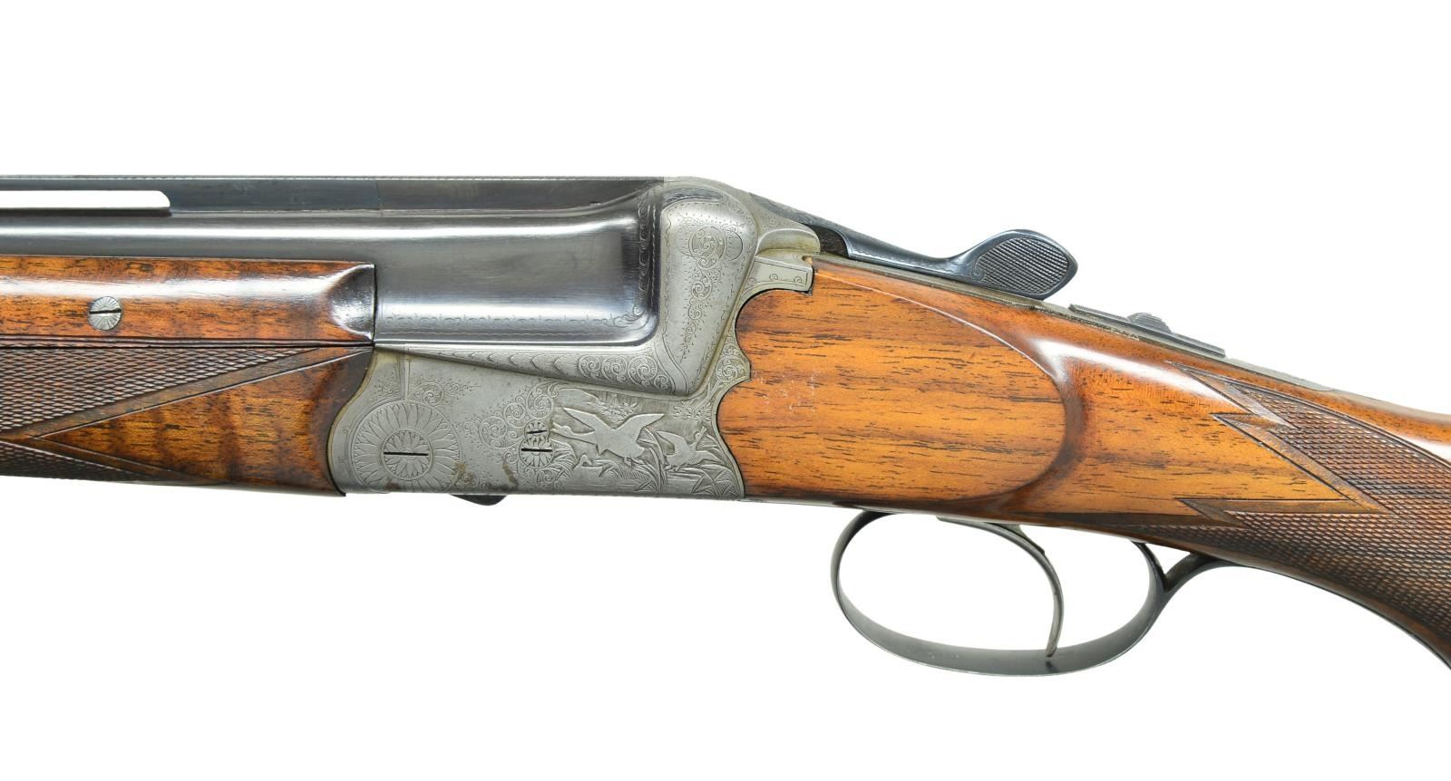 EJECTOR SINGLE TRIGGER GAME GUN IMPORTED BY CALIFORNIA ARMS CO. Cal. 410 Ga., 3". S# 41644 (on barrel). This unusual small bore well made bore gun has 28" demi-bloc barrels fitted with matted ventilated rib. Top of rib is engraved "Calif. Arms Co. Los Angeles - Made in Austria". Bottom barrel is stamped with 1957 Ferlach nitro proofs, S# and maker's code "55" (Herbert Schering). Small size, French gray, O/U blitz action with scalloped back; features non automatic safety, double Kirsten locking system, bushed strikers and single selective trigger, with selector in safety button. Action is engraved with about 80% well cut shaded scroll surrounding game scenes on sides. A trio of ducks are cavorting in a marsh on left side and a pair of pheasant are feeding in cut over woodlands on right. Top lever and trigger guard engraved with matching scroll, are blued. Attractive Monte Carlo horn capped pistol grip buttstock is of lightly crotch figured and dark marbled European walnut and measures 14" over checkered wood butt. Closely spaced multi point pattern checkering with board flat cut front borders is at grip. Matching three piece ejector forend has Deeley release. MEASUREMENTS: BBLS: Bore Diameter at muzzles: B .388" (full?). T .388" (full?). Wall thickness: B .020". T .035". STOCK: DAH: 2 7/8". Drop at rear of Monte Carlo 2 1/8". DAC: 1 1/2". CAST: approx. 1/2" off. LOP: 14". WEIGHT: 7 lb. 2 oz. CONDITION: fine. Barrels retaining approx. 90-95% original blue. There is some discoloration and freckling on action which shows cleaning at bottom left side. Stocks retain about 90% original finish with a large amount of marks and scratches. Bores are bright and shiny, action is tight, ejectors are in time, mechanical single trigger appears to work well. (22-5632/MGM). CURIO. $3,000-5,000.