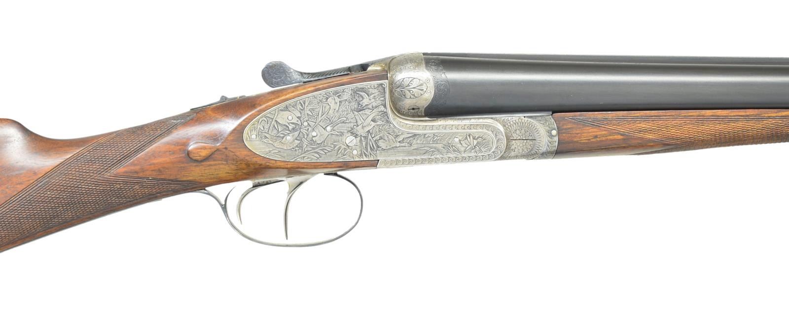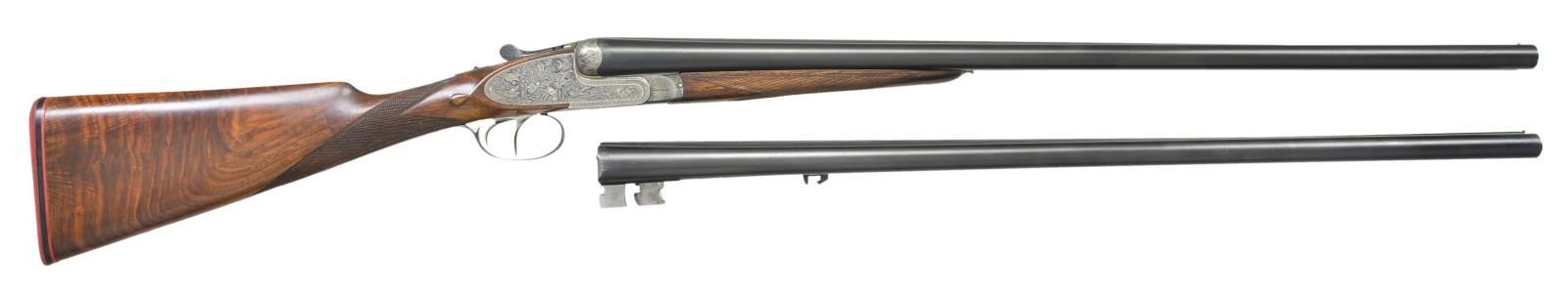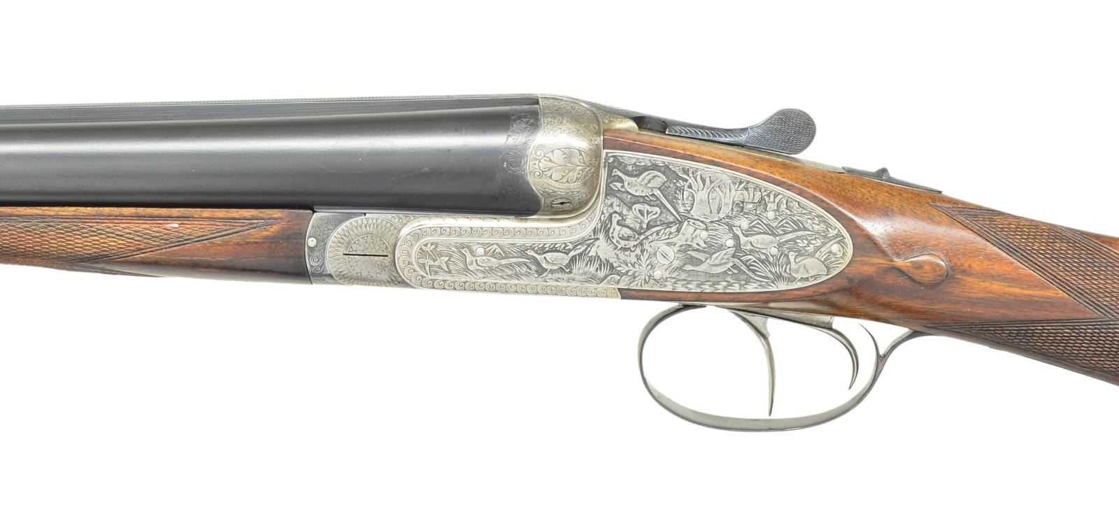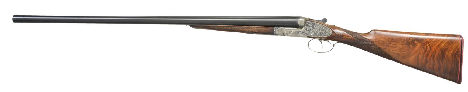 SIDELOCK SHOTGUN. Cal. 12 Ga 2-3/4’’. S# 6155. Game scene engraved self opening sidelock action w/ double under lug & third bite fasteners, side clips, bushed firing pins & cocking indicators. Selective ejectors. Double triggers, front trigger is hinged. Right side of trigger guard bow has rolled edge. Engraving features a marsh scene w/ mallards on right. Left side upland scene features flushing pheasants. Balance of action, forearm iron & breech end of bbls. have vine type foliate scroll w/ foliate borders. Splinter forearm w/ Anson release & straight grip stock of fancy European walnut w/ hand checkering & tear drop points. LOP: 14-1/2’’ over a thin red pad. DAC: 1-3/8’’. DAH: 2-7/8’’. Neutral cast. Both bbls. are 28-3/4’’ chopper lump w/ matted solid ribs. (Bbl. No. 1) Bore diameter: RT .730, LT .729. Choke constriction: RT .011, LT .036. Minimum wall thickness: RT .028, LT .028. (Bbl. No. 2) Bore diameter: RT .730, LT .731. Choke constriction: RT .036, LT .049. Minimum wall thickness: RT .027, LT .028. WEIGHT: 7 lbs, 3 ozs. CONDITION: action has a soft gray appearance. Both sets of bbls. have over 98% reblacked finish w/ lightly weakened markings. All bores are very good & bright. Wood has very good refinish w/ freshened checkering. Action is tight & on face w/ top lever sitting nicely right of center. (23-648/DS). CURIO. $2,750-3,750.