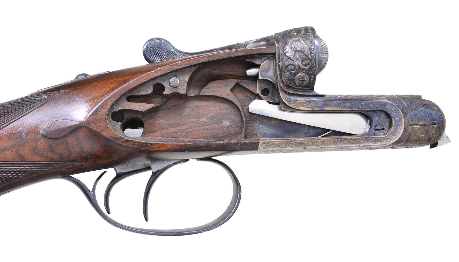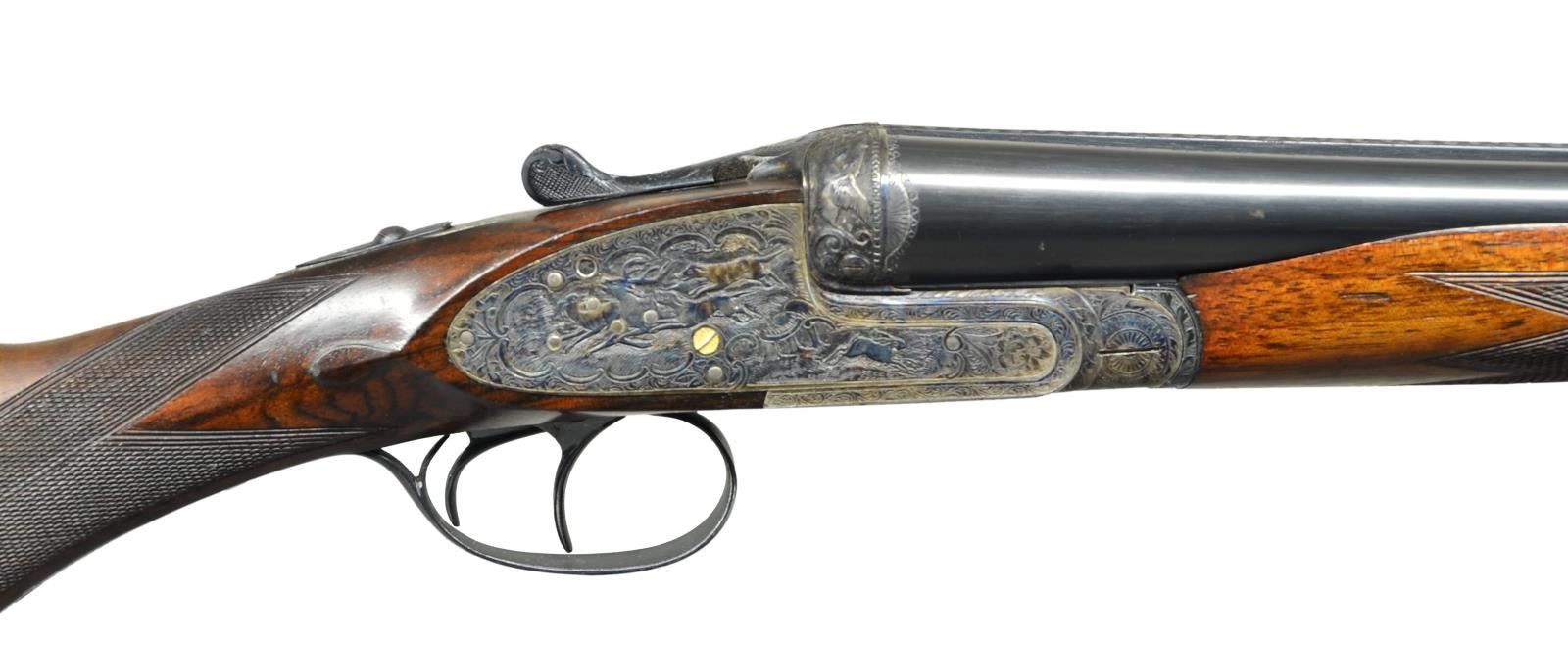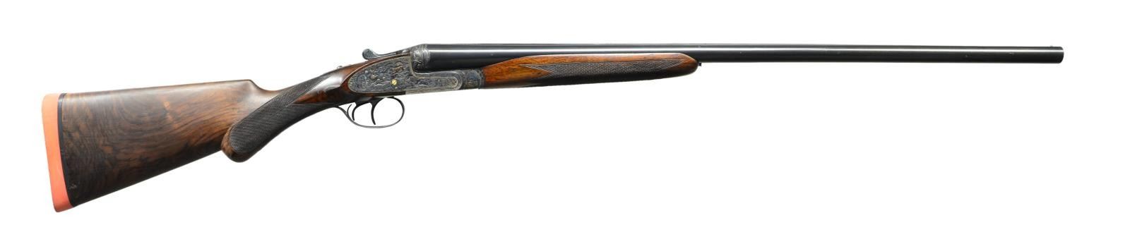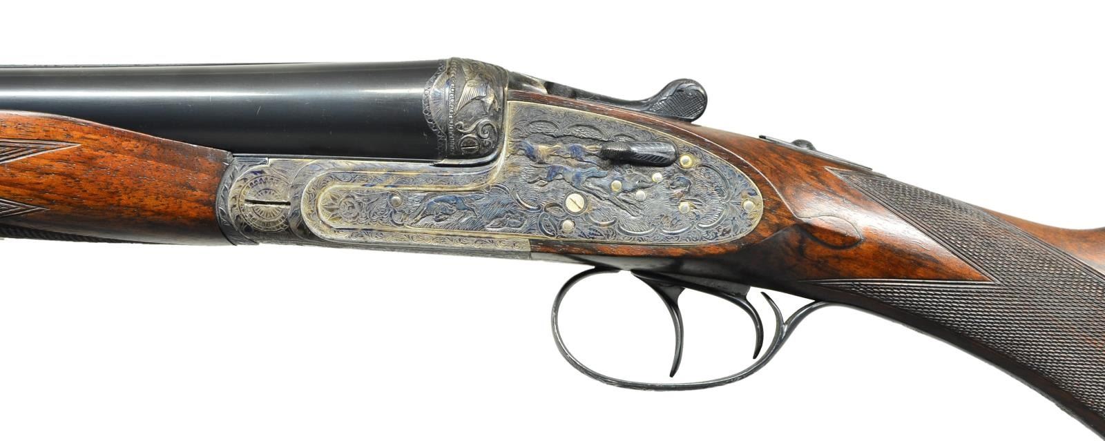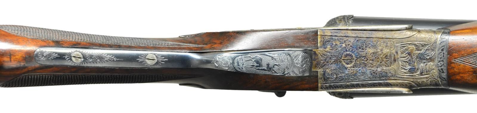 SIDELOCK SHOTGUN. Cal. 12 Ga 2-3/4’’. S# 11216. Pedro Arrizabalaga of Eibar, Spain has made best quality shotguns since 1944 & is considered by many to be the finest of the Spanish makers. Self opening case colored sidelock action. Deep relief game scene engraving features hound & stag on right lock plate w/ hounds & boar on the left. Floorplate pictures a stag & heine. Bolsters show flying ducks & trigger guard shows a deer. Balance of receiver & forearm iron have foliate scroll engraving. Features include double under lug, third bite locking & side clips. Bushed firing pins. Selective ejectors & hinged front trigger. Right edge of trigger guard bow is rolled. Internal lock parts are gold finished. Beavertail forearm w/ Anson release & round knob stock of fancy European walnut having dark marbling. Features include point pattern hand checkering & tear drop points. LOP: altered to 14-5/8’’ over a solid orange London style pad. DAC: 1-3/8’’. DAH: 1-7/8’’. Stock has approx. 1/4’’ cast off. Forcing cones are lengthened in both sets of bbls. Both bbls. are 28’’ w/ hand matted concave solid ribs & steel beads. (Bbl. No. 1) Breech end has gold no. “1”. Bore diameter: RT .731, LT .729. Choke constriction: RT .013, LT .031. Minimum wall thickness: RT .026, LT .035. (Bbl. No. 2) Breech end has gold no. “2”. Bore diameter: RT .721, LT .721. Choke constriction: RT .011, LT .031. Minimum wall thickness: RT .034, LT .035. WEIGHT: 7 lbs, 9.6 ozs. Bbl. date code indicates 1970 mfg. CONDITION: action retains over 95% dark case coloring. Both bbls. retain over 95% original blue & have bright bores. Bbl. no. 1 has small dents in right bbl. 9’’ & 16’’ from muzzle. Original stock finish shows light wear & marks w/ dull touch up finish on butt section. Action is tight & on face. (23-677/DS). CURIO. $4,000-6,000.