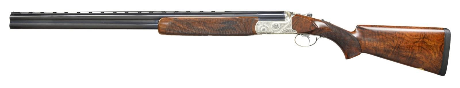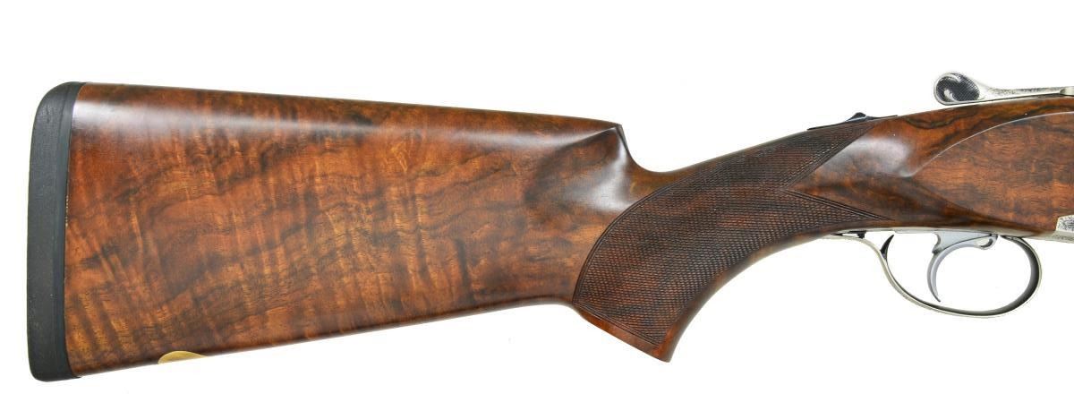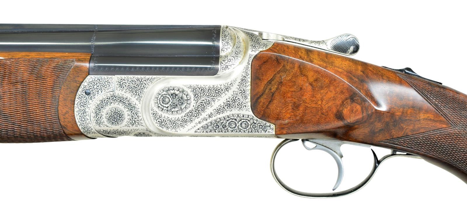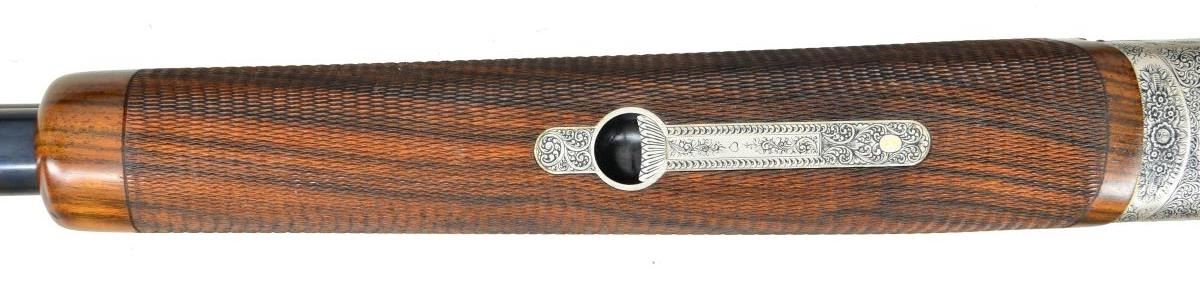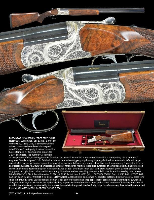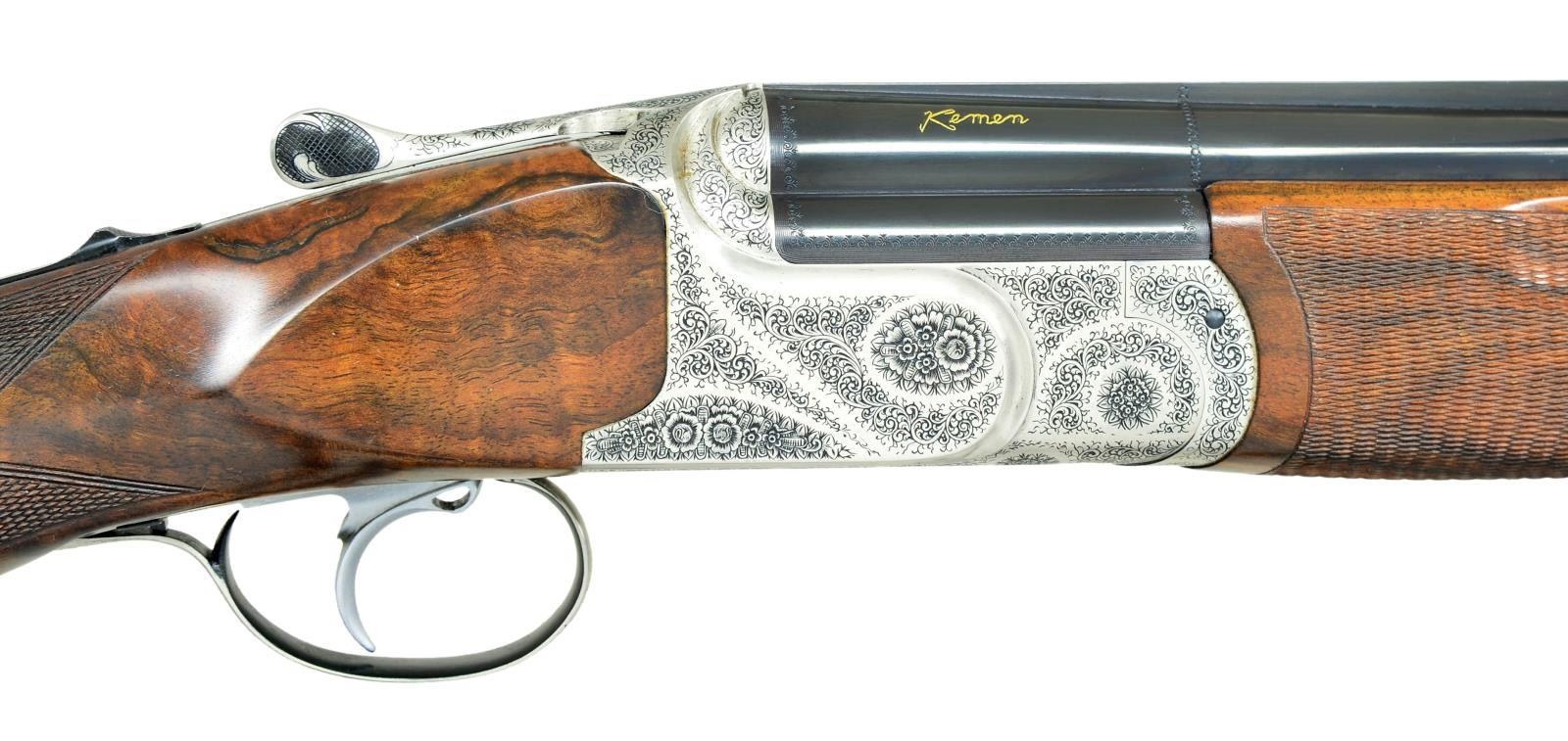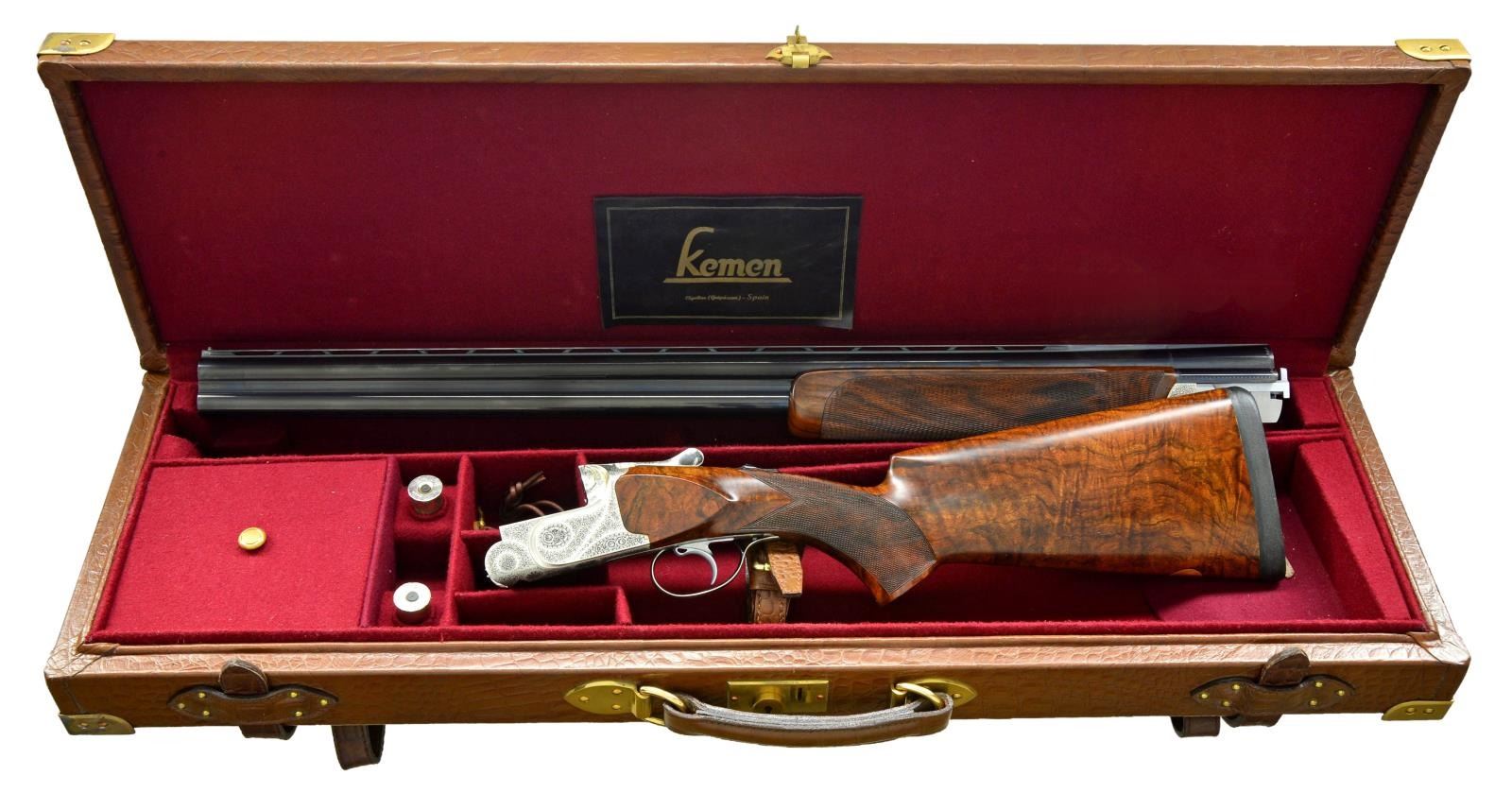 CASE. Cal. 12 Ga., 2 3/4". S# 40.03.03.902. Bbls. 28 3/8" monobloc fitted w/ narrow matted ventilated rib are gold inlaid "Kemen" on top right side of monobloc & are stamped w/ Spanish nitro proofs for 2 3/4" chambers. The number "2" is inlaid at rear portion of rib, matching number found on top lever & forend latch. Bottom of monobloc is stamped w/ serial number & engraved "Made in Spain". Coin finished action w/ removable trigger group having V-springs is fitted w/ automatic safety & single nonselective trigger. Action is engraved w/ very attractive near full coverage sprays of well cut scroll surrounding & accented by rose and floral bouquets. "KEMEN" is emblazoned at top of forend iron mortise. Pistol grip buttstock of exhibition quality, finely marbled & intricately fiddle figured European walnut measures 14 5/8" over black "Kick-eez" pad. Stock features point pattern checkering at grip w/ sm. right hand palm swell & a vacant gold oval on toeline. Matching one piece field type forend has Deeley type release. MEASUREMENTS: BBLS: Bore Diameter: T .726", B .726". Restriction: T .007" (IC), L .007" (IC). STOCK: DAH: 1 3/4". DAC: 1 7/16". LOP: 14 5/8". CAST: neutral. WEIGHT: 7 lb. 13 oz. UNATTACHED ACCESSORIES: gun comes w/ alligator patterned leather case w/ brass trim lined in burgundy cloth. Case contains a Kemen label, pair of boss marked snap caps, toolkit containing spare firing pins & wrench, along w/ three keys. CONDITION: exceptionally fine, appears to be unfired since proof with a small number of handling marks on all wood & metal surfaces, most notably 3 or 4 scratches on left side panel. Mechanically crisp. Case is also very fine. Label has detached from lid. (22-4505/MGM). MODERN. $4,500-6,500.
