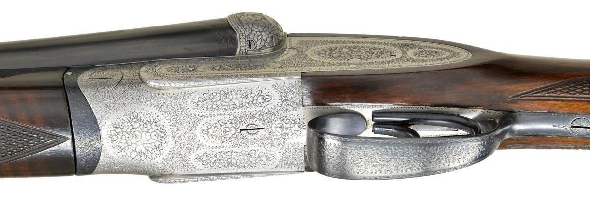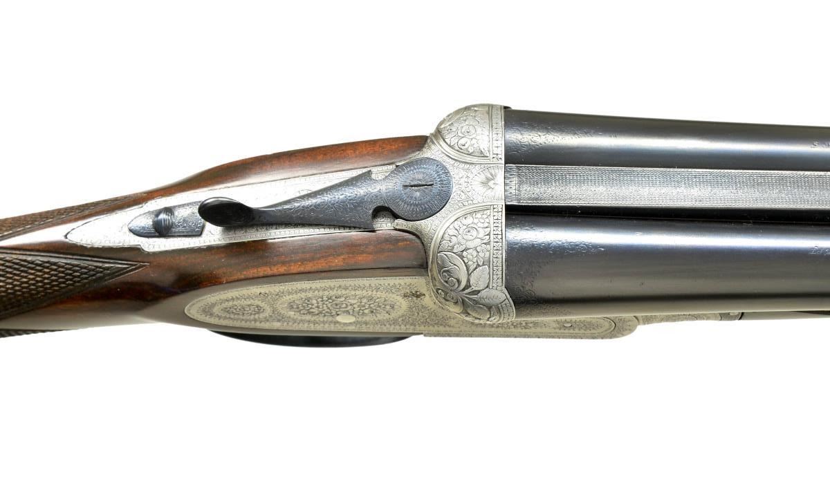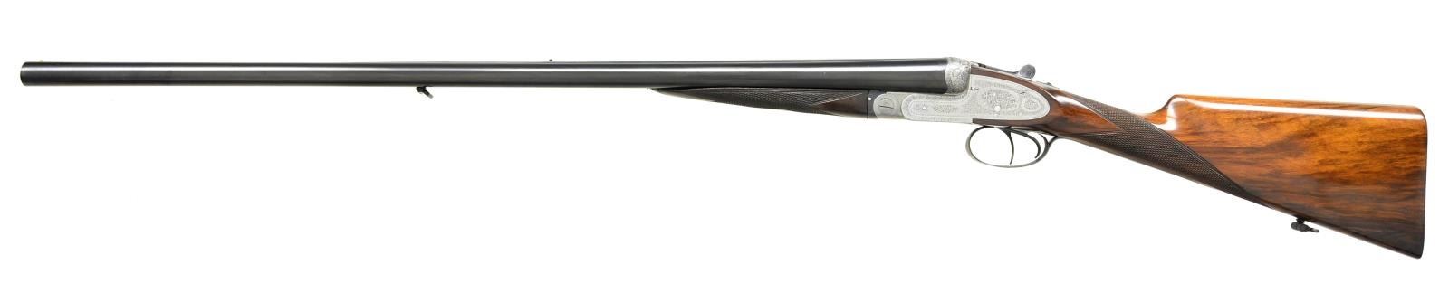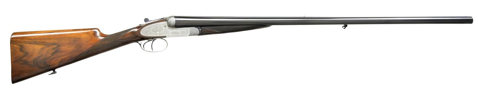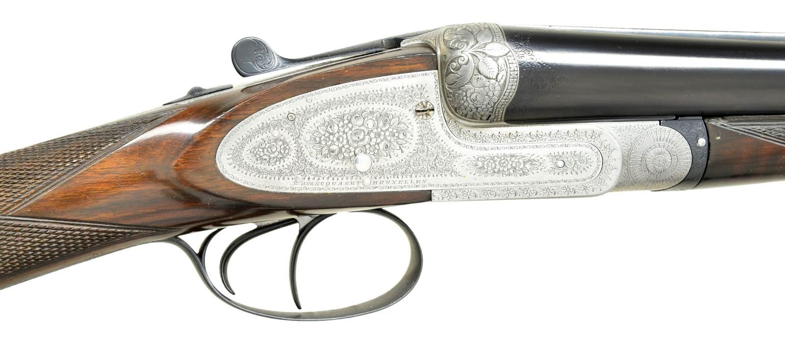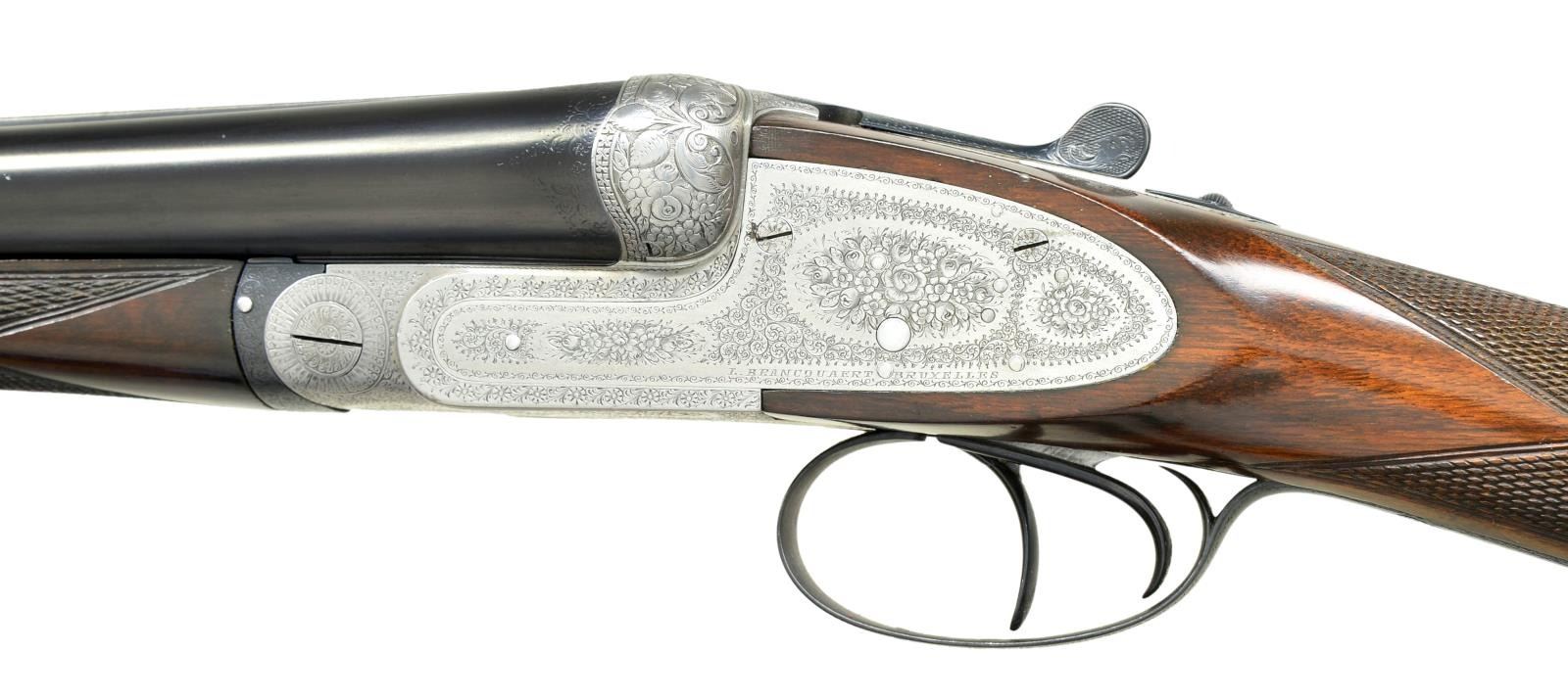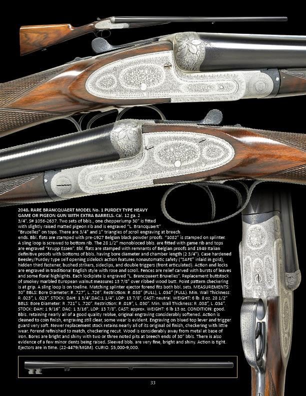 GAME OR PIGEON GUN WITH EXTRA BARRELS. Cal. 12 ga. 2 3/4". S# 1056-2637. Two sets of bbls., one chopperlump 30" is fitted with slightly raised matted pigeon rib and is engraved "L. Brancquaert" "Bruzelles" on tops. There are 3/4" and 1" triangles of scroll engraving at breech ends. Bbl. flats are stamped with pre-1927 Belgian black powder proofs. "1082" is stamped on splinter. A sling loop is screwed to bottom rib. The 28 1/2" monobloced bbls. are fitted with game rib and tops are engraved "Krupp Essen". Bbl. flats are stamped with remnants of Belgian proofs and 1949 Italian definitive proofs with bottoms of bbls. having bore diameter and chamber length (2 3/4"). Case hardened Beesley/Purdey type self opening sidelock action features nonautomatic safety ("SAFE" inlaid in gold), hidden third fastener, bushed strikers, sideclips, and double triggers (front articulated). Action and locks are engraved in traditional English style with rose and scroll. Fences are relief carved with bursts of leaves and some floral highlights. Each lockplate is engraved "L. Brancquaert Bruxelles". Replacement buttstock of smokey marbled European walnut measures 13 7/8" over ribbed wood butt. Point pattern checkering is at grip. A sling loop is on toeline. Matching splinter ejector forend fits both bbl. sets. MEASUREMENTS: 30" BBLS: Bore Diameter: R .727", L .726". Restriction: R .038" (FULL), L .034" (FULL). Min. Wall Thickness: R .023", L .023". STOCK: DAH: 1 3/4".DAC:1 1/4". LOP: 13 7/8". CAST: neutral. WEIGHT: 6 lb. 8 oz. 28 1/2" BBLS: Bore Diameter: R .721" L .720". Restriction: R .019", L .030". Min. Wall Thickness: R .038", L .034". STOCK: DAH: 1 9/16". DAC: 1 3/16". LOP: 13 7/8". CAST: approx. WEIGHT: 6 lb 13 oz. CONDITION: good. Bbls. retaining nearly all of a good quality reblue, original engraving considerably softened. Action is cleaned to coin finish, engraving still clear, some wear is evident. Engraving on blued top lever and trigger guard very soft. Newer replacement stock retains nearly all of its original oil finish, checkering with little wear. Forend refinished to match, checkering recut. Wood is considerably away from metal at base of iron. Bores are bright and shiny with two or three noted pits at breech ends of 30" bbls. There is also evidence of a few minor dents being raised. Sleeved bbls. are very fine, bright and shiny. Action is tight. Ejectors are in time. (22-4479/MGM). CURIO. $3,000-4,500.