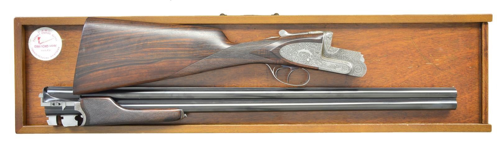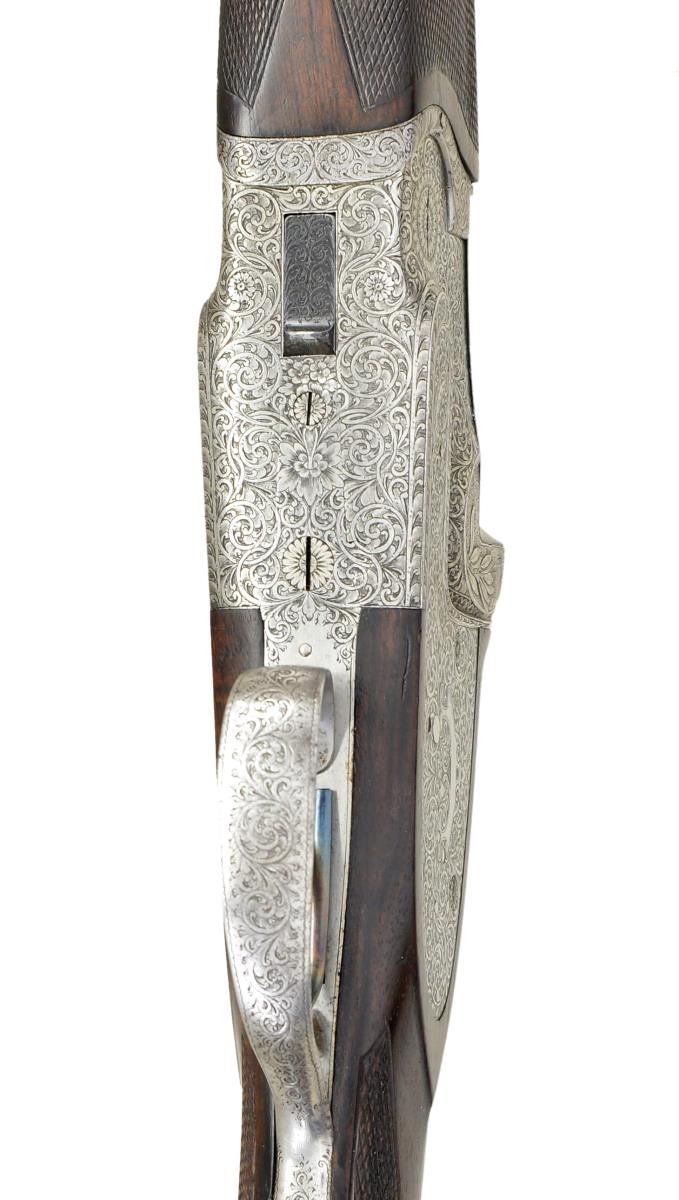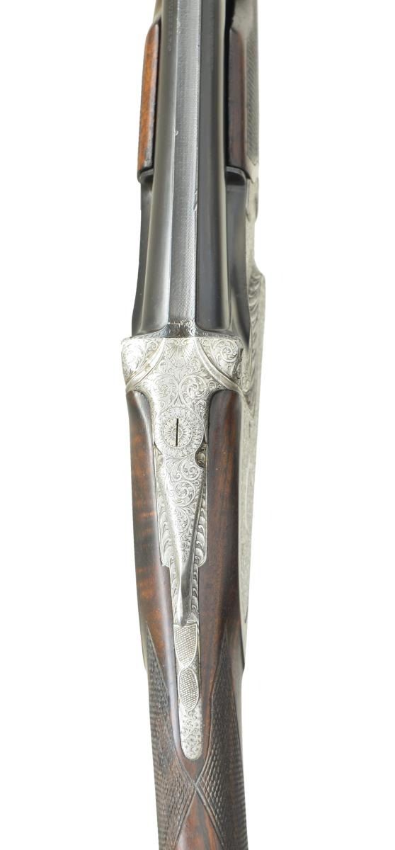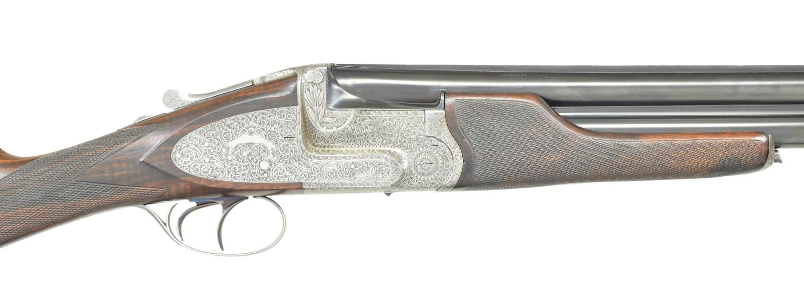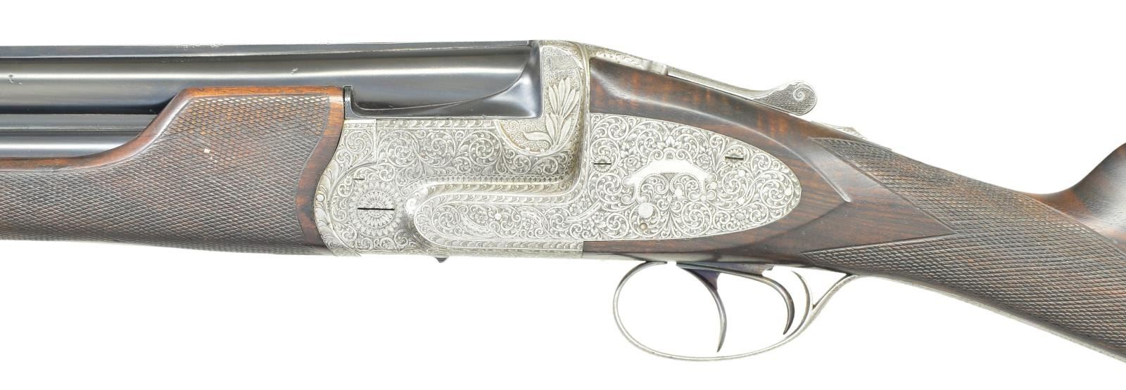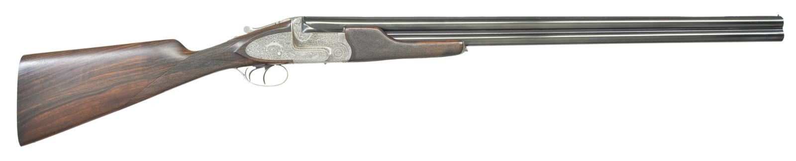 Cal. 16 Ga 2-1/2’’. S# 10166. Bbl. 28’’ of “Compressed Steel” w/ concave solid rib. 7 pin sidelock action w/ deeply sculpted frame. Double under lug & crossbolt locking. Selective ejectors & double triggers. Full coverage vine type engraving w/ floral highlights. Bolsters have deep relief foliate engraving. Shallow sculpted field forearm & straight hand stock of fancy European walnut w/ extensive hand checkering. Oval nameplate in lid has initials “PH”. LOP: 14-1/8’’. DAC: 1-7/16’’. DAH: 2-1/8’’. Stock has approx. 5/8’’ cast off. Bore diameter: U .724, O .765. Choke constriction: U .007, O .029. Minimum wall thickness: U .028, O .030. WEIGHT: 7 lbs, 1 oz. UNATTACHED ACCESSORIES: user supplied wooden storage box w/ sliding lid. CONDITION: frame has cleaned gray appearance. Bbls. retain 98% reblacked finish. Original wood finish shows scattered scratches & marks w/ light checkering wear. Top lever sits slightly left of center. Very good bright bores. (23-666/DS). CURIO. $2,000-3,000.
