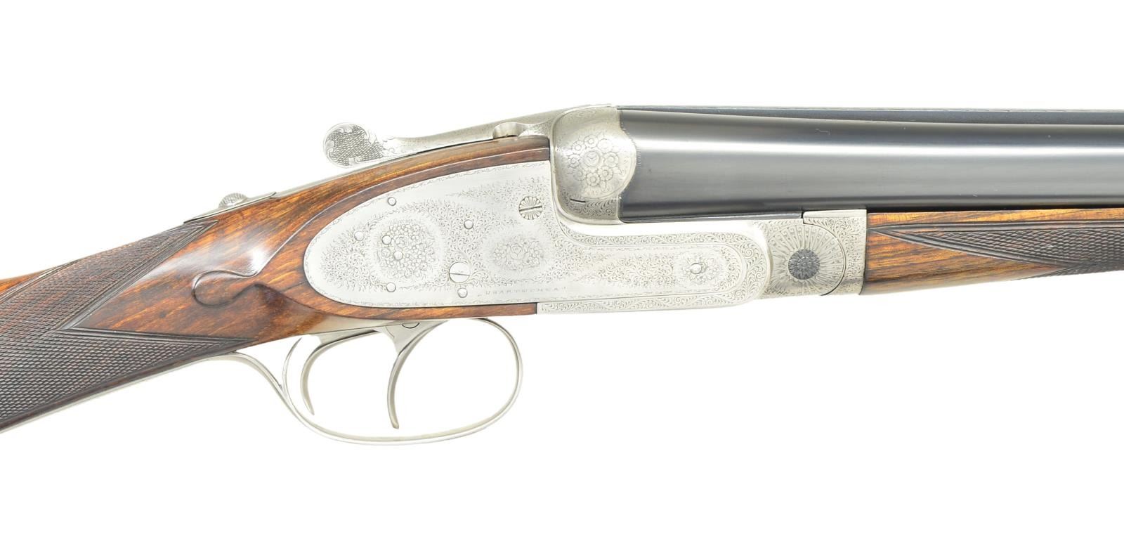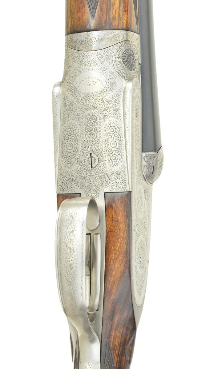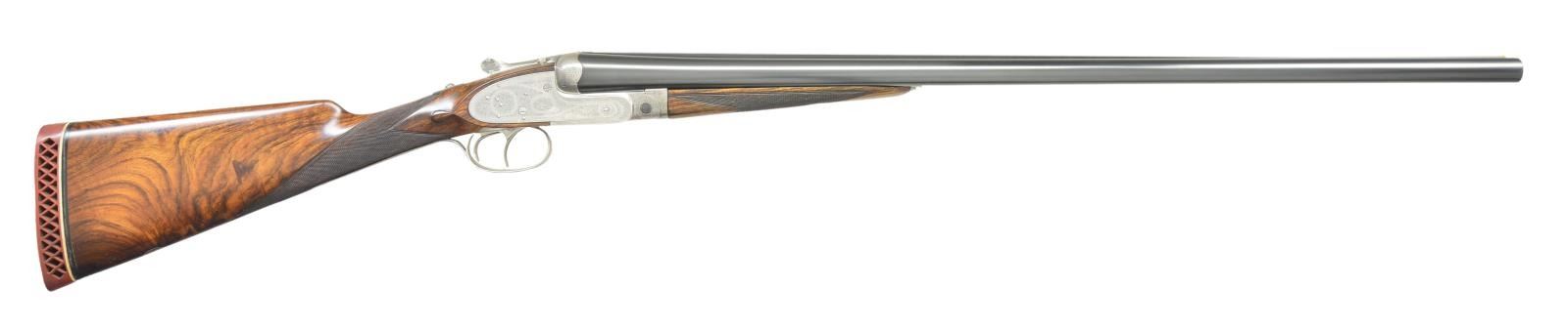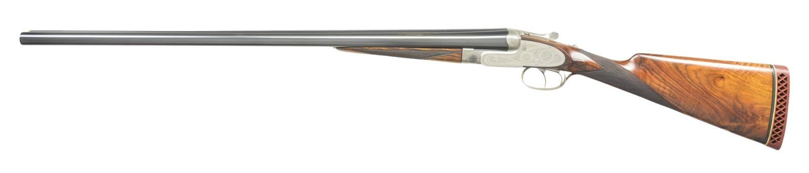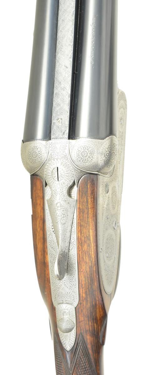 Cal. 12 Ga, chambers are lengthened to 2-3/4’’. S# 26721. Bbls. 27-5/8’’ w/ hand matted solid rib. Assisted opening sidelock action. Features include double under lug & third bite locking w/ side clips, cocking indicators, ejectors & hinged front trigger. Right edge of trigger guard is rolled. Traditional fine English rose & scroll full coverage hand engraving. Breech end of bbl., forearm tip & top lever are marked with gold no. 1s indicating this gun was part of a 2 gun set. Splinter forearm w/ Anson release & straight hand stock of fancy European walnut. Stock features include point pattern checkering, tear drop points & nameplate on toeline. LOP: shortened to 14-1/4’’ over a red ventilated aftermarket pad. DAC: 1-1/2’’. DAH: 2-5/16’’. Near neutral cast. Bore diameter: RT .721, LT .724. Choke constriction: RT .013, LT .032. Minimum wall thickness: RT .028, LT .027. WEIGHT: 7 lbs, 2 ozs. CONDITION: bbls. retain 98% reblacked finish & have very good bright bores. Action has a very good cleaned bright finish. Stock & forearm are refinished showing small marks. Freshened checkering. Action is tight on face. (23-661/DS). CURIO. $2,500-4,000.