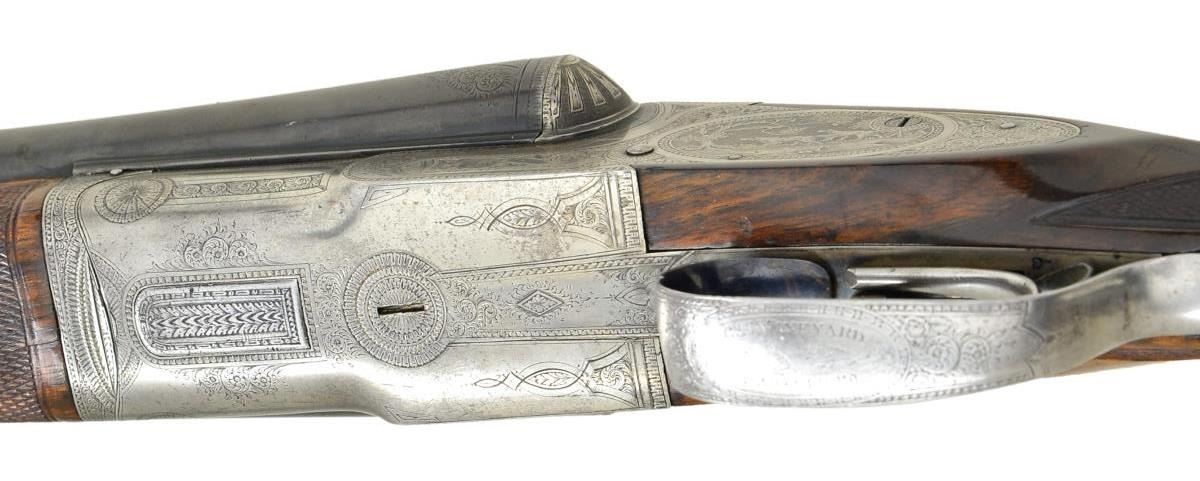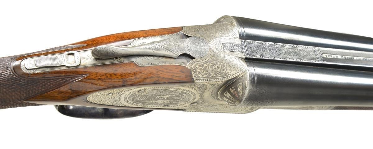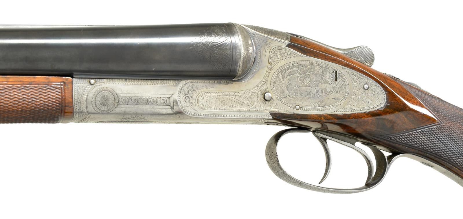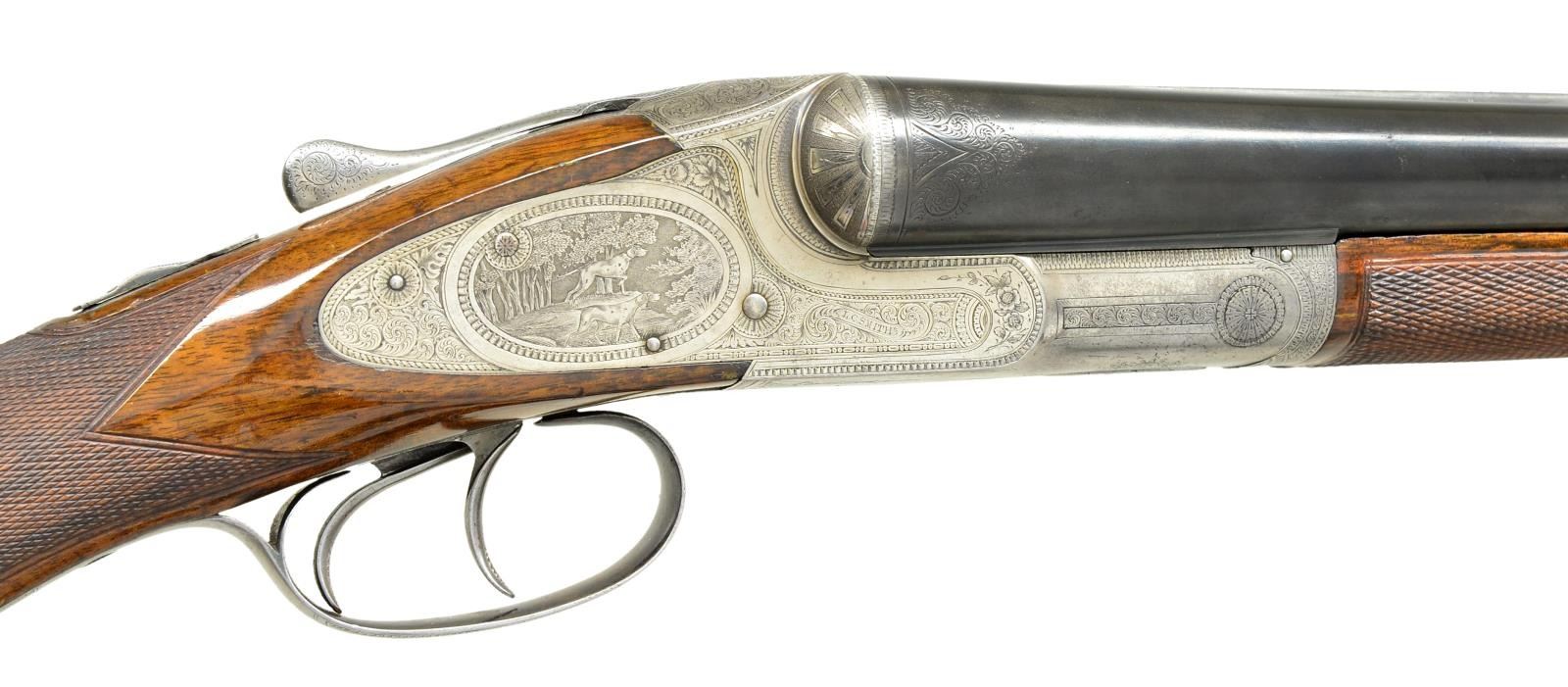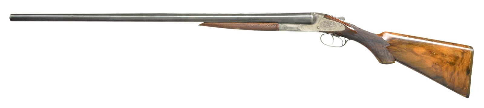 SHOTGUN. Cal. 12 Ga. 2 3/4". S# 2195 (1897). The #5 grade was offered between 1892 & 1913; only 414 were made in 12 ga. After 1913, the quality 5 became the crown grade. This gun has 30" crown steel barrels. (per factory letter) engraved "MADE TO ORDER BY THE HUNTER ARMS CO. FULTON N.Y. CROWN STEEL" on matted game rib. 1" Triangles of scroll are at breech ends & narrow geometric bands are engraved around muzzles. Barrel flats are stamped with serial number. "5E" is stamped on splinter. Case hardened early type action features non-automatic safety, bushed firing pins, & double triggers. Water table is stamped with patent dates & serial number. Action has nicely filed beads around fences & is engraved with about 50% coverage nicely cut sprays of scroll within line & geometric borders. Lockplates are near fully engraved with scroll, flowers & acanthus leaves. Geometric bordering continues; all surrounding central oval vignettes of semi relief engraved dogs in nicely detailed settings. A pair of setters are on left side, front one is pointing to an unseen bird under a large tree. Right side depicts a pair of pointers on edge of meadow, one to rear is pointing. Trigger guard has oval on bow with 3 partridge at center framed by "GH VINEYARD" at top & "ST. JOSEPH MO." at bottom (Possibly George Hoagland Vineyard, born 1880, St. Joseph MO. The 1940s census lists their home value at $20,000 & that he owned a real estate business. He was the father of George Hoagland Vineyard (no Jr. given), a solid state physicist who was appointed Chairman of the Department of Physics of the Brookhaven National Labratory. However, seeing as the elder G. H. Vineyard would have been 17 years old when this gun was delivered, the most likely recipient was his father. Further research should reveal more about this family). Serial number is on trigger guard tang. Capped long pistol grip buttstock of well marbled & nicely figurd European walnut measures 14 1/4" over ribbed hard rubber buttplate. Point pattern checkering with slight flare toward comb wraps over top of grip. Matching splinter ejector forend with inlet hard rubber tip has J-spring release with early type secondary sliding button release in circular escutcheon. MEASUREMENTS: BBLS: Bore Diameter: R .723", L 725". Restriction: R .038 (EXTRA FULL), L .040" (EXTRA FULL). Min. Wall Thickness: R .030", L .032". STOCK: DAH: 3 3/8". DAC: 2". LOP: 14 1/4". CAST: neutral. WEIGHT: 7 lb. 13 oz. UNATTACHED ACCESSORIES: aforementioned factory letter which confirms specifications & states gun was shipped December 17, 1897 to the Akhurt Eberly Arms Company (also of St. Josephs, MO). CONDITION: very good as partially refinished. Barrels retaining about 90% of a reblack over many light nicks & dings & some overall pitting or patterning. Action retains perhaps 10-20% original case hardening color, mostly where protected by fences, balance is silver with some gray spotting. Lockplates are nearly all bright silver, all engraving remains sharp & clear. blue on trigger guard is almost completely gone with only some remaining on inside of bow. Stocks retain most of what is likely an old glossy varnish refinish with some later scratches & light crazing. Checkering recut. Bores are bright with some frosting & some very minor pitting toward breech ends with evidence of a few removed dents, mostly in left barrel. Action is tight. Early style ejectors are in time, but perhaps a bit premature. A lovely old gun, undoubtedly made for waterfowling along the Missouri river. (01-21519/MGM). ANTIQUE. $7,000-10,000.