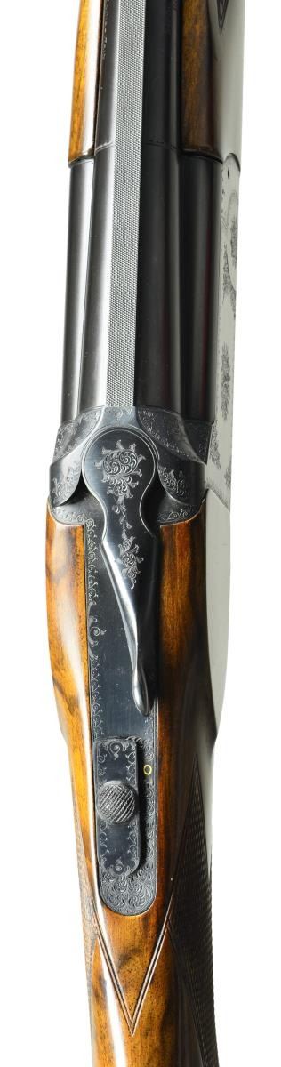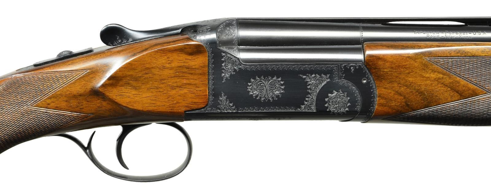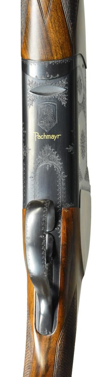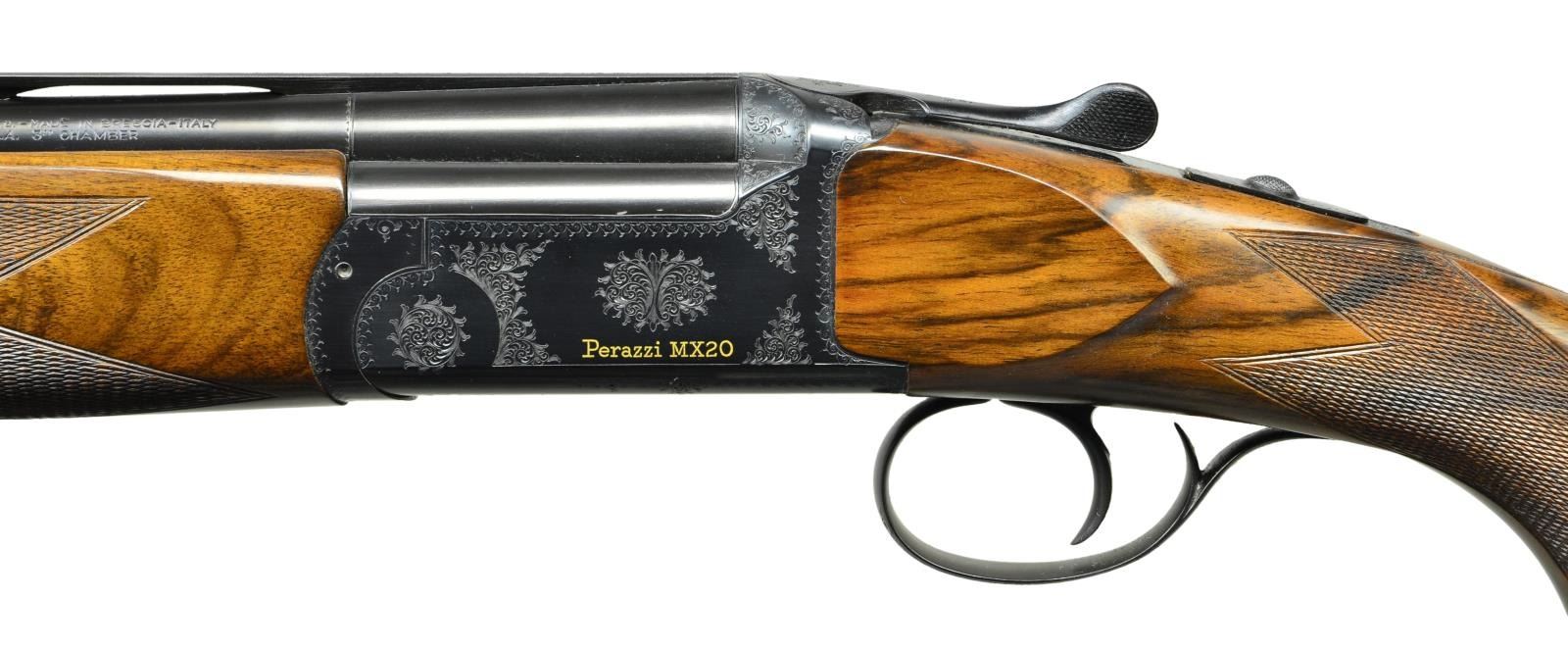 WITH CASE. Cal. 20 Ga. 3". S# 68034. The 26" monobloc barrels with narrow ventilated rib are fitted with choke tubes and are stamped with Perazzi address and chamber info on top left side and importer info on right. Bottom of monobloc is stamped with 1986 Italian nitro proofs for 3" chambers. Blued medium size low profile O/U action features single selective trigger with selector on top tang and non automatic safety. Action is engraved with sprays of very nicely cut scrolls with small scroll borders. "Perazzi MX20" is in gold on left side. Bottom of action is gold inlaid "Pachmayr" under Pachmayr lion and target logo. Very nicely marbled European walnut pistol grip buttstock measures 14 3/4" over checkered wood butt. Point pattern checkering is at grip. Matching slim schnabled forend has Deeley type release. MEASUREMENTS: STOCK: DAH: 2 1/16". DAC: 1 5/16". CAST: neutral. LOP: 14 3/4". WEIGHT: 6 lb. 11 oz. UNATTACHED ACCESSORIES: gun comes with black ABS Perazzi case with blue lining. Case contains stock removal tool, some paperwork, 3 Perazzi choke tubes (2 in gun for a total of 5) and wrench. CONDITION: very fine close to "as new". Breech face indicates very little shooting. There are only very few minor handling and assembly marks in all factory finishes. Mechanically crisp. Case is very fine. (22-5944/MGM). MODERN. $6,000-9,000.
