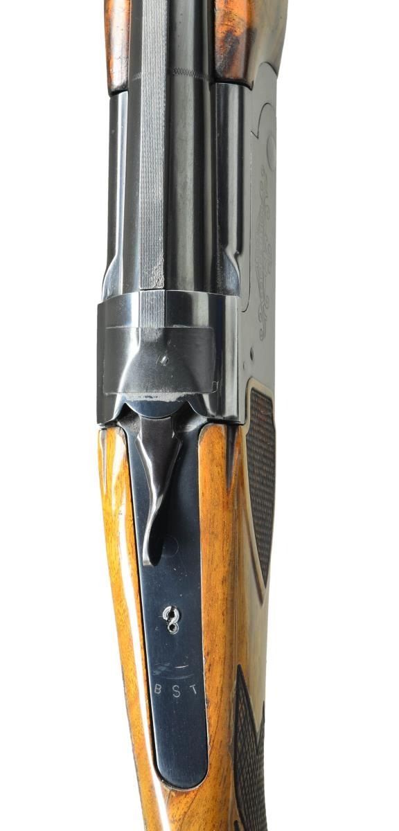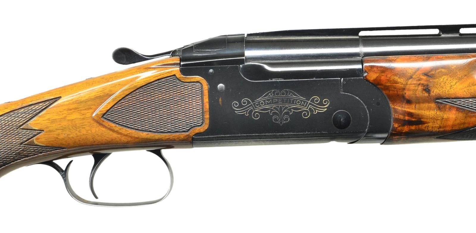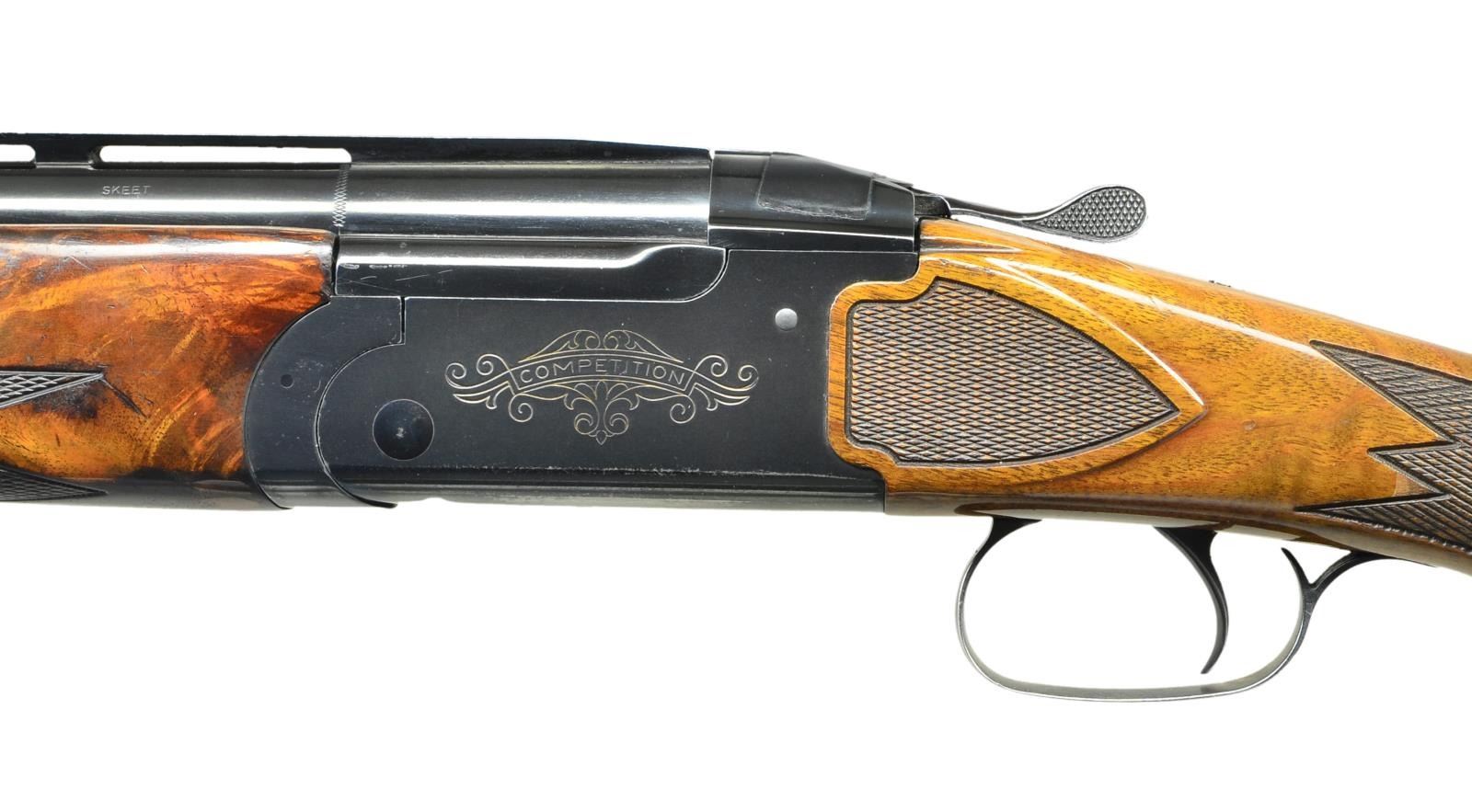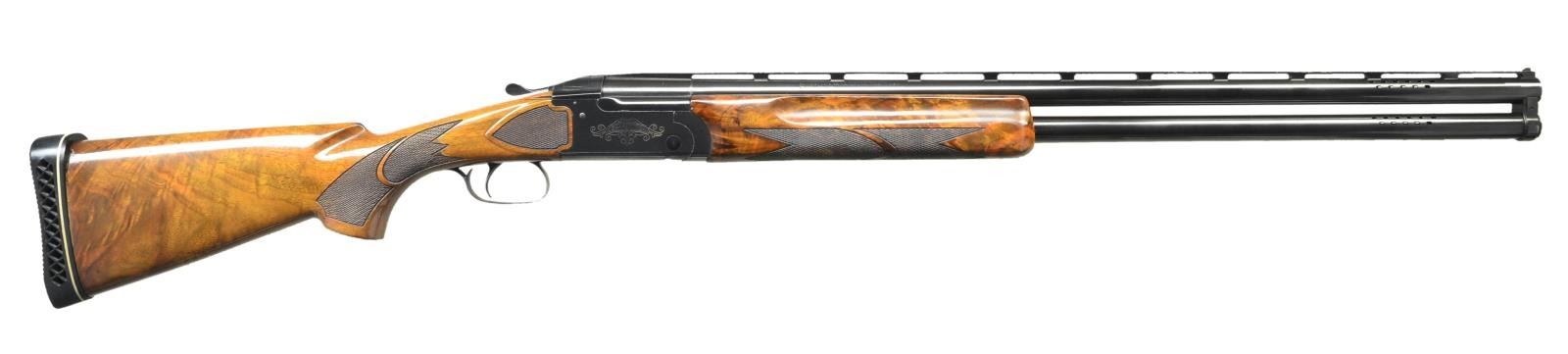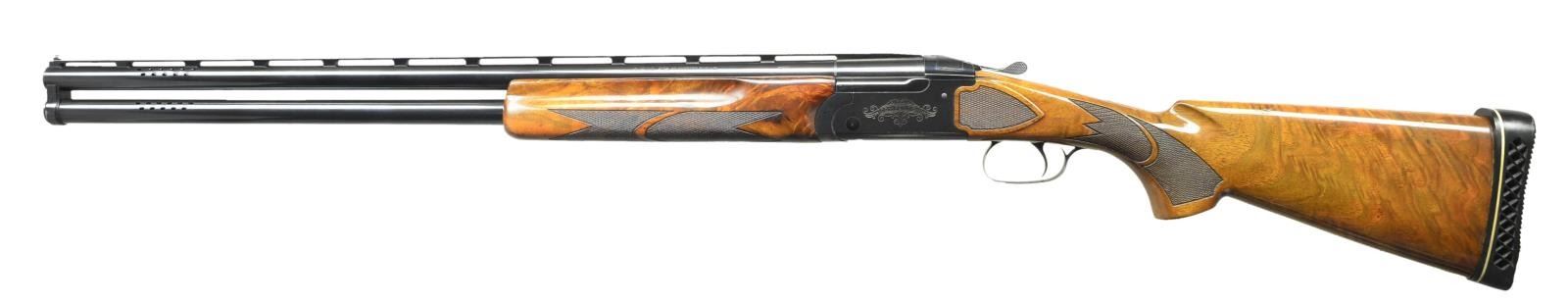 Cal. 12 ga., 2 3/4". S# OU.41043. Bbls. 27 1/2" vent rib with slotted porting. White target front sight with aluminum mid bead. Single selective trigger. Auto ejectors. Blue finish. Target forearm and pistol grip walnut stock with segmented cut checkering. LOP: 14" over an oversized aftermarket Pachmayr trap pad with shaved toe. UNATTACHED ACCESSORIES: Nasco aluminum case with red velour interior. Lid of case contains Briley sub gauge skeet tubes in 410, 28 and 20 gauge. Lower portion of case contains skeet tube seating tool and hammer. CONDITION: barrels retain over 95% blue and have bright bores. Receiver shows carry wear along lower edges with a dull black tape on hood to dull sighting surface. Wood has moderately worn finish and checkering with areas of darkened appearance having scratches and handling marks. (22-2109/DS). MODERN. $1,500-2,500.
