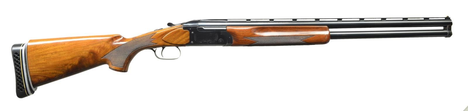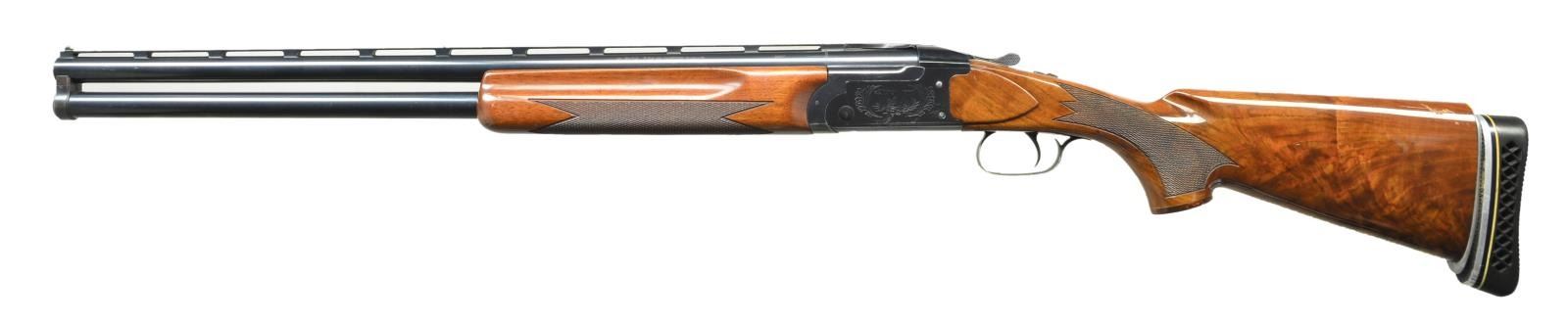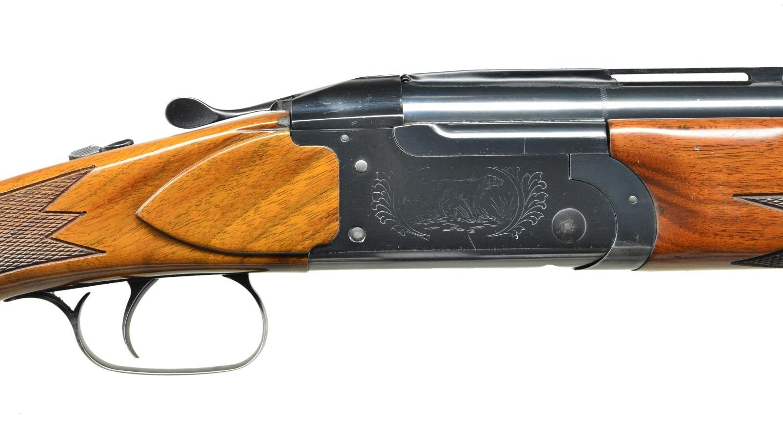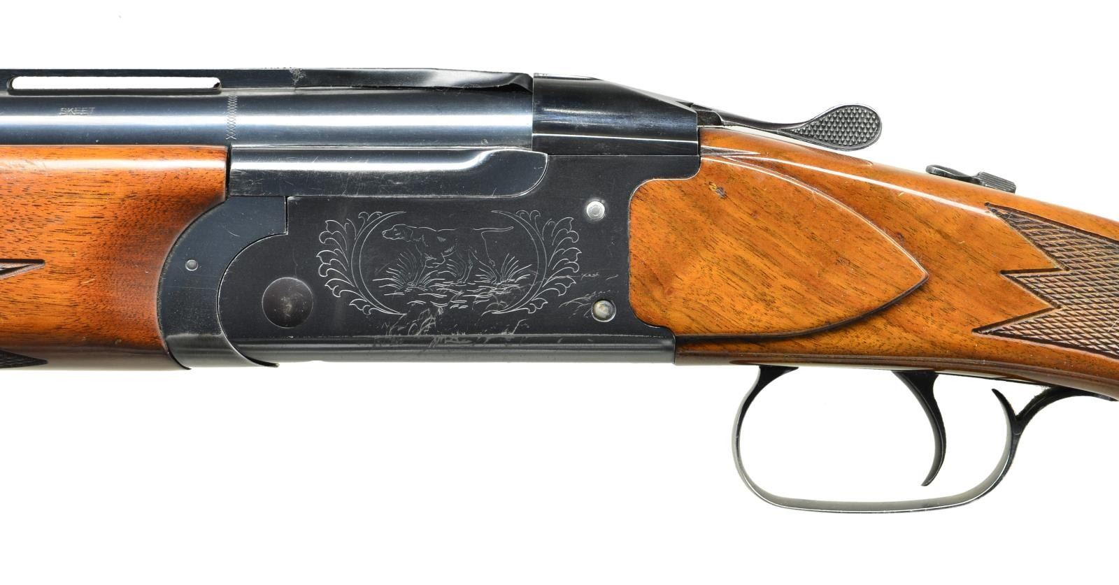 SUBGAUGE TUBE SET AND CASE. Cal. 12 ga. S# 27171. The 25 3/8" monobloc bbls. fitted with slightly raised ventilated rib has Remington nomenclature, gauge & choke information stamped on in various places, mostly on top brl. Bottom of monobloc is stamped with serial number. Blued, low profile Model 32 type action features toggling safety and trigger selector on top tang. Sides of action have rolled on scroll engraving surrounding dog scenes: pointer on left, setter on right. Bottom of action is stamped with make, model & serial number. Plastic capped pistol grip buttstock made of nicely crotch figured American walnut measures 14 3/4" over adjustable "Morgan" type trap pad. Point pattern checkering is at grip. Matching checkered target forend has sliding release unique to this model. UNATTACHED ACCESSORIES: gun is housed in black plastic SKB marked case lined in green fur. Top compartment contains Briley tube set for 20, 28, and .410. Bottom compartment has installation plug. All brls. and tubes are marked "SKEET". CONDITION: very good to fine. Brls. retaining approx. 90% original blue with scattering of light marks and silvering of sharp edges. Action retains about 80% original blue with silvering on sharp edges and with a fair number of scratches on left side toward bottom as well as browning and silvering at front of trigger guard. Stocks retain over 90% original varnish with a scattering of marks. Bores are bright and shiny. Action is tight. Mechanically good. Case is fine, showing some handling. Interior cloth with rubs and compressions. Tube set shows considerable use. (22-3746/MGM). CURIO. $1,500-2,500.