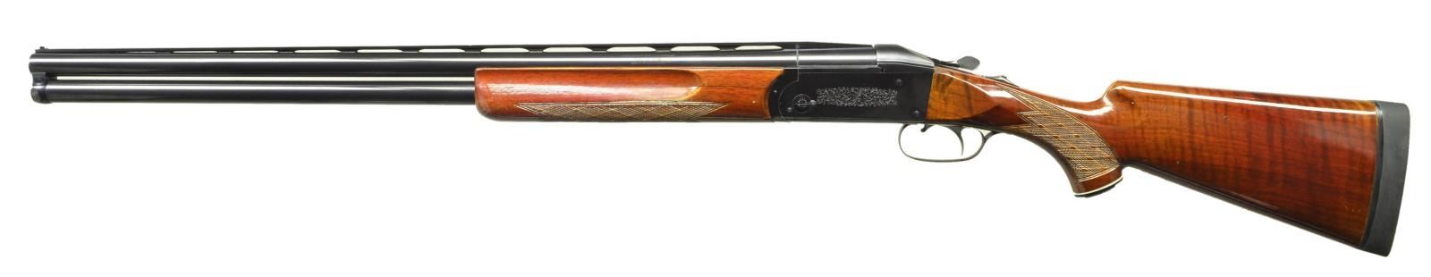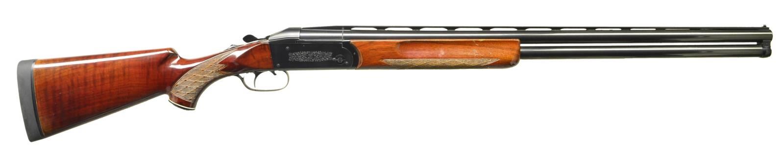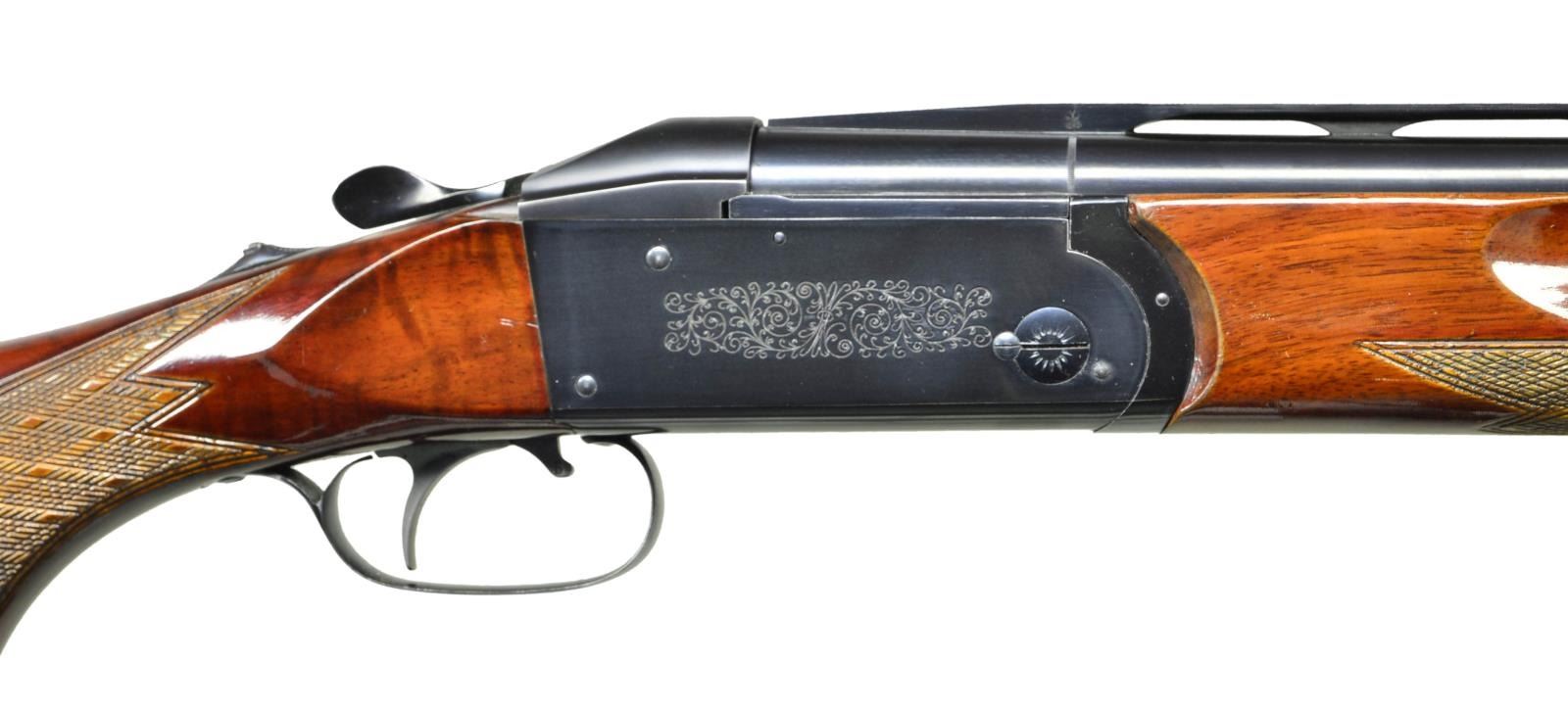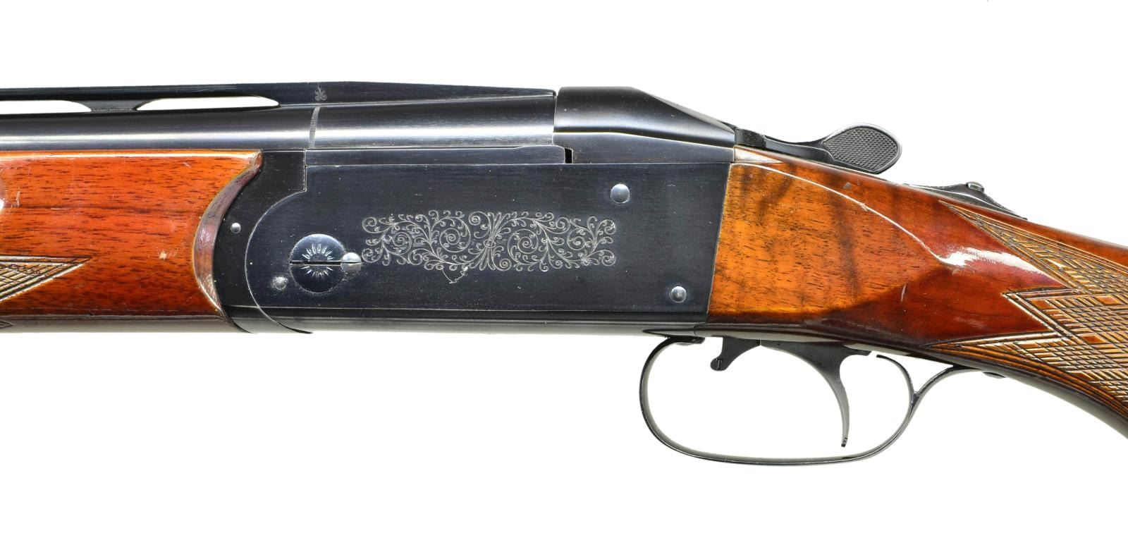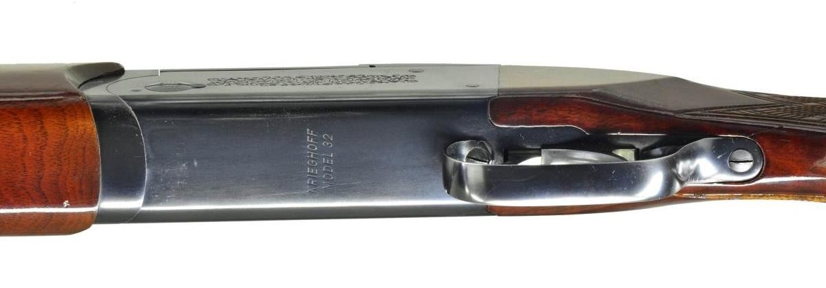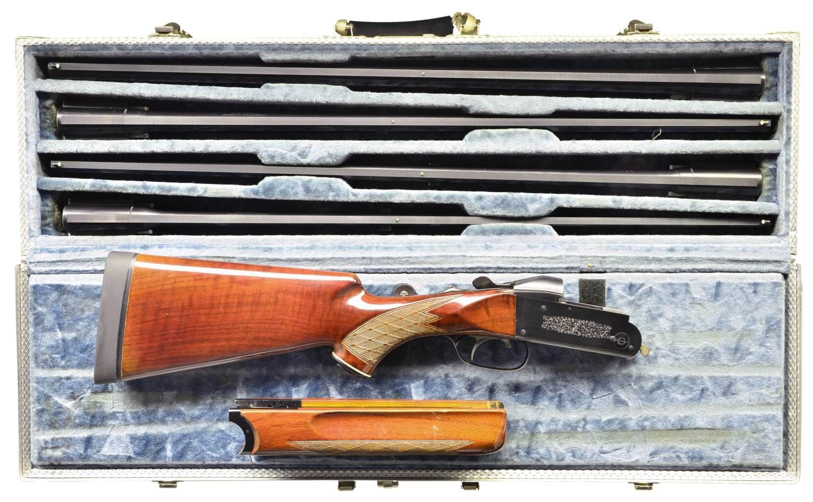 Cal. 410/28/20/12 Ga., all 2 3/4". S# 8605. All four 28" bbl. sets choked SKEET and SKEET are fitted with slightly raised ventilated ribs have bottoms of monoblocs stamped with serial number and 1972 Ulm Nitro proofs. Maker's information, model and chambers are on lefts sides of top bbls. Blued Model 32 type low profile O/U action features immovable safety, and selective single trigger. Action is engraved with a 3" spray of simple scroll on sides, make and model are on bottom. Plastic capped pistol grip stock of nicely fiddle figured red tone European walnut measures 14 1/2" over black "Kick-eez" pad. Skipline checkering is at grip. Matching target forend has Deeley type release. MEASUREMENTS: STOCK: DAH: 2 1/8". DAC: 1 3/8". LOP: 14 1/2" CAST: neutral. WEIGHT WITH 12 GA. BBLS.: 8 lb. 3 oz. UNATTACHED ACCESSORIES: gun and extra bbls. are housed in Nasco aluminom case lined in blue velvet. Case contains Krieghoff international patch, Alan wrenches and a key. CONDITION: very fine, original. Bbls. and action retaining nearly all of what appears to be their original blued finish with only a hint of sharp edge wear and silvering at rear of trigger guard. Stocks retain nearly all of their original varnish finish which shows light crazing overall and has a few scattered marks. Pad is relatively new and could fit better. Bores are bright and shiny. Action is tight. Mechanically fine. Case shows some wear and bumps. Interior cloth is good. (22-3749/MGM). CURIO. $4,500-6,500.