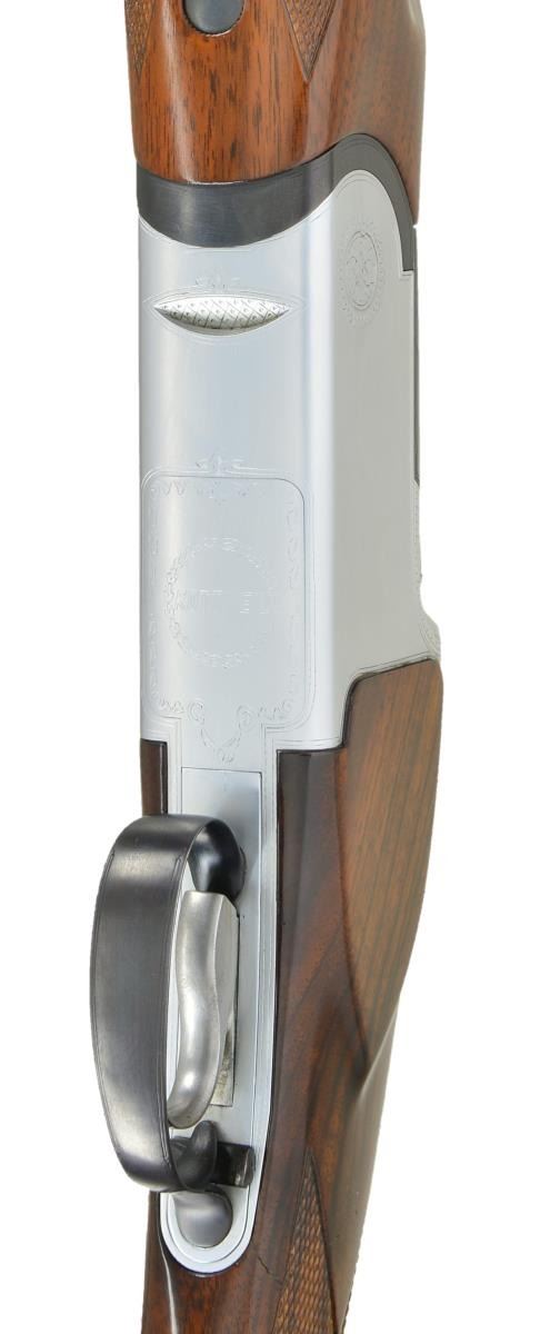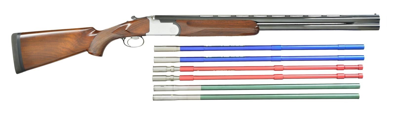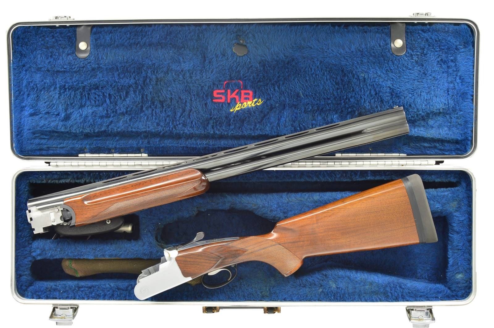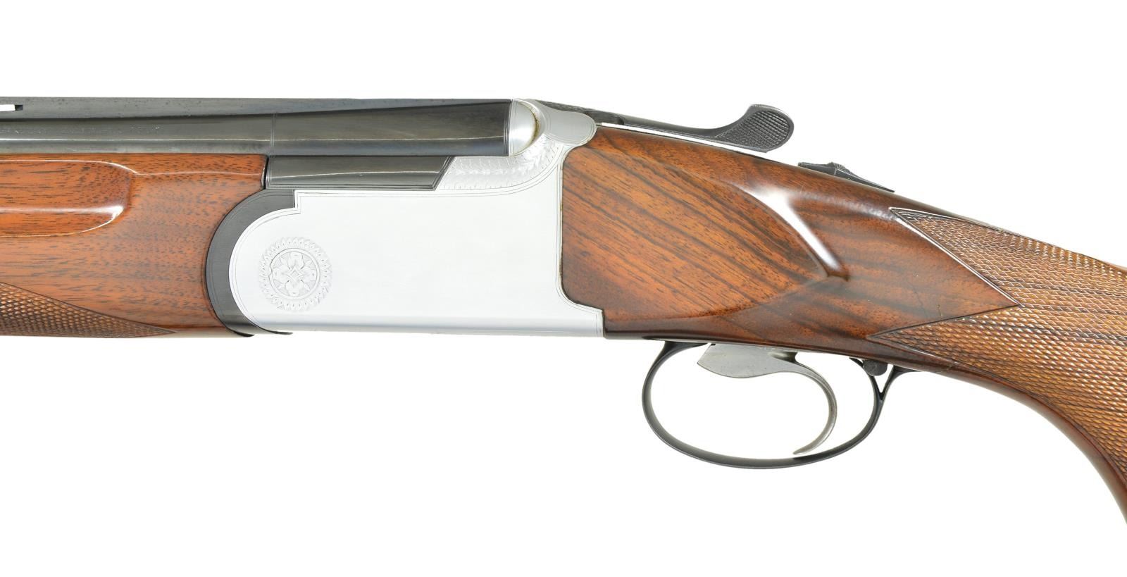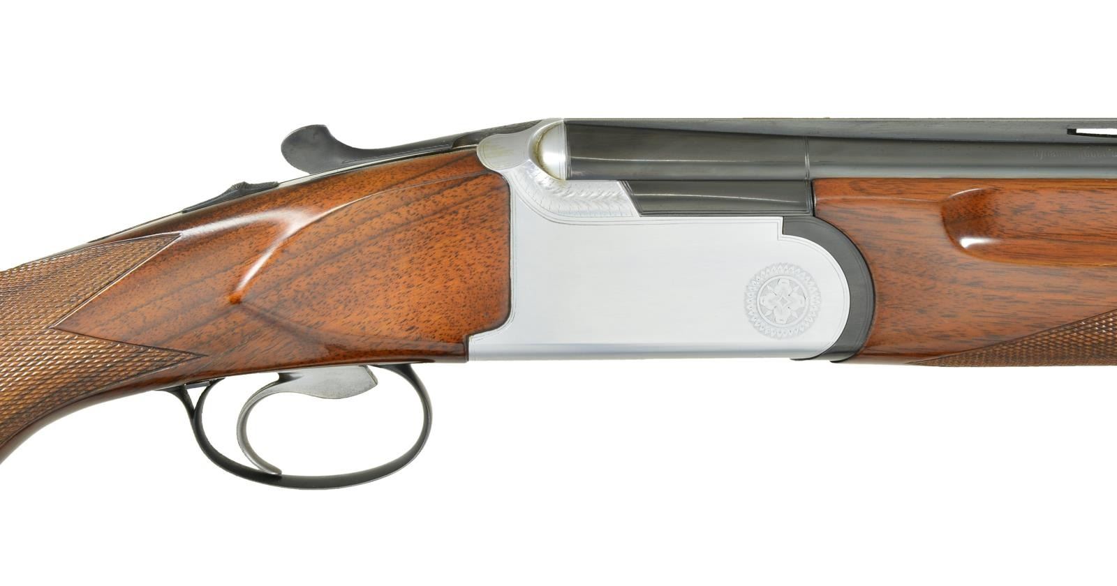 BRILEY TUBE SET & CARRYING CASE. Cal. 12 Ga. 2 3/4". S# 76563. Bbls. 26 3/4" w/ fixed skeet chokes are fitted w/ matted ventilated rib & have no side ribs. Model, importer & "Made in Italy" are on top bbl. either side of rib. Bbl. flats are stamped w/ 1984 Italian nitro-proofs for 2 3/4" chambers. Coin finished low profile action is fitted w/ single selective trigger in removable trigger group. Action is engraved w/ line borders & a few bits of scroll w/ "ROTTWEIL" on the bottom. Relatively plain European walnut pistol grip stock measures 14 5/8" over black Decelerator pad on 1/4" spacer. Point pattern checkering is at grip. Matching target forend has Deeley type release. UNATTACHED ACCESSORIES: gun is housed in black plastic "SKB Sports" case w/ Winchester Ammunition circular label on top. Owner's name is on plate at front. Interior is lined in blue fur. Top compartment contains Briley 3 ga. tube set. Divider is embroidered "SKB Sports". Bottom compartment contains tube installation tools & wrenches for choke tubes (not present). Case also contains a black "Old English" pad. CONDITION: fine to very fine. Bbls. retaining over 95% blue w/ sharp edge wear. Action retains nearly all of its coin finish, possibly cleaned up. Stocks retain most of a shiny new varnish. Pad is relatively new. There is a 1 1/2" stress crack on left side action area running from rear trigger guard up toward top which flexes slightly. Case is fine w/ scratches & rubs. Interior cloth is soiled. Tubes are generally fine. (22-2106/MGM). MODERN. $1,200-1,800.