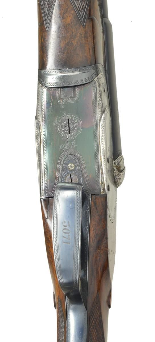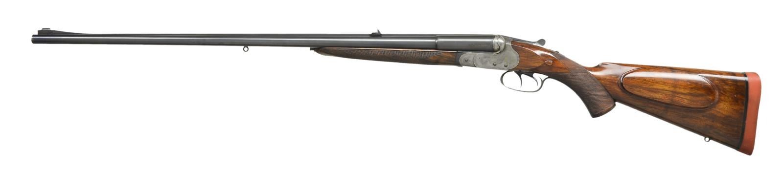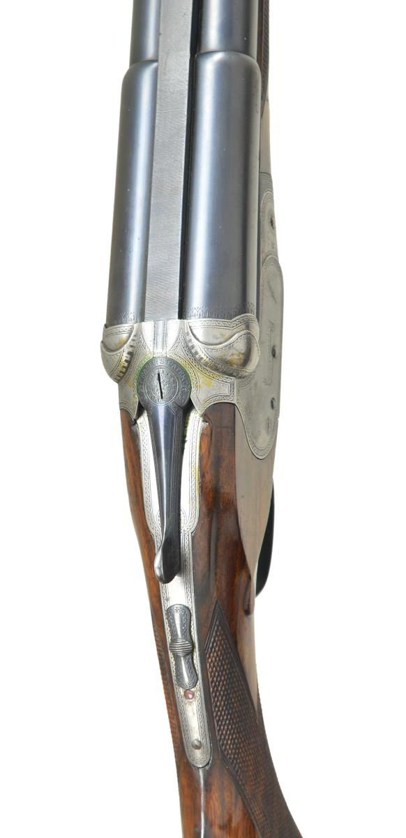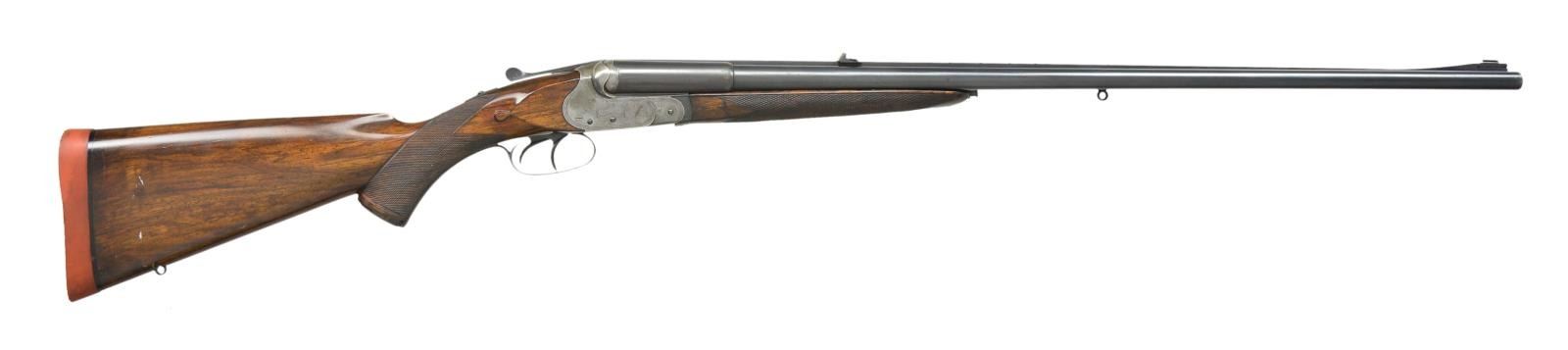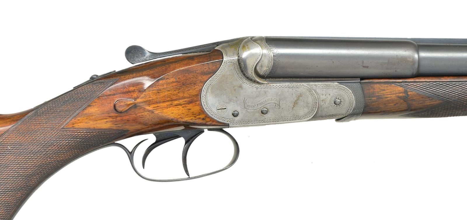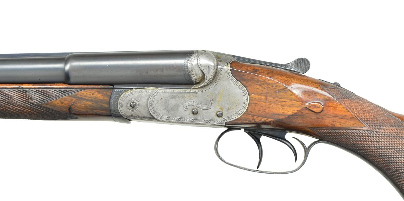 Cal. 450/400, 3 1/4" Nitro Express. S# 3071. (CA 1899). The 28" chopper lump barrels have thick reinforced breech sections and are fitted with full length matted rib, holding one standing, two folding nested leaf express rear sight and gold bead front in raised portion of rib. Unmatted area in front of express sight is engraved "Danl. Frasier & Co." "Gun & Rifle Manufacturers" "4 Leith St Terrace Edinburgh". Barrel flats are stamped with London nitro proofs for 53 grains cordite and 400 grain bullet. "53" is crossed out and "60" newly stamped. Front part is also stamped with Birmingham nitro proofs for 450-400 3 1/4 at 16.5 tons. A sling eye is soldered to bottom rib. Case hardened boxlock action has distinctive swell to back line and features non automatic safety, pivoting third fastener that engages rib extension, side clips, bushed strikers and double triggers. Action is engraved with Celtic knot borders. "DANl FRASER & Co." is on scrolled ribbon on each side. S# is on trigger guard bow. Tang extends to horn grip cap. Well streaked European walnut, capped pistol grip buttstock measures 15" over Silver type pad and features long slim shadow line right hand cheek piece, drop points and point pattern checkering. A sling eye is set in to toeline. Matching splinter forend has Anson release. MEASUREMENTS: STOCK: DAH: 2 5/8". DAC: 1 15/16". CAST: neutral. LOP: 15" WEIGHT: 9 lb. 15 oz. CONDITION: good as mostly refinished, barrels retaining over 90% reblue with some later splotches and thinning. Action retains traces of original case color and is mostly silver to gray. Other parts reblued over some fairly deep pitting on floorplate. Stocks have old oil refinish with many subsequent marks, checkering recut. Work is a bit haphazard. Bores are good to fine, slightly dark in grooves with some erosion at throats. Action is tight, barrels on face. (22-5852/MGM). CURIO. $4,500-6,500.
