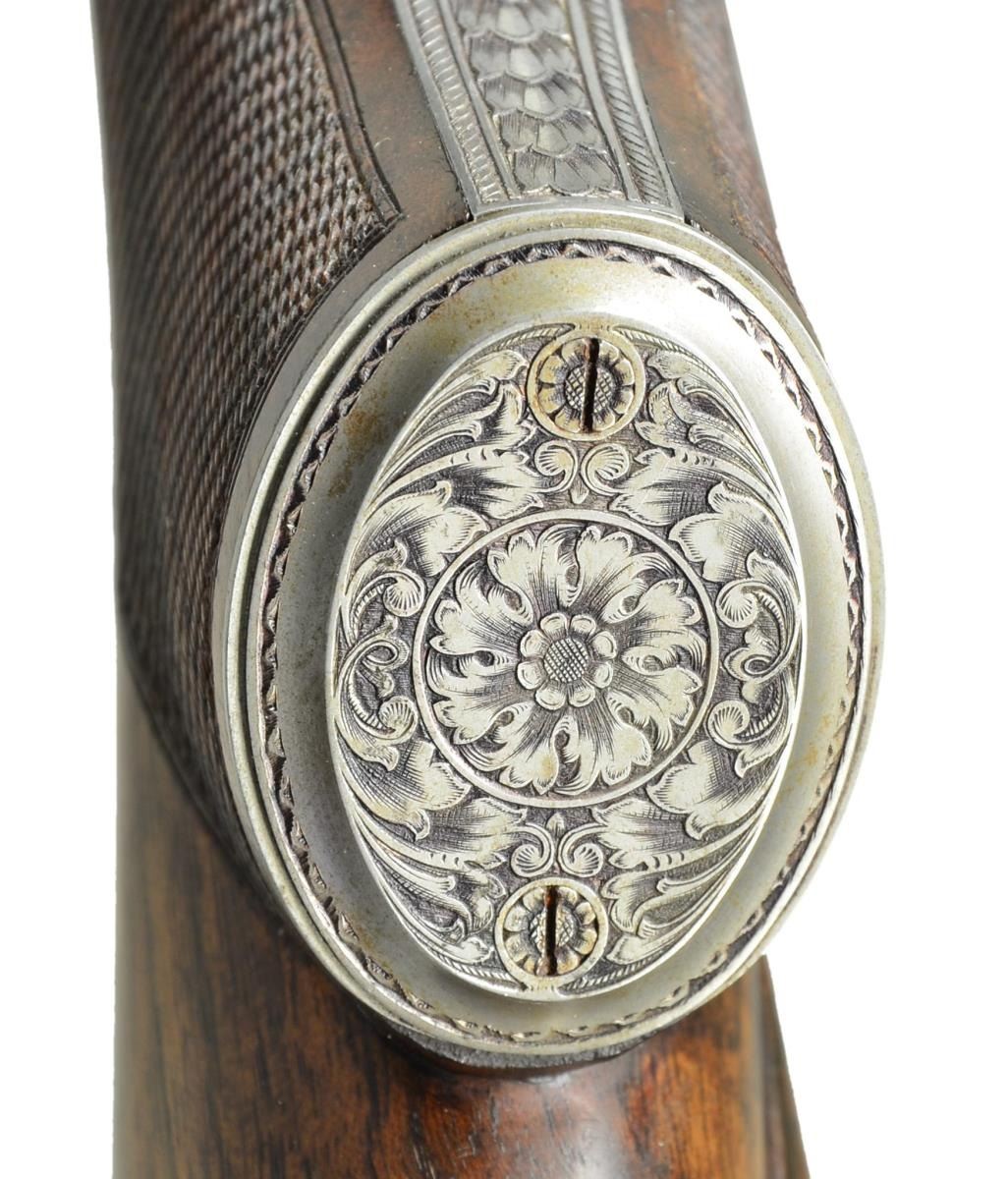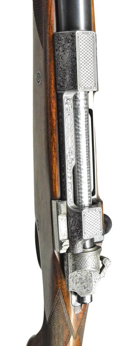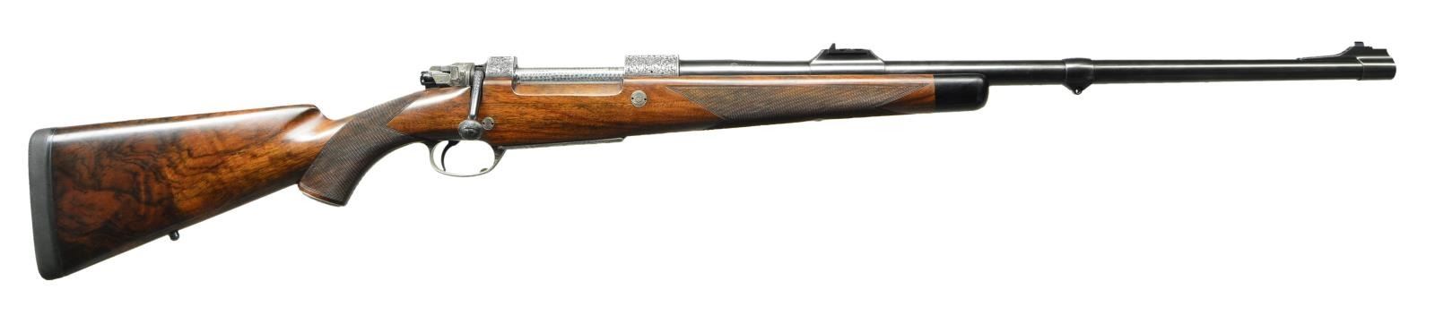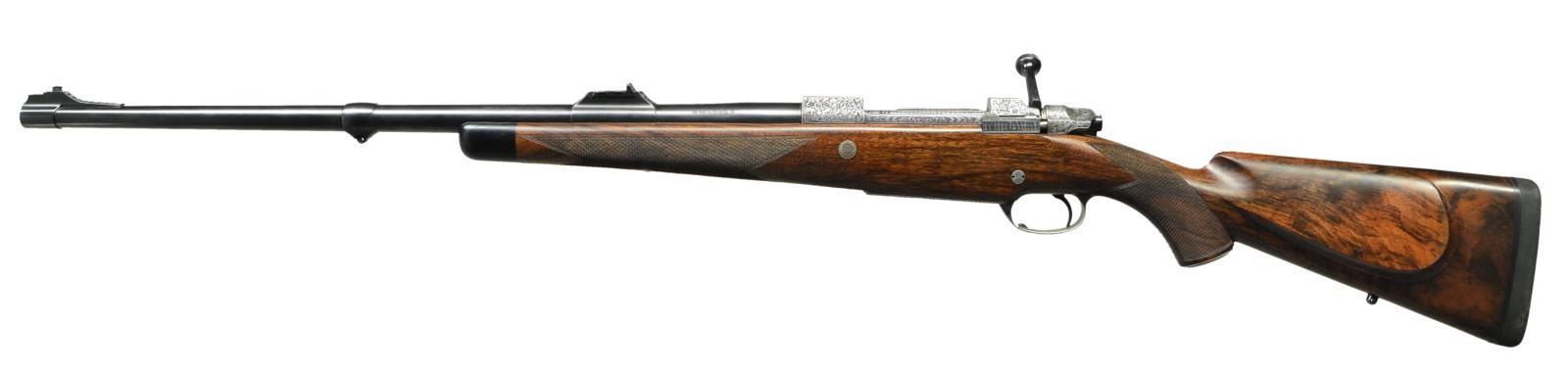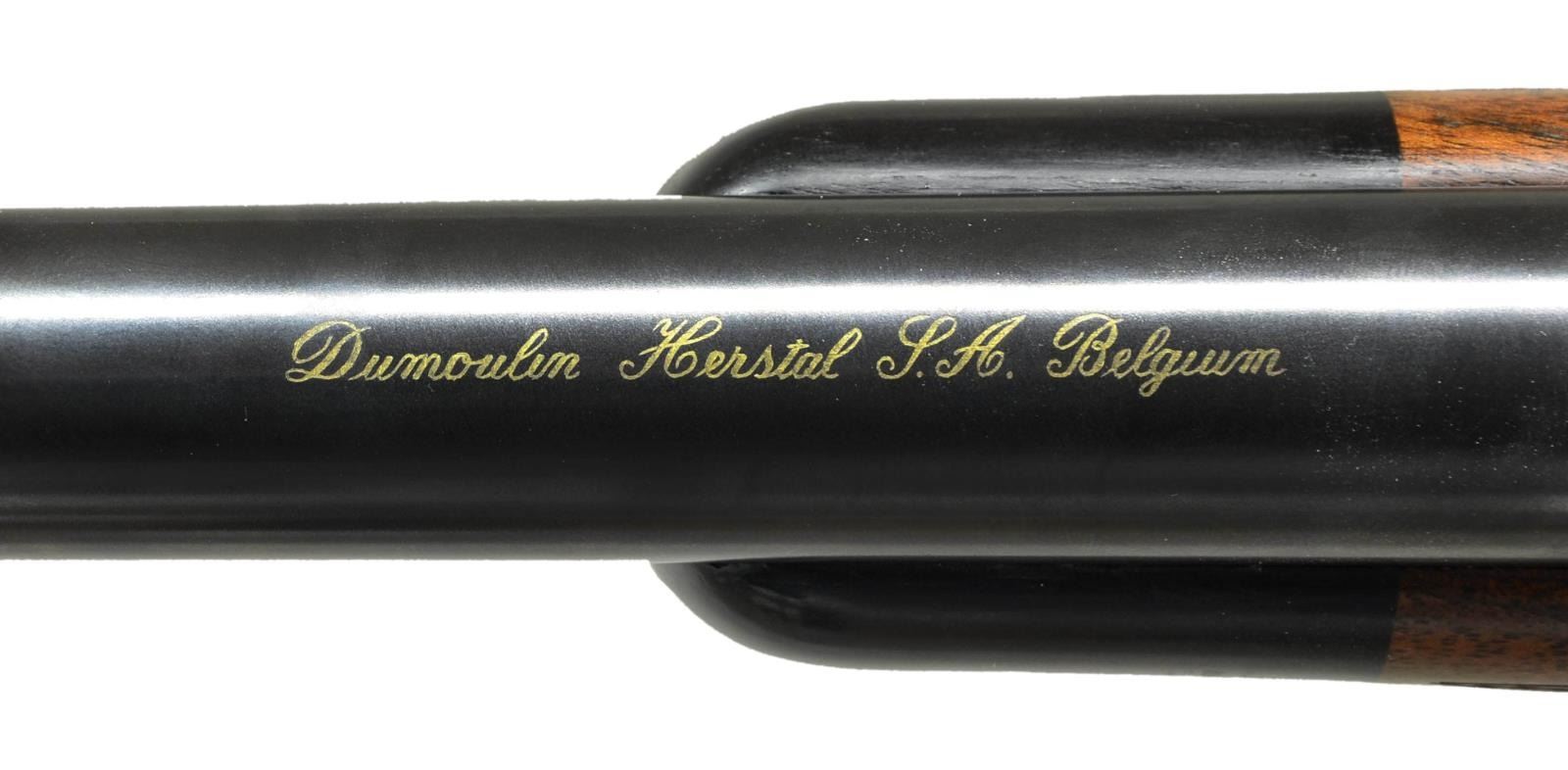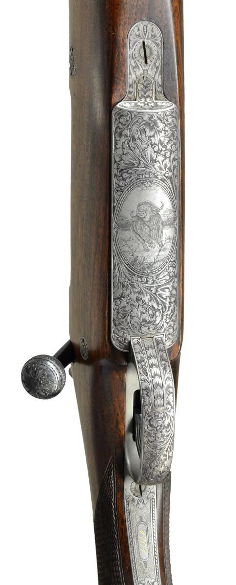 FINE ENGRAVING AND GAME SCENE BY B. BARA. Cal. 416 Rigby. S# 1701. E. Domoulin was one of the first makers to recreate the classic model 98 Mauser magnum action starting around 1986. They build a little over one hundred guns a year. Some, like this rifle, are beautifully finished and engraved. This rifle has 26" heavy weight sporter barrel fitted with one standing two folding leaf rear sight with gold lines in sleeved on island base; sleeved on sling eye and sleeved on front sight ramp holding gold bead front sight with flip over white night bead. Top of barrel is gold inlaid "Doumoulin Herstal S. A. Belgium". Caliber is in gold behind rear sight base. Belgian proofs are on left side. A2000 Dumoulin double square magnum Mauser action is fitted with engine turned bolt with turned down straight handle with knurled knob. Low profile bolt shroud is fitted with M70 type safety (right side is inlaid "S" "F" in gold). Drop box bottom metal with extended bottom tang has hinged floor plate with release button in trigger guard bow. Action, bolt shroud and bottom metal are very finely engraved, with near full coverage truly exceptional, open shaded scroll with acanthus and some floral highlights. The beauty of this engraving can not be overstated. On floorplate it surrounds oval bulino scene of Cape buffalo in open savanna is running toward viewer changing direction in mid stride. Engraver's signature "B. Bara" is in rectangular device on top of left side wall. Classically styled pistol grip stock of very finely marbled and lightly figured European walnut measures 14 7/8" over black "Decelerator" pad. Stock features steel grip cap engraved to match remainder of rifle; swept shadow line right hand cheekpiece; ebony forend tip; two engraved recoil bolts; another recoil lug on barrel bedded with screw from bottom of forend and sling eye on toeline. Closely spaced point pattern checkering with mullered borders is at grip and around forend. CONDITION: exceptionally fine, close to "as new", with only a few handling marks in all fine factory finishes; most notably a small group of three or four minor marks in front of grip checkering on right side. Bores are bright and shiny. Mechanically crisp. A beautiful classic big game rifle. (23-422/MGM). MODERN. $15,000-22,500.