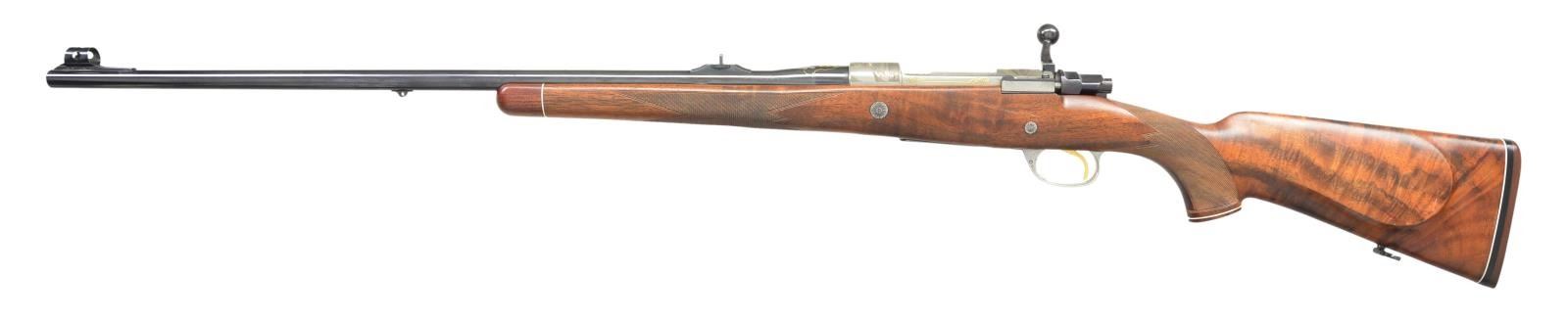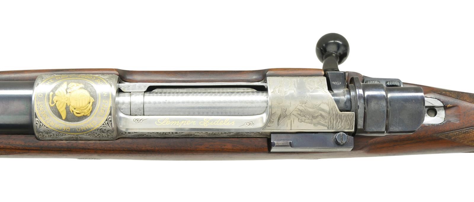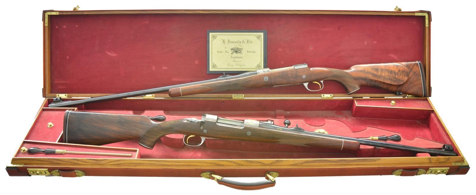2) Cal. 30-06. S# 1/100. The 24" medium weight barrel fitted with one standing and one folding leaf rear sight in island base and short front ramp holding silver bead front with protector is gold inlaid "H. DUMOULIN & FILS-MILMORT-LIEGE-MADE IN BELGIUM" on top. Right side is gold inlaid "1/100". Coin finished FN standard length action is fitted with gold plated trigger and bottom metal with hinged floorplate. Action and bottom metal are engraved with near full coverage, large open shaded scroll which surrounds bulino scenes celebrating the activities of the U.S. Marine Corps. during WWII. Top of receiver bridge depicts the raising of the U.S. Flag on Mt. Suribachi, Iwo Jima. Scene on bottom depicts three Marines storming a beach head with the mountain in background. Receiver ring is emblazoned with the Marine Corp. insignia in relief gold inlay surrounded by "DEPT OF THE NAVY" "UNITED STATES MARINE CORPS." within gold lines. Top of left sidewall is gold inlaid "Semper Fidelis". Engraver's signature "P. Vincent" is on horizon at right of beach scene. Bolt body is engined turned as is cartridge follower. Pistol grip stock of dark marbled and lightly figured European walnut measures 14 5/8" over thin "Old English" rifle pad with white line. Stock features swept right hand cheekpiece, two recoil bolts, rosewood forend tip and grip cap with white lines. Point pattern checkering at grip and around forend is exceptionally well cut, borders are bead carved. (22-5822/MGM). UNATTACHED ACCESSORIES: guns are housed in tan leather full length case with leather corners and tan canvas outer cover by Huey (1283). Interior is lined in burgundy cloth and has Dumoulin label in lid. Bottom compartment is French fitted for both rifles, their bolts, two turn screws, handle end of three piece cleaning rod, round brass oil bottle and brass striker bottle. There are two covered compartments; one holding three detachable sling loops, the other Huey case info, a key and another auction listing with attribution but no back up. CONDITION BOTH: very fine close to new, showing some storage marks and slight rusting on bright metal. Stocks have some scattered marks. Rifles appear to be unfired. Case is exceptionally fine, leather excellent as protected by outer cover which has some rubs, interior dusty with some compressions, accessories fine. (22-5821 & 22-5822/MGM). BOTH MODERN. $12,000-18,000.