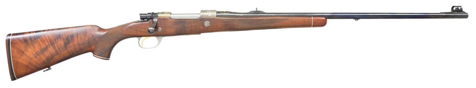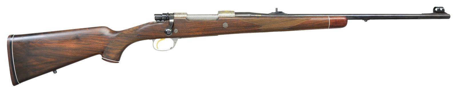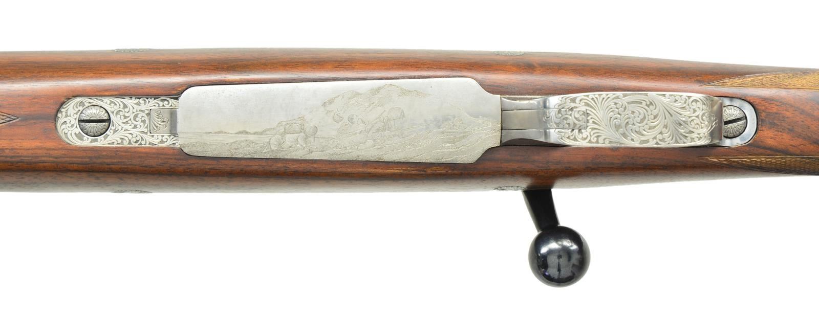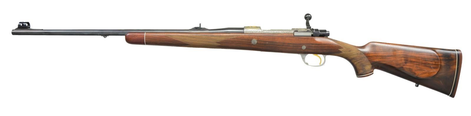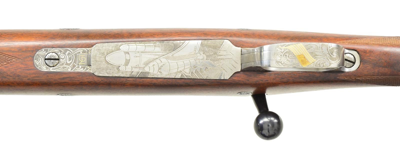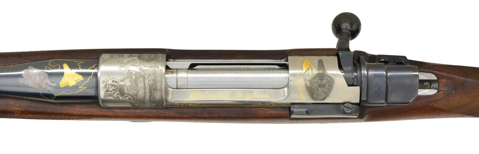 1) Cal. 300 Win. Mag. S# 1/100. The 28" tapered round barrel is fitted with one standing leaf rear sight in island base and silver bead front in short ramp having sight protector. Top of barrel is engraved with Dumoulin name and address along with "MADE IN BELGIUM". Barrel shank is gold and silver inlaid with scene of astronaut on EVA with space shuttle in gold in background. The gold wire outline of North America is in distance. Right is also gold inlaid "1/100". FN action with gold plated trigger and hinged floorplate is coin finished. Bolt body is engine turned. Receiver ring is engraved with astronaut raising U.S. flag on the moon, lunar modular in background, the Earth is in the distance. Receiver ring has a gold and silver inlaid depiction of the space shuttle after blast off, shuttle is in silver, vapor trail is in gold. Area above scene is gold inlaid "SPACE LAB MISSION 1". Raised and scrolled gold wire inlay is on right of bridge and left receiver wall, top of wall is gold inlaid "Dedicated to NASA". Shaded scroll on bottom metal offsets scene of space shuttle blasting off on floorplate. A gold inlaid American flag is on trigger guard bow. No engraver signature is found. Pistol grip stock of well figured Claro walnut measures 14 1/2" over rifle pad with white line. Stock features swept right hand cheekpiece, two recoil bolts, rosewood forend tip and grip cap with white lines. Point pattern checkering at grip and around forend is exceptionally well cut, borders are bead carved. (22-5821/MGM).