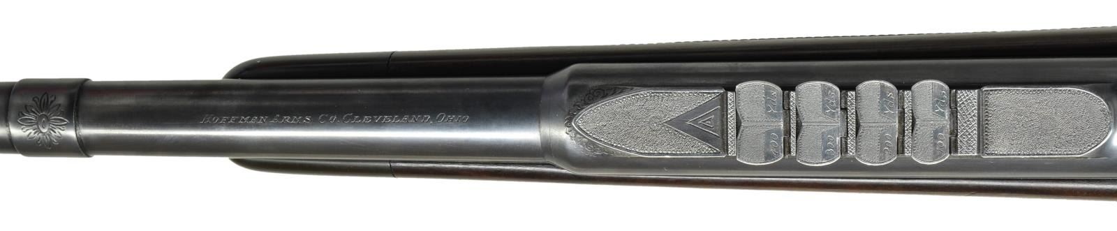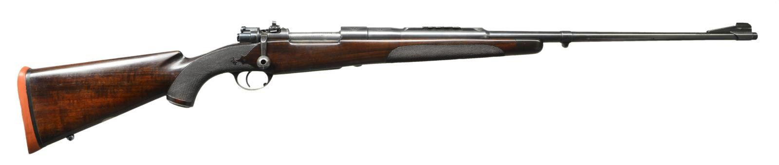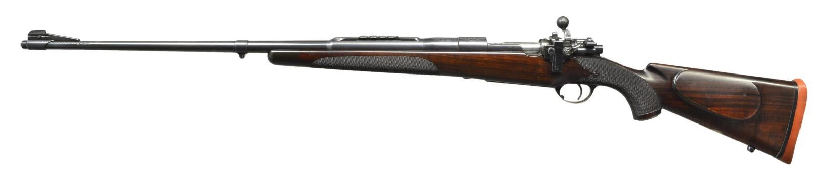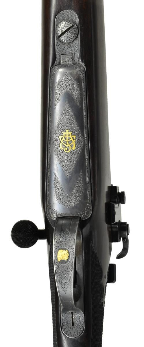 RIFLE. Cal. 275 H&H Magnum. S# 1142. This very interesting rifle is engraved "Hoffman Arms Co, Cleveland, Ohio" on top of its 26 1/2" barrel, no S# is given. The company moved to Oklahoma in 1925. The bottom of the barrel (wood removed) is stamped with number "3" which also appears on the action. Barrel, action, bolt and bottom metal are all stamped with the number "1142". Michael Petrov in "Custom Gunmakers of the 20th Century Volume Two" reports that, one of four known serial number "3" Hoffman rifles is a 275 H&H. He speculates that some of these low number rifles were made for showrooms and traveling salesman and were not numbered in the usual customers range. The name "J. A. Cook" is also stamped on bottom of barrel. (A salesman ?). 1142 is possibly a Holland & Holland number. Most Hoffman rifle barrels and actions were procured directly from England. Mostly from W & C Scott who assembled most of Holland's barrels and actions. This rifle in a Holland caliber has many Holland style features. The barrel is fitted with large and long, sleeved on quarter rib holding four folding leaf express sight. Sling eye and front sight ramp are also sleeved on. Standard length action is fitted with Lyman 35 bolt stop sight which appears to be original. Bolt has damascening on polished body, handle is cranked in usual H&H fashion, hollowed knob has two panels of checkering on bottom. Double pull trigger is retained. Dropbox bottom metal has hinged floorplate retained by button in bow. Front guard screw has large head slotted for coin in typical H&H takedown style. Barrel is engraved with lines of scroll and with a few scroll flourishes around front sight base. Scroll matching rear of barrel is on receiver ring. Bottom metal is engraved with about 60% coverage, typical Kornbrath shaded scroll which surrounds the gold monogram "AJC" (A.J. Cook) on center of floorplate. The head of a grizzly bear looking over its right shoulder is in gold semi relief on tapered trigger guard bow. Capped pistol grip stock of lightly figured, dense European walnut measures 13 3/4" over squished Silver pad and features H&H style shadowline right hand checkpiece, engraved grip cap with trap, horn forend tip, sling loop and vacant silver oval on toeline. Well cut borderless checkering has nascent fleur de lis intrusions into pattern. There is a silver rhombus at top of grip with central stamp of a five pointed star. CONDTION: very fine, retains what appears to be nearly all factory finishes, with a few light marks on barrel & on action, bolt handle and bottom metal show a goodly amount of wear and retain about 60% of their original blue. There are also a few minor marks in stock, checkering is dark with light wear. Bore is good, mostly shiny, shows some frosting and erosion at throat. (22-5787/MGM). CURIO. $8,000-15,000.