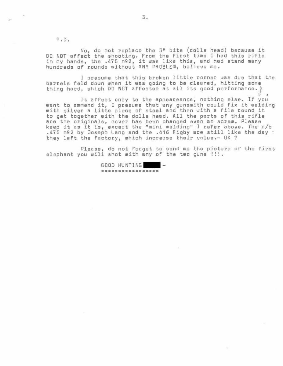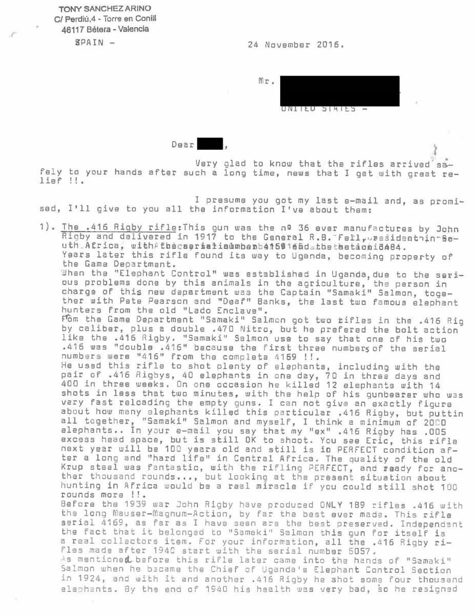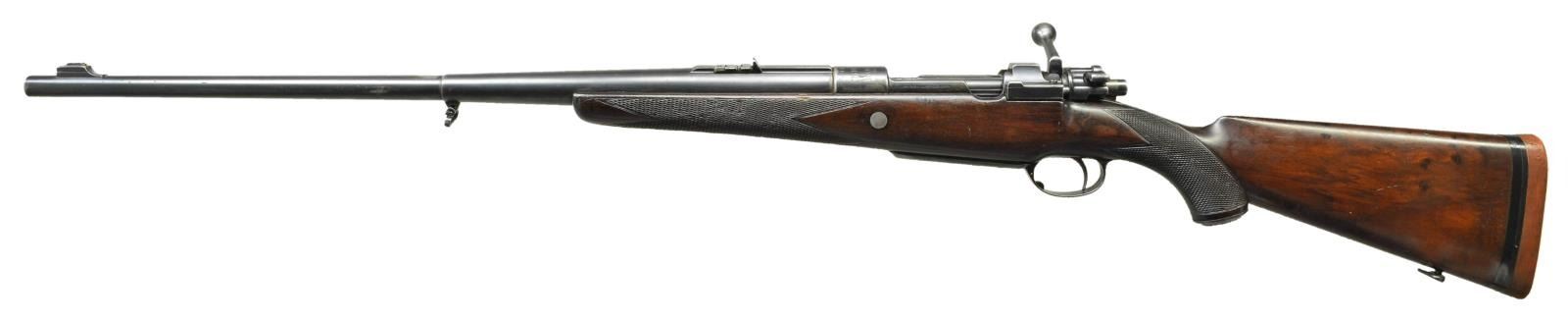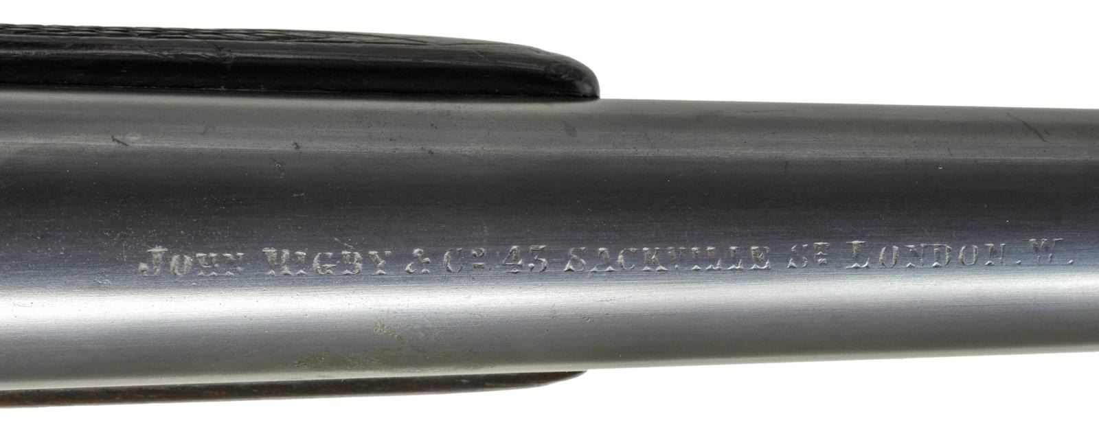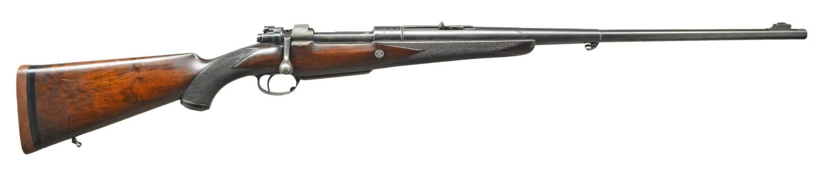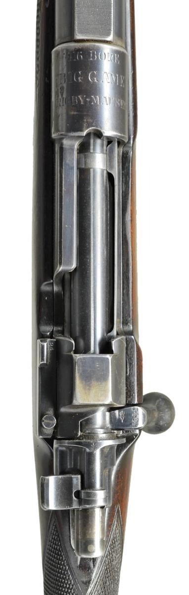 SQUARE BRIDGE MAUSER "BIG GAME" BOLT ACTION RIFLE ONCE THE PROPERTY OF TONY SANCHEZ ARINO. Cal. 416 Rigby. S# 4169 (Rigby) (CA 1913), S# 53484 Mauser (on bottom of action where covered by wood). This iconic rifle has 26" barrel with very heavy breech which tapers with a step to muzzle. Rear is fitted with integral serrated quarter rib holding one standing, two folding leaf express sight with platinum lines marked for 1-2-300yds. Short front ramp holds gold bead, top of barrel is engraved "John Rigby & Co 43 SACKVILLE St. London. W.". A sling eye is soldered and let into bottom of barrel. Bottom of barrel where covered with wood is stamped with Mauser S# and London nitro proofs for 416 cartridge. Importers name and address are also on bottom of barrel behind sling eye (G&H). Magnum length square bridge Mauser action, specially made for the 416 Rigby, has Mauser info on side wall, Rigby # is stamped on left side of receiver ring below wood. Receiver ring is engraved with the classic info ".416 Bore" "BIG GAME" " RIGBY-MAUSER". A view proof is also present. Bolt with temper blued extractor has classic unaltered handle with pear shaped knob. Bolt shroud is fitted with flag safety, left side silver inlaid "S". Trigger is single stage. Bottom metal with matching Mauser # on rear is fitted with thick hinged floorplate with release button in trigger guard bow. Bow is stamped with Rigby #. Capped pistol grip stock of lightly figured dense European walnut measures 14 3/4" over Silver type pad on 1/4" hard rubber spacer. Stock features classic Rigby styling with relatively short forend without contrasting tip, recoil bolt, and steel trap grip cap (trap holding 2 spare front sights). Point pattern checkering with mullered borders is at grip and around forend. A sling loop is on toeline. UNATTACHED ACCESSORIES: PROVENANCE letter - MFG. 1917 delivered to General R. B. Fell S. Africa. Uganda Game Dept. given to "Samaki" Salmon, Chief of Elephant Control Section upon his retirement. Years later found at Rigby's London bought by David Marx sold to Tony Sanchez Arino in early 60's owned by him until he sold it to consignor. As outlined by letter dated 24 Nov 2016 from Tony Sanchez Arino in which he relates rifles history and estimated minimum 2000 elephant, many buffalo and 193 lion taken. CONDITION: very good to fine "as found", refinished long ago. Metal parts retaining about 70% of an old rust reblue, presently show considerable hand wear as associated with quite a few years in the field. Disassembly shows some old cleaned pitting, mostly on bottom metal below wood surface. Stock retains most of an old oil refinish over some marks and with a good scattering subsequent. Checkering probably recut at time of refinish shows later wear and dents. Bore is very good to fine, shiny, but showing light frosting throughout and considerable erosion at throat. (most likely retains good accuracy). Action is smooth, front sight bead bent, front sling loop attached to eye with loops of wire. (22-5837/MGM). CURIO. $10,000-20,000.