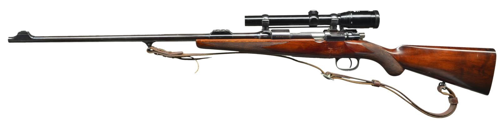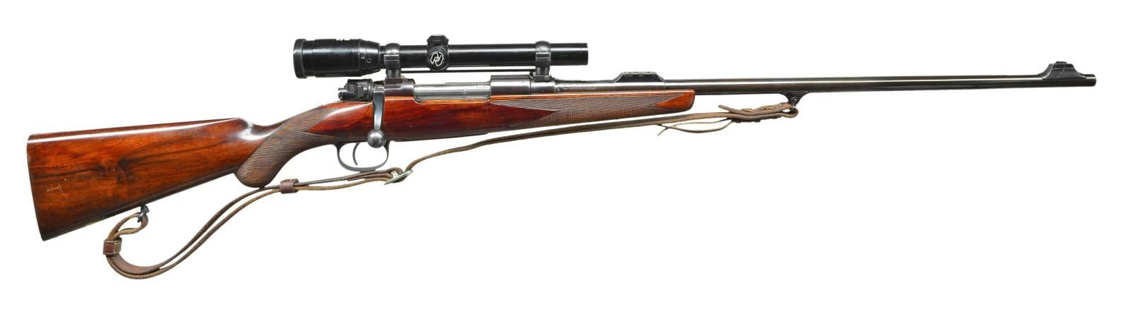 WITH SCOPE. Cal. 7x57. S# 4836 (CA 1922). The 25" tapered round barrel is fitted with a two folding leaf express rear sight in sleeved on island base. Silver bead front is in classic Rigby style ramp. A typical Rigby type sling eye is soldered on. Top of barrel is engraved "Sighted for Rigby Special High Velocity" "John Rigby & Co 43 Sackville St. London W." ".275 Bore Cartridges Pointed Bullet 140 Grains". Left rear is stamped with London nitro proofs for 31 grains of cordite and 173 grain bullet. A Rigby type front scope mount is dovetailed through. Model 98 Mauser large ring standard length action is stamped with S# and top of receiver ring is stippled. Rigby rear scope mount is soldered to bridge. Bolt body is polished and engine turned, handle has been lowered and slimmed. Shroud is fitted with model 70 type safety. Trigger is of standard double pull type. Bottom metal is of standard military type without lock screws, S# is on bow. Round knob pistol grip stock of lightly streaked European walnut measures 13 1/2" over checkered wood butt. Point pattern checkering is at grip and around forend. A sling loop and silver oval engraved "NEJ" are on toeline. Rifle is fitted with Zeiss Diavari-C 1.5-4.5X scope with three post reticle in custom rings. CONDITION: fine as refinished, metal parts retaining about 90% good quality reblue. Stock has a good scattering of marks and scratches in its renewed oil finish. Checkering re cut. Bore is shiny with strong rifling and some erosion at throat. Mechanically good, scope is good with a few marks on exterior, optically clear but with a flake at lower left of field. Bolt must be removed to install scope. Rifle is fitted with a brown leather sling by J.C. Ennis. (22-5858/MGM). CURIO. $5,500-7,500.